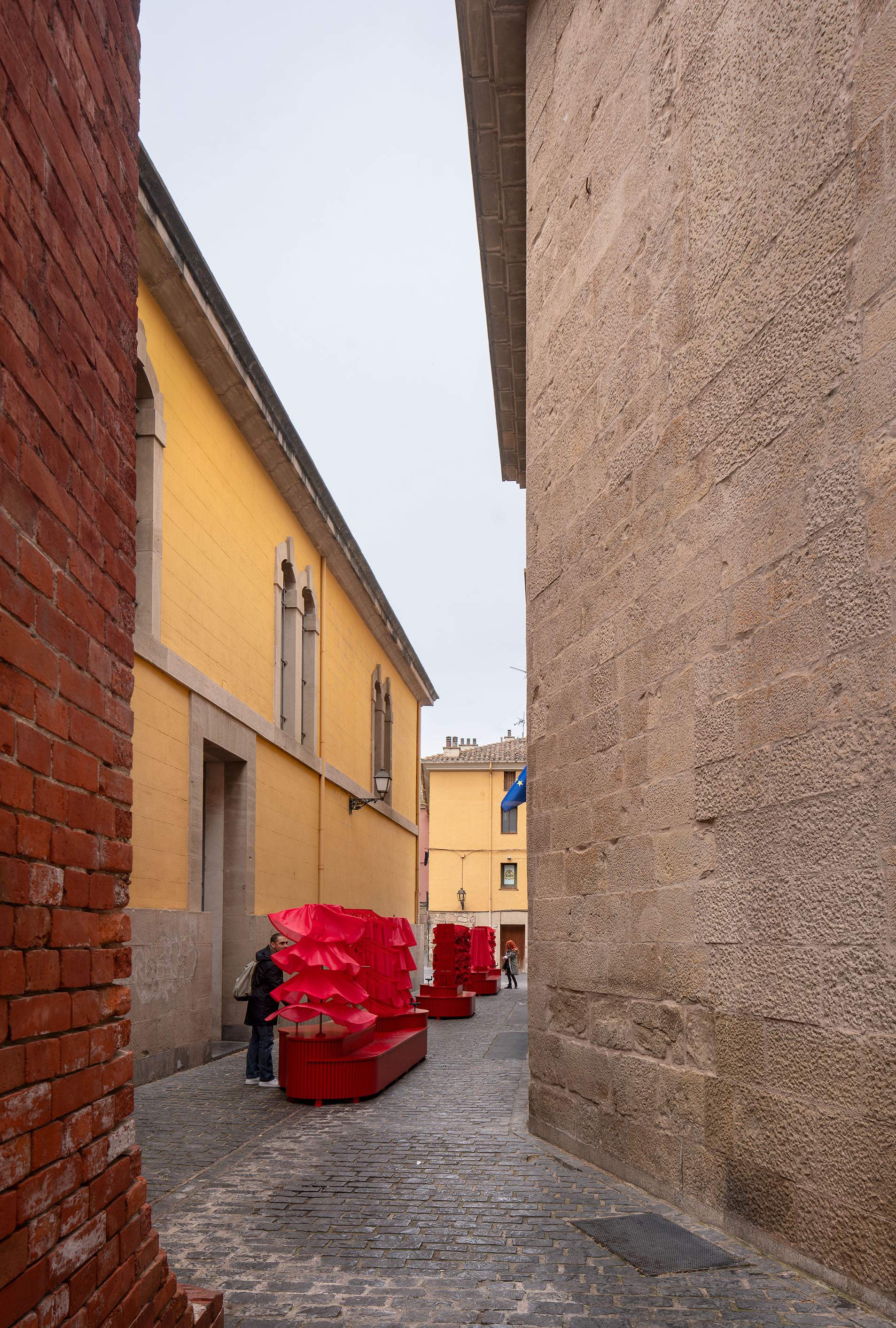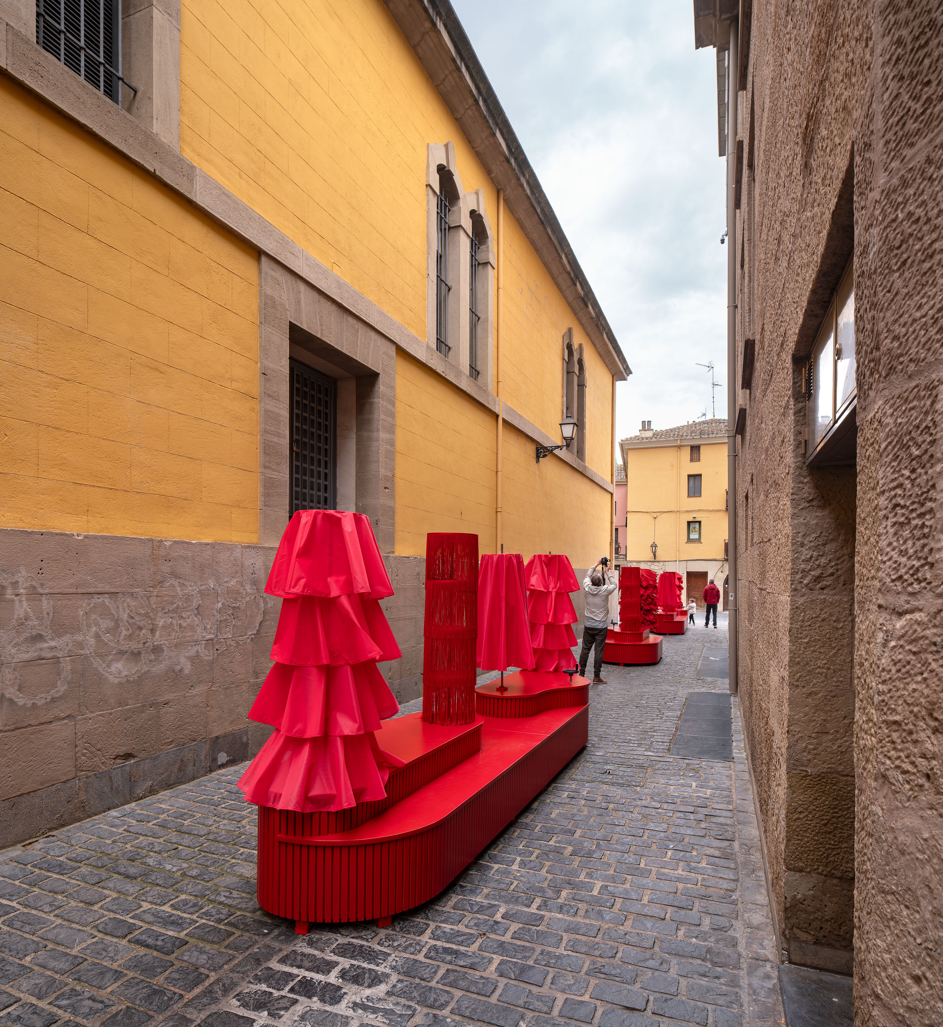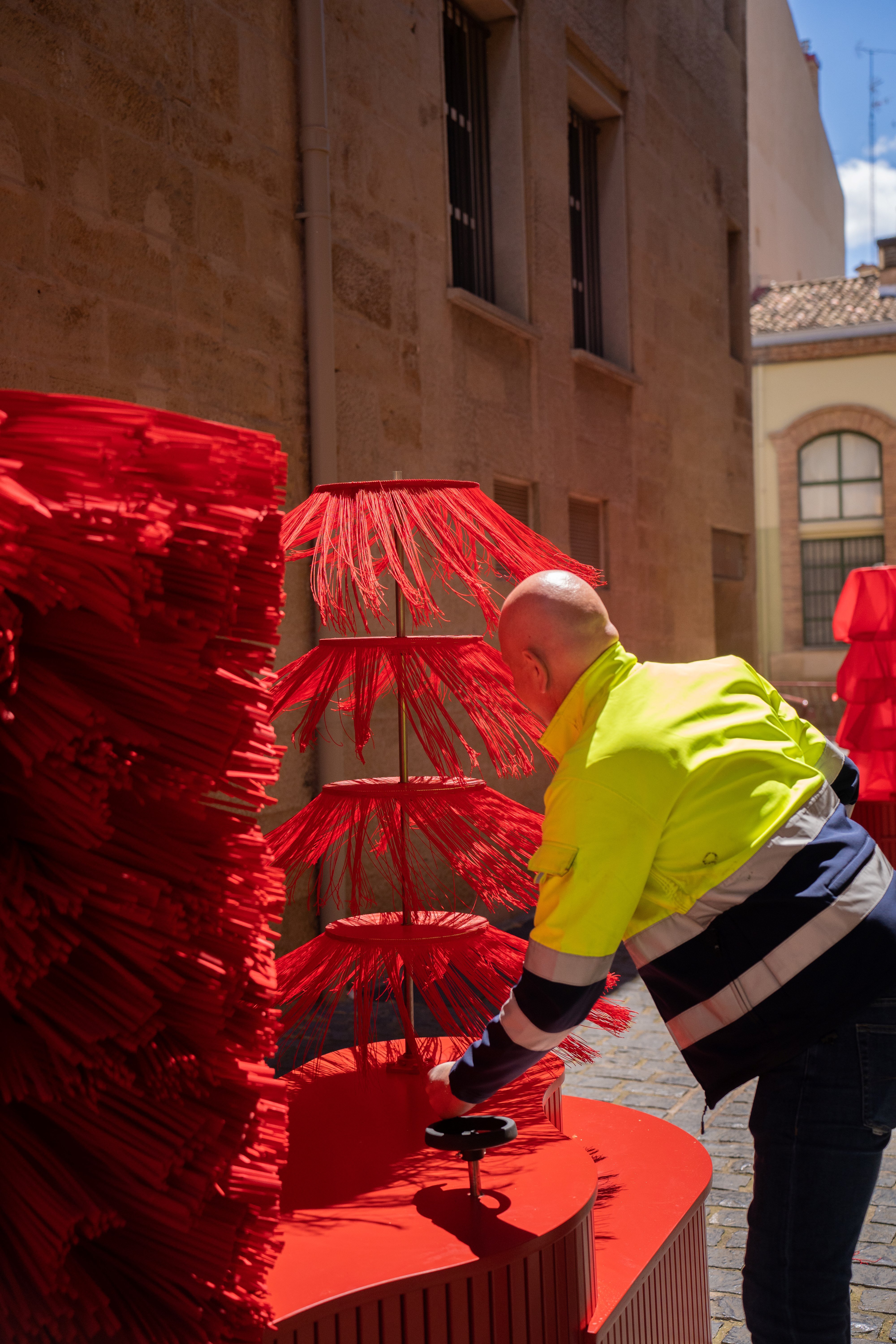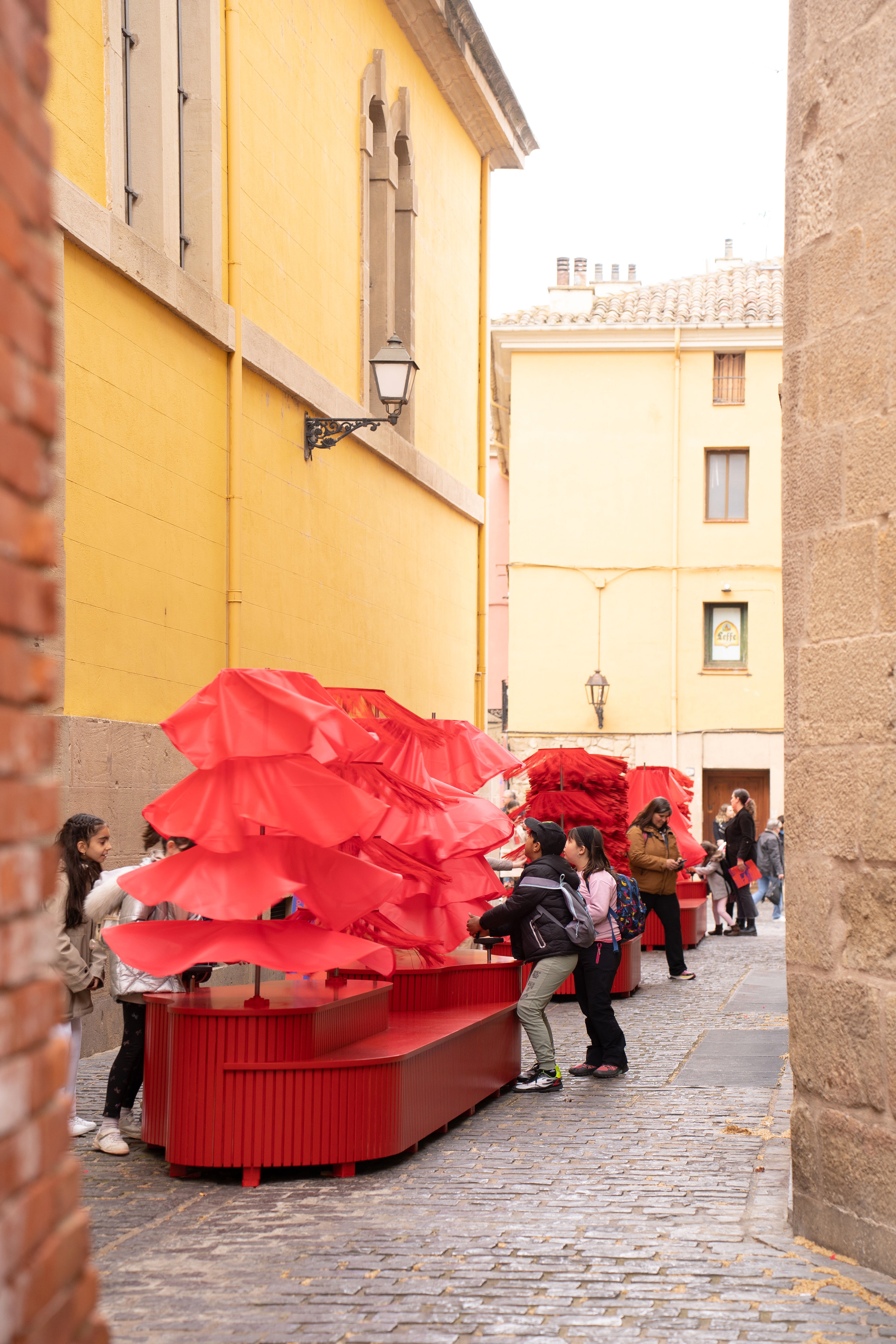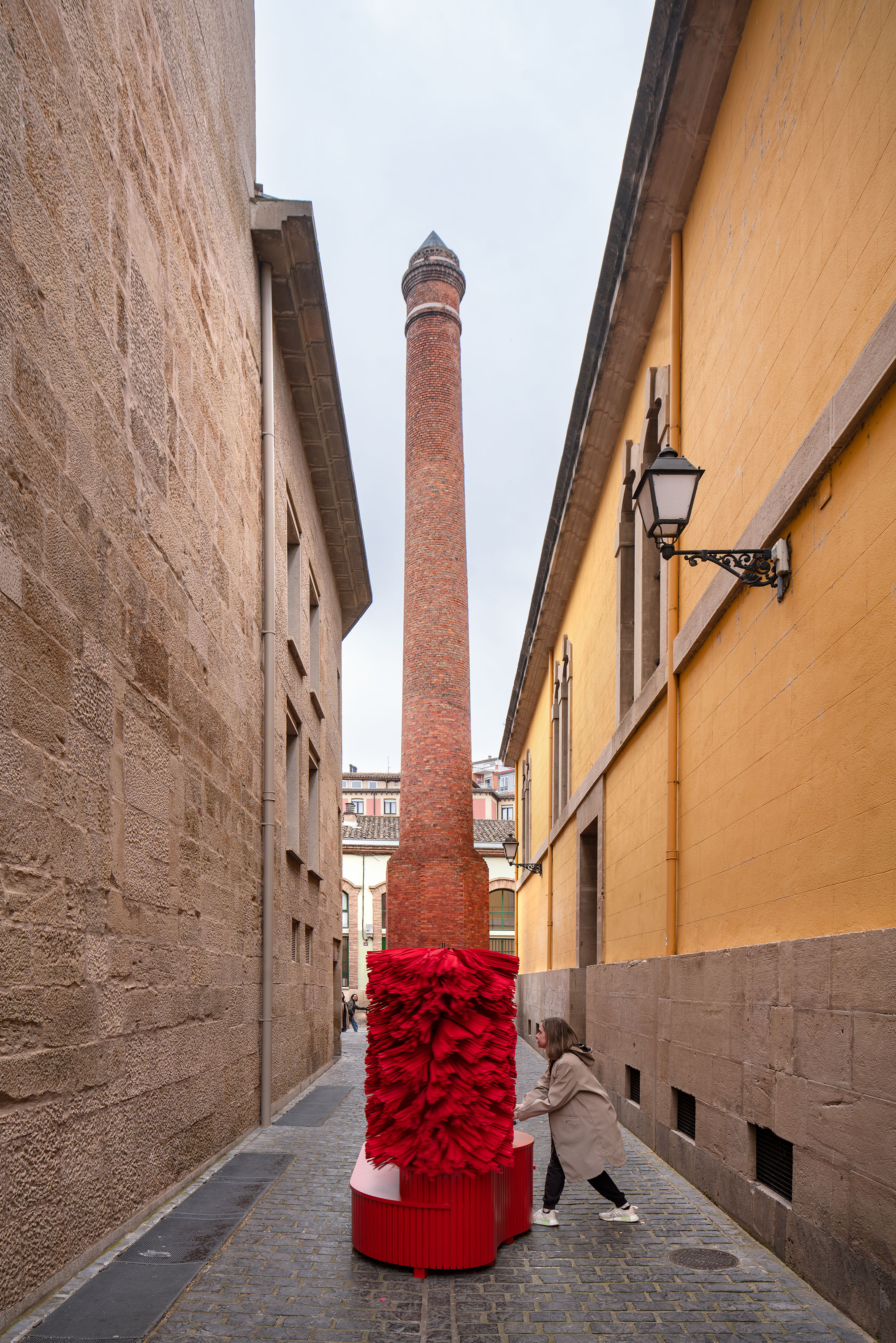 Presented as part of the 10th edition of the Concéntrico Festival in Logroño, Spain, the architectural installation "Dancing Carwash" invites you to join its mysterious choreography. Dance and movement are a symbol of joy and celebration, offering a unique experience of the space around us. Traditional Spanish and local dances, such as the stilt dances of Anguiano or flamenco, incorporate hypnotic rotations into their choreography, for both dancers and spectators alike. "Dancing Carwash" seeks to recreate the experience of these rotations for visitors, evoking the dresses and fringes of dancers' costumes as they inflate and unfold during traditional dances. To question this evolving relationship between the volume of objects, the installation draws inspiration from a daily artifact rooted in childhood memories: the automatic car wash. At rest, the car wash’s columns play with the classical composition of an urban passage. The columns are arranged on a base that functions as a turntable, with integrated wooden gears. The columns are set in motion by the rotation of the base via a crank. As they move, the colorful filaments and fabrics unfurl, expanding the column’s volume. The different sizes of filaments and "skirts" create a festive atmosphere, inviting visitors to touch, dance, feel, and play. "Dancing Carwash" invites you to partake in its vibrant celebration and hypnotic movements!