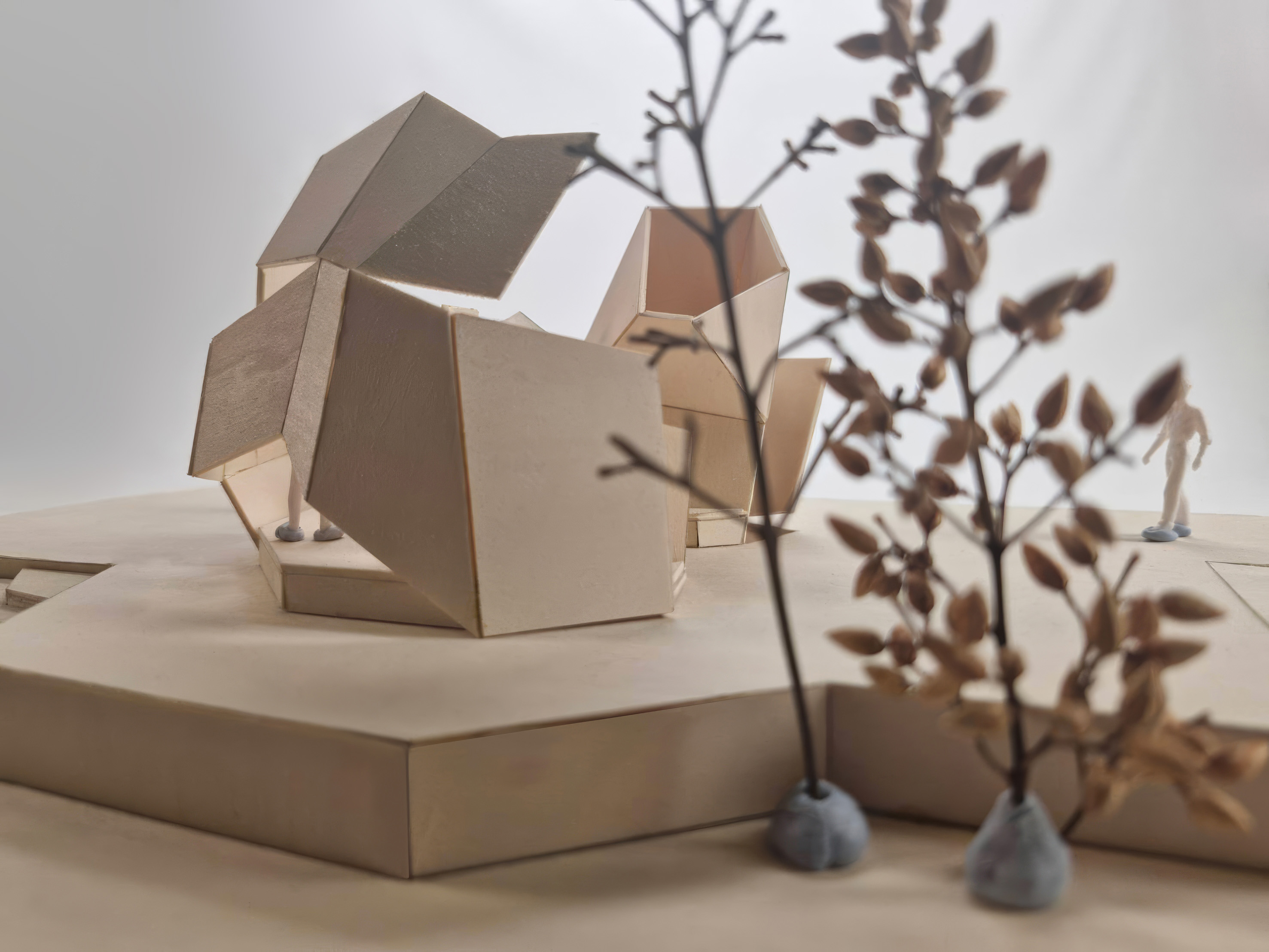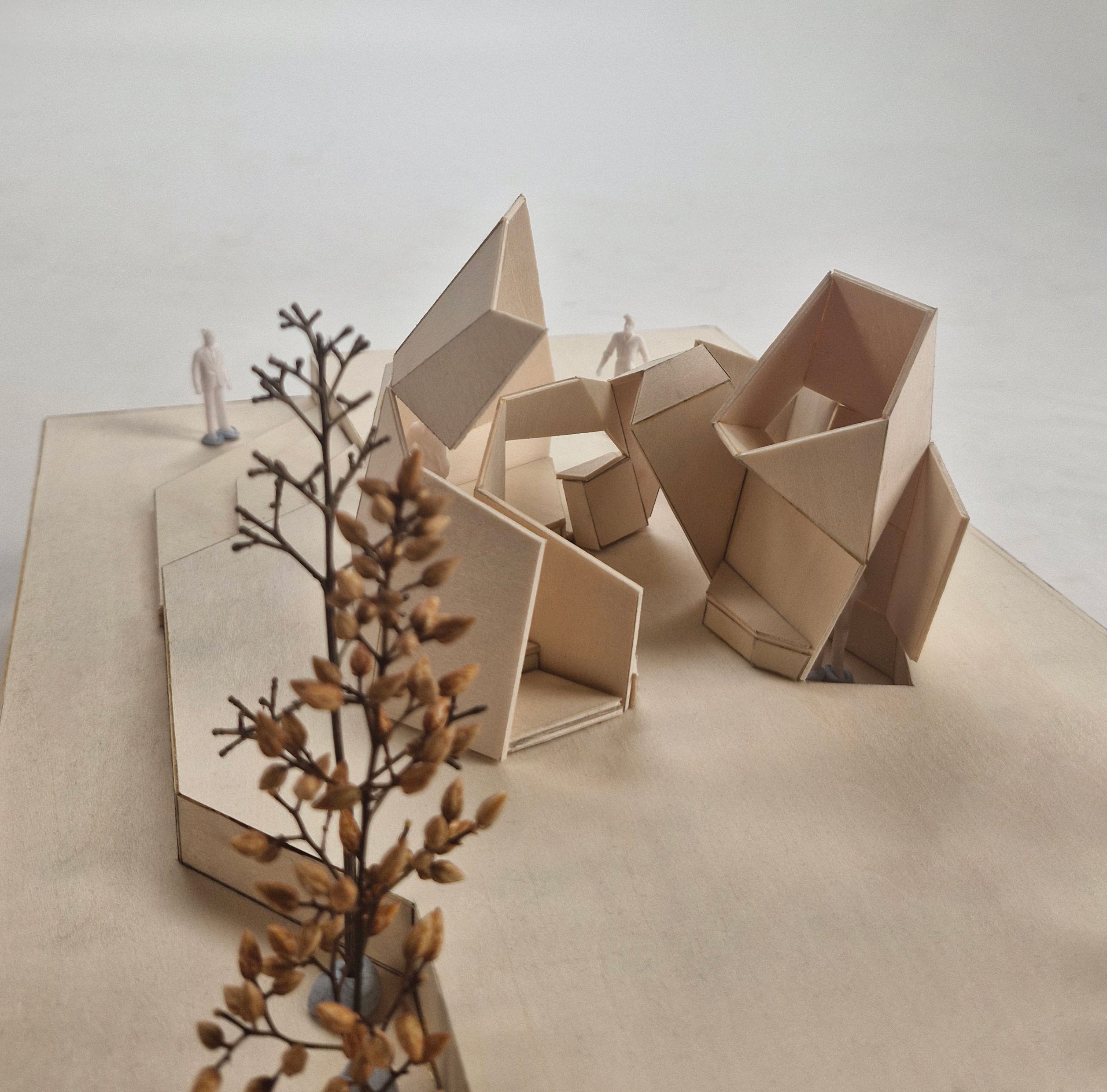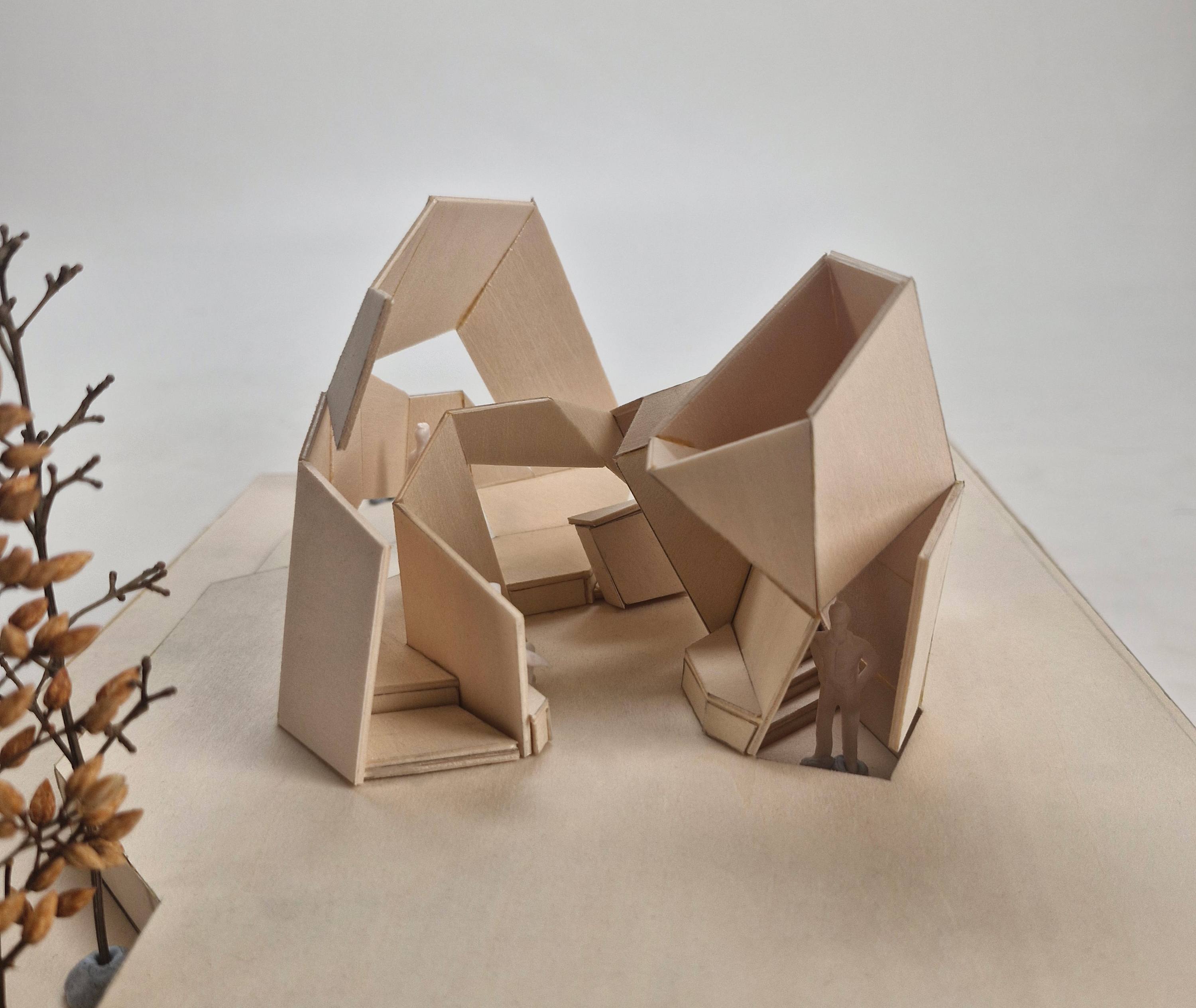 This model is my midterm assignment, themed around "park installations." In addition to focusing on the aesthetic appeal of installation art, I aimed to incorporate practical functionality into the project. As a result, I designed a pavilion as the central concept and included artistic elements to enhance its beauty. For this project, I was inspired by the world-known architect, Zaha Hadid's design concepts of dramatic light, space utilization, fluidity, dynamic spaces, and layering. This concept model features two spatial zones and a single circulation route. As a conceptual design, it is not tailored to any specific user group or intended function. Drawing inspiration from sunlight for this threshold study, I used a flashlight to simulate natural lighting effects on my model. The outcome revealed a fascinating interplay of light and shadow across the form. For this circulation precedent, I explored the idea of fluidity in my design, creating a dynamic connection between the two spaces. This approach draws inspiration from the folding and creasing circulation concept I developed in my previous model. In this threshold study, I began by experimenting with the concept of layering. The model’s walls reflect this idea through a visibly stratified structure. This process illustrates how I developed my design iteratively from the physical model in Assessment 2 to the final iteration. For example, the top view shows how the original two spaces were transformed into three, with additional circulation paths introduced. Furthermore, to make the design resemble a real pavilion, I explored how to add structural thickness to the model. This marks the final stage of my iterative design process. I intentionally set a design deadline to bring the process to a close, which helped me avoid overworking the concept. Stopping at this point also ensured I had sufficient time for fabrication and model-making.