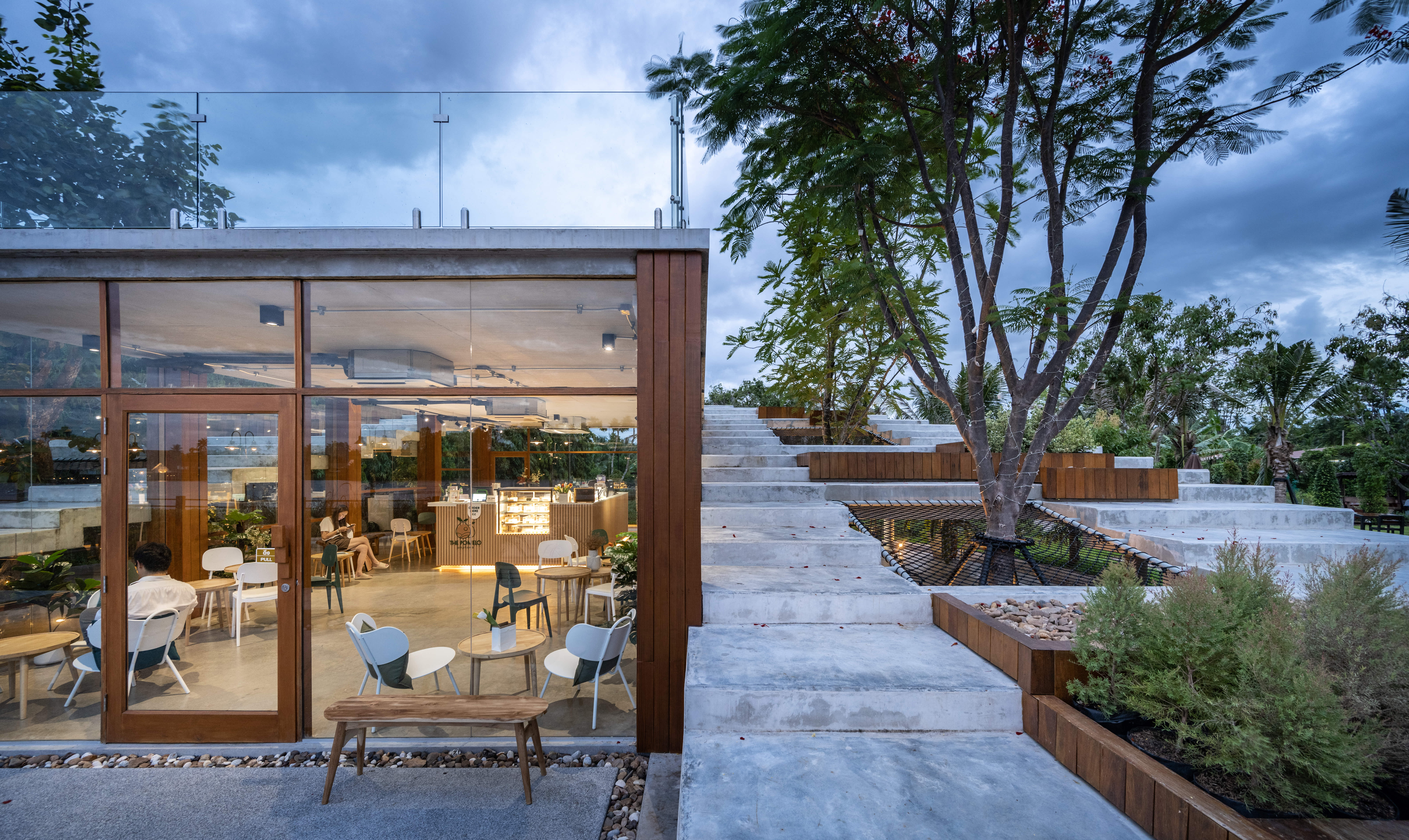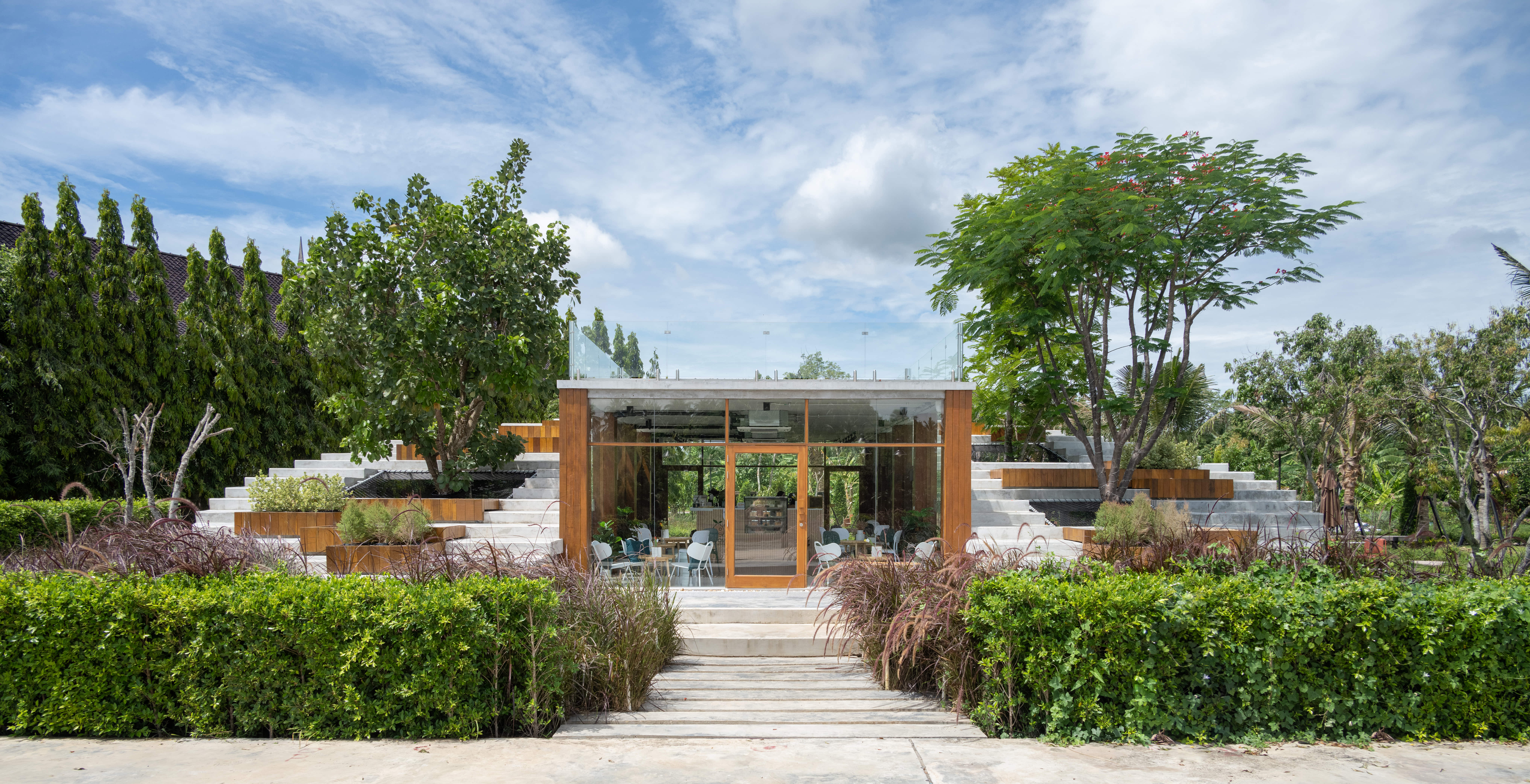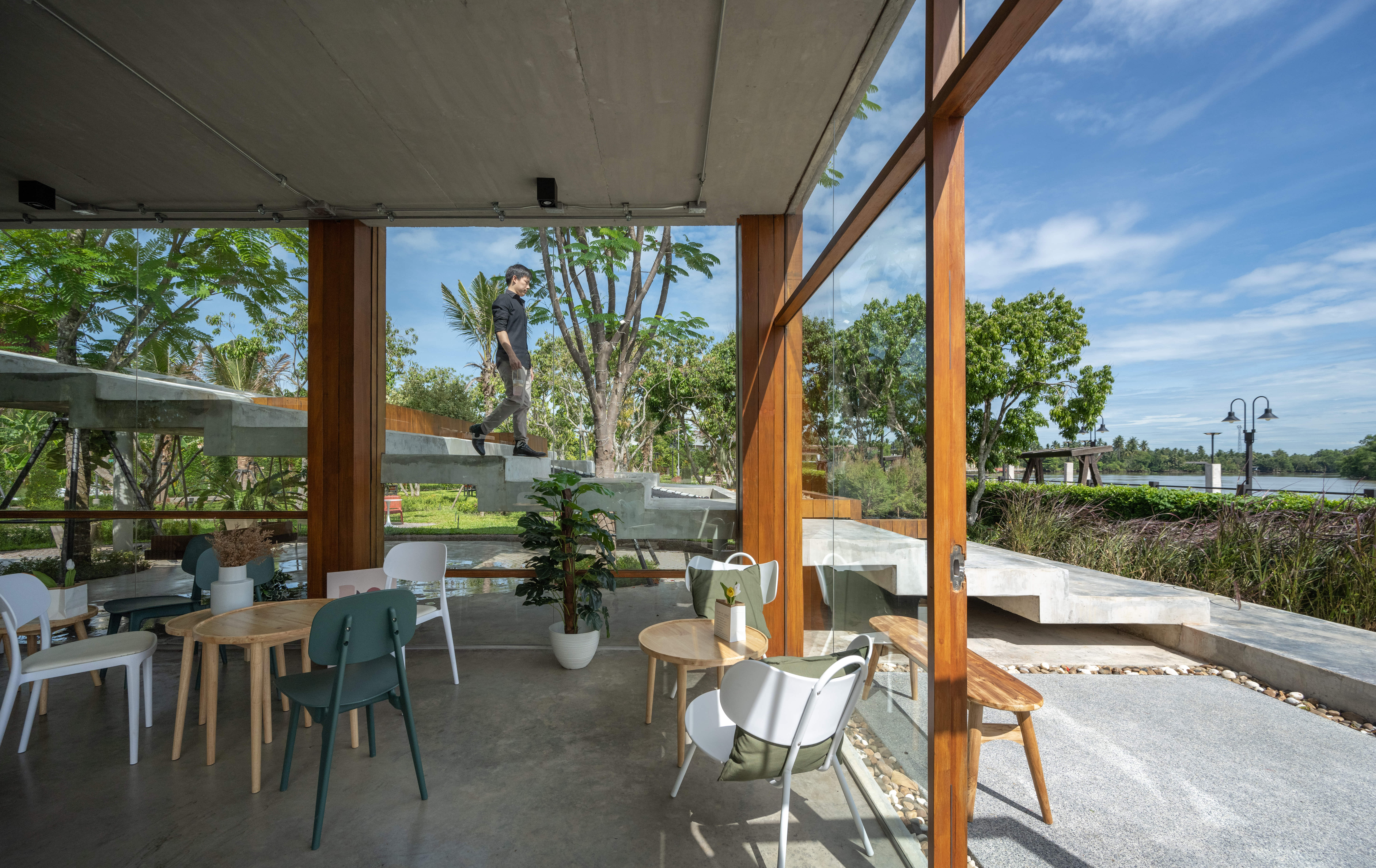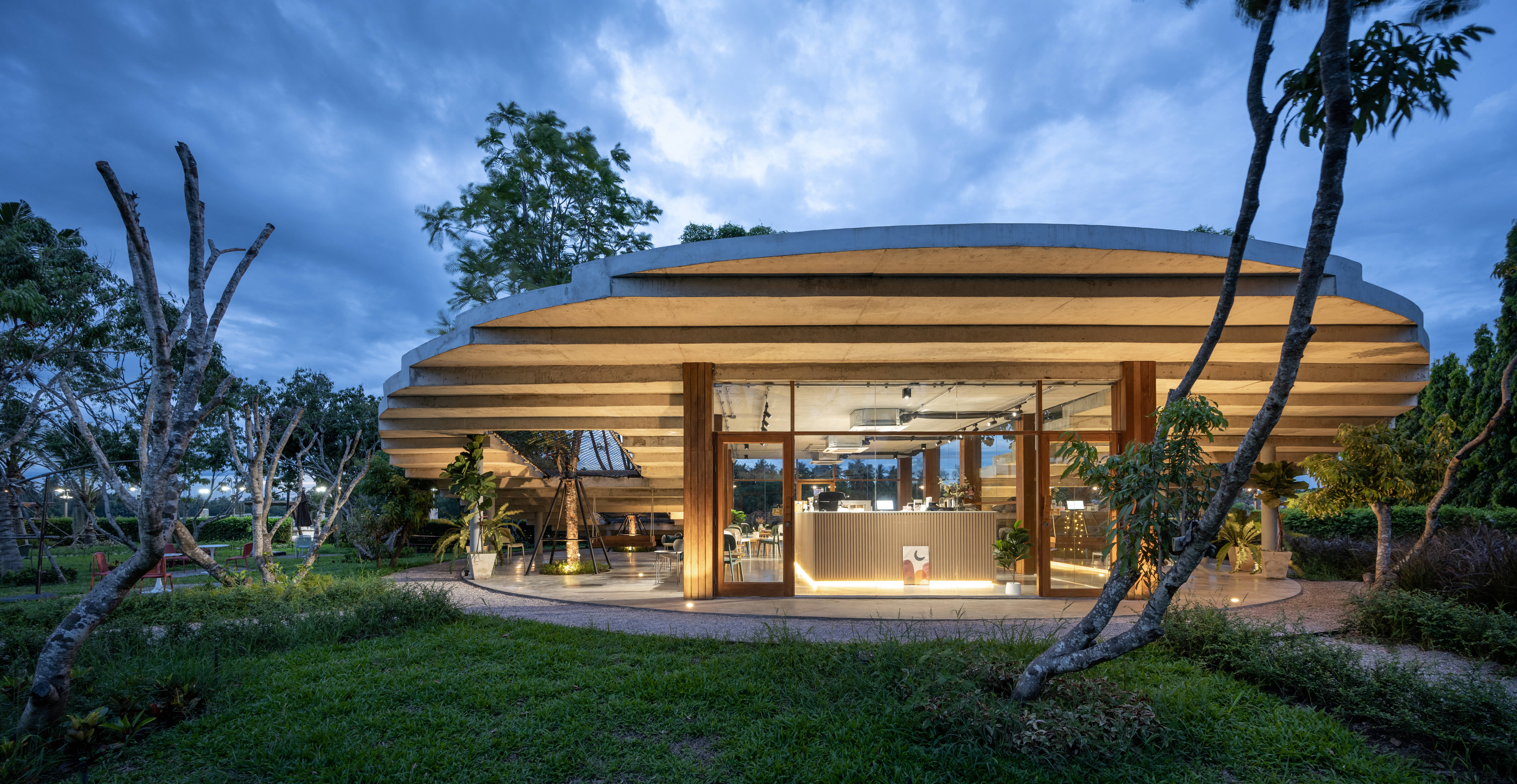 This café is part of The Pomelo Amphawa master plan, comprising five buildings designed to integrate with the site’s crops and trees. Located within a lychee garden, the café faces the Mekong River to the north—an ideal orientation to reduce direct tropical sunlight. The design centers on geometric contrast: a rectangular glass interior is surrounded by a circular concrete amphitheater. Open on all sides, the structure welcomes access from every direction and interacts closely with the natural surroundings. The lower edge of the amphitheater faces the river, functioning as a viewpoint for visitors to enjoy the landscape. Concrete is used throughout to emphasize the building’s form—balancing curves and stepped lines that encourage movement. Below, the shaded semi-outdoor space references “Tāithun,” the under-floor area of traditional Thai homes, providing a cool public zone during the day. Skylights bring sunlight into this area while preserving the existing trees. The rooftop functions as an evening venue facing the river, supporting round-the-clock use. Seating includes indoor café tables and bar seats, with outdoor options like benches and net seating beneath the trees—offering both comfort and connection to nature. This project creates a welcoming public space that harmonizes with its riverside setting and serves as a memorable gathering place throughout the day and night.