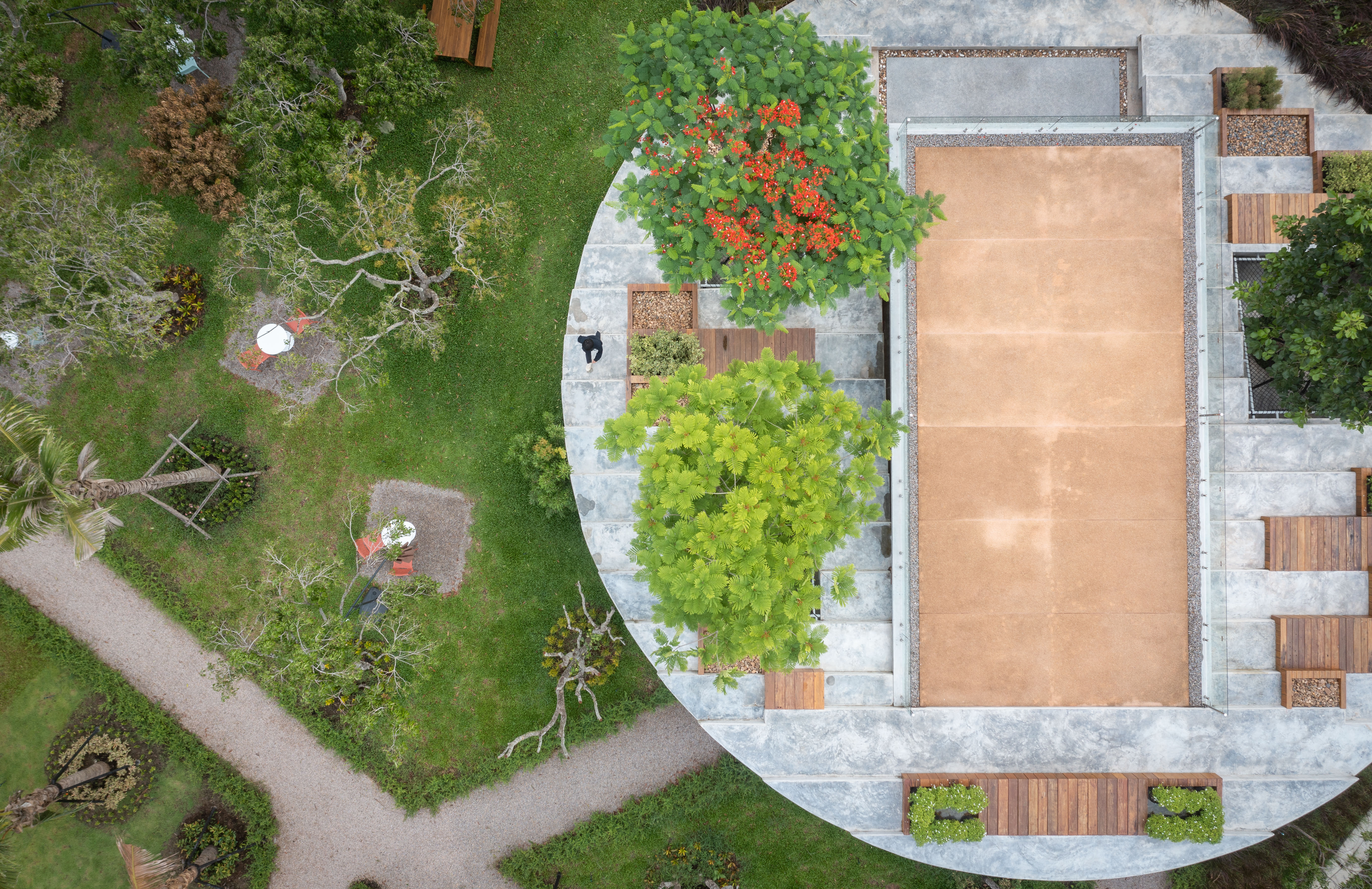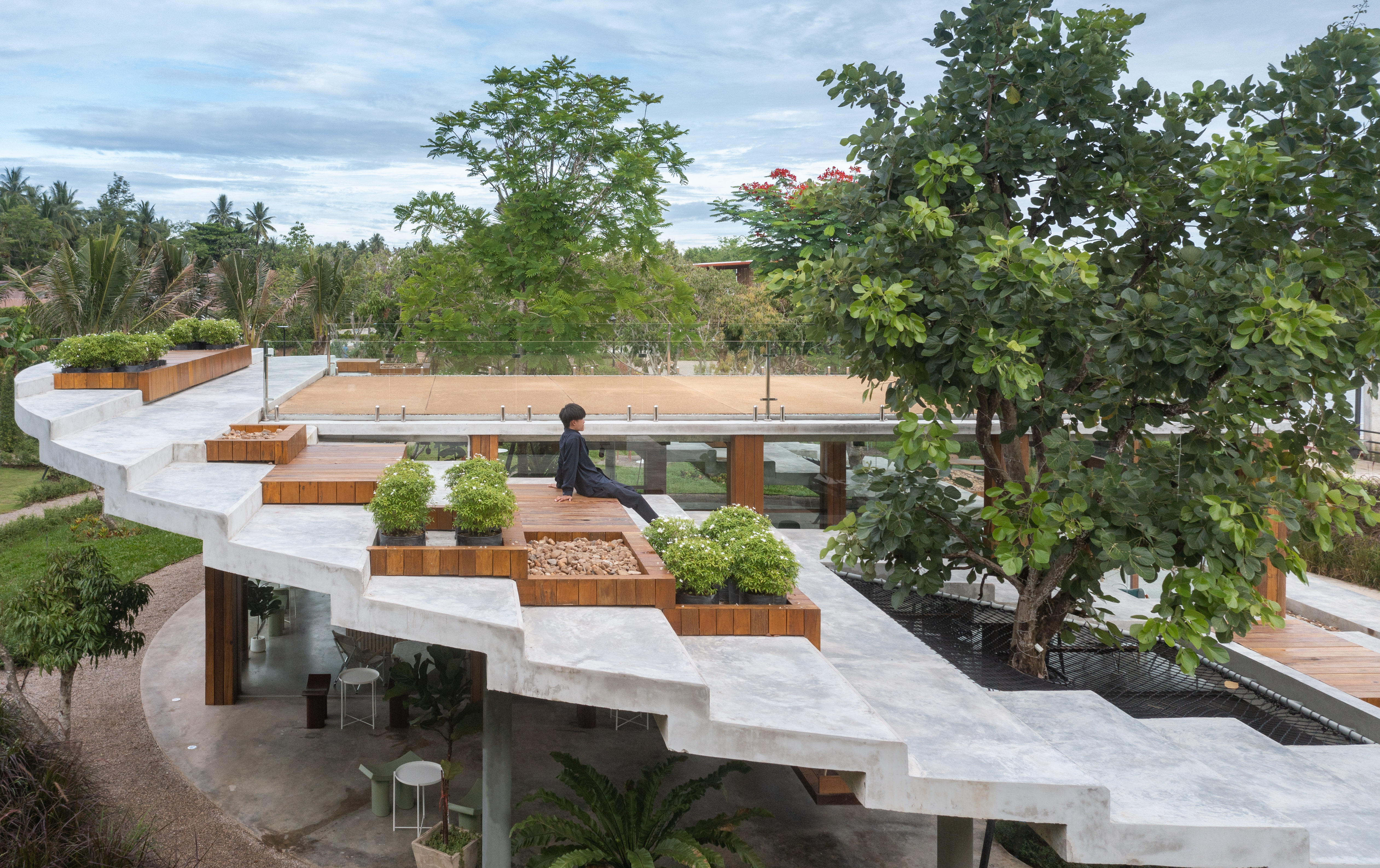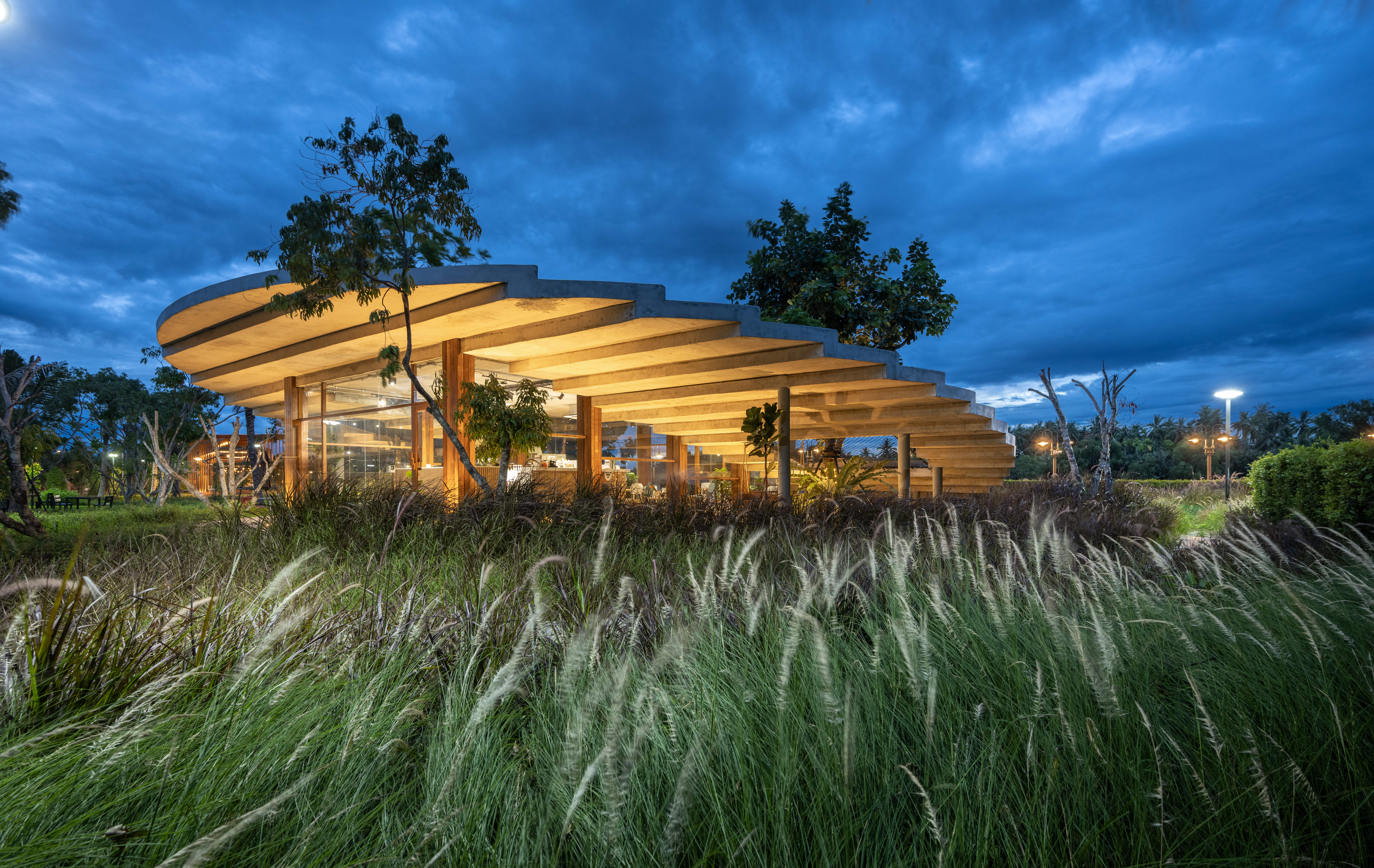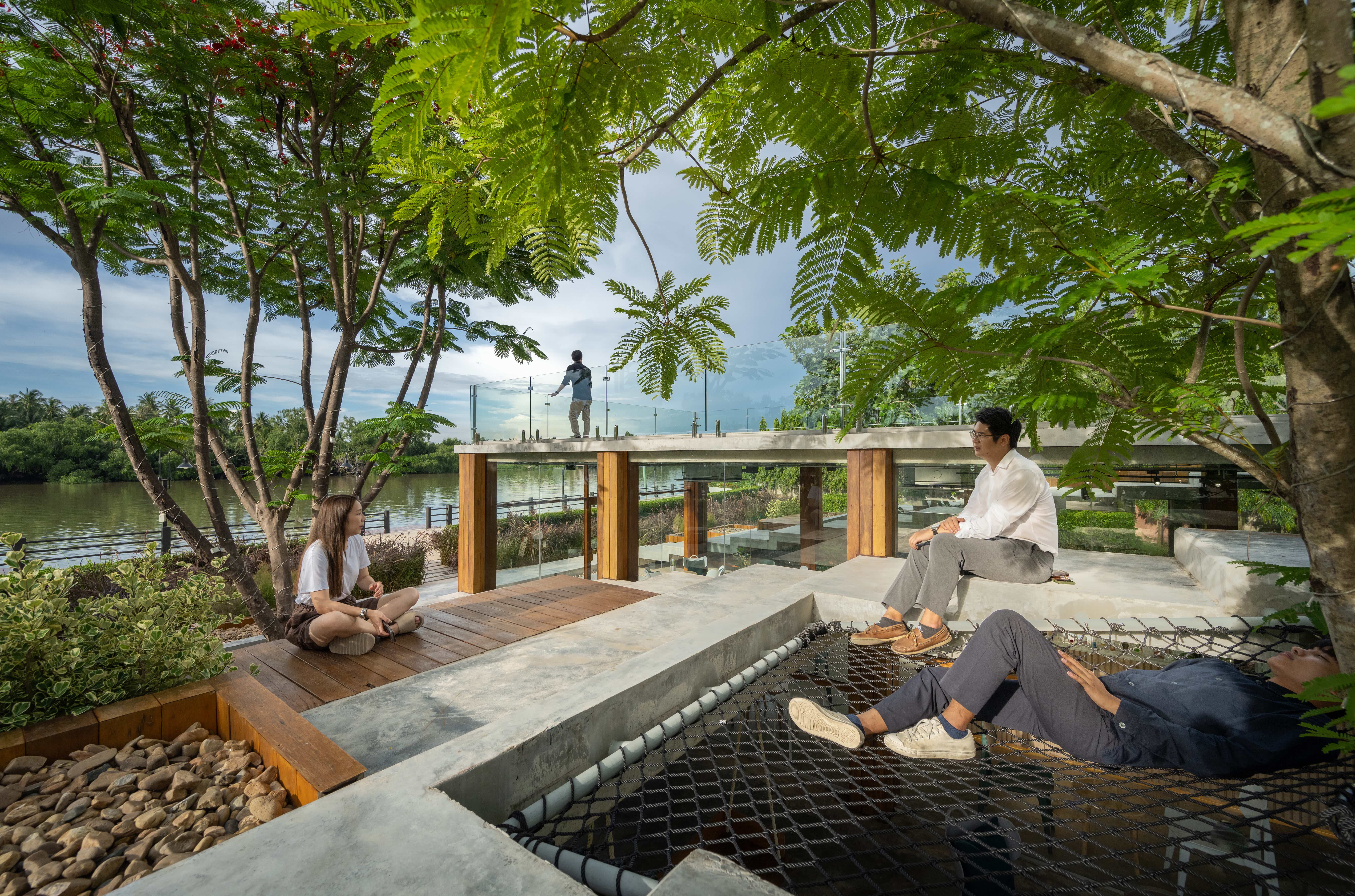 This café is part of The Pomelo Amphawa master plan, comprising five buildings designed to integrate with the site’s crops and trees. Located within a lychee garden, the café faces the Mekong River to the north—an ideal orientation to reduce direct tropical sunlight. The design centers on geometric contrast: a rectangular glass interior is surrounded by a circular concrete amphitheater. Open on all sides, the structure welcomes access from every direction and interacts closely with the natural surroundings. The lower edge of the amphitheater faces the river, functioning as a viewpoint for visitors to enjoy the landscape. Concrete is used throughout to emphasize the building’s form—balancing curves and stepped lines that encourage movement. Below, the shaded semi-outdoor space references “Tāithun,” the under-floor area of traditional Thai homes, providing a cool public zone during the day. Skylights bring sunlight into this area while preserving the existing trees. The rooftop functions as an evening venue facing the river, supporting round-the-clock use. Seating includes indoor café tables and bar seats, with outdoor options like benches and net seating beneath the trees—offering both comfort and connection to nature. This project creates a welcoming public space that harmonizes with its riverside setting and serves as a memorable gathering place throughout the day and night.