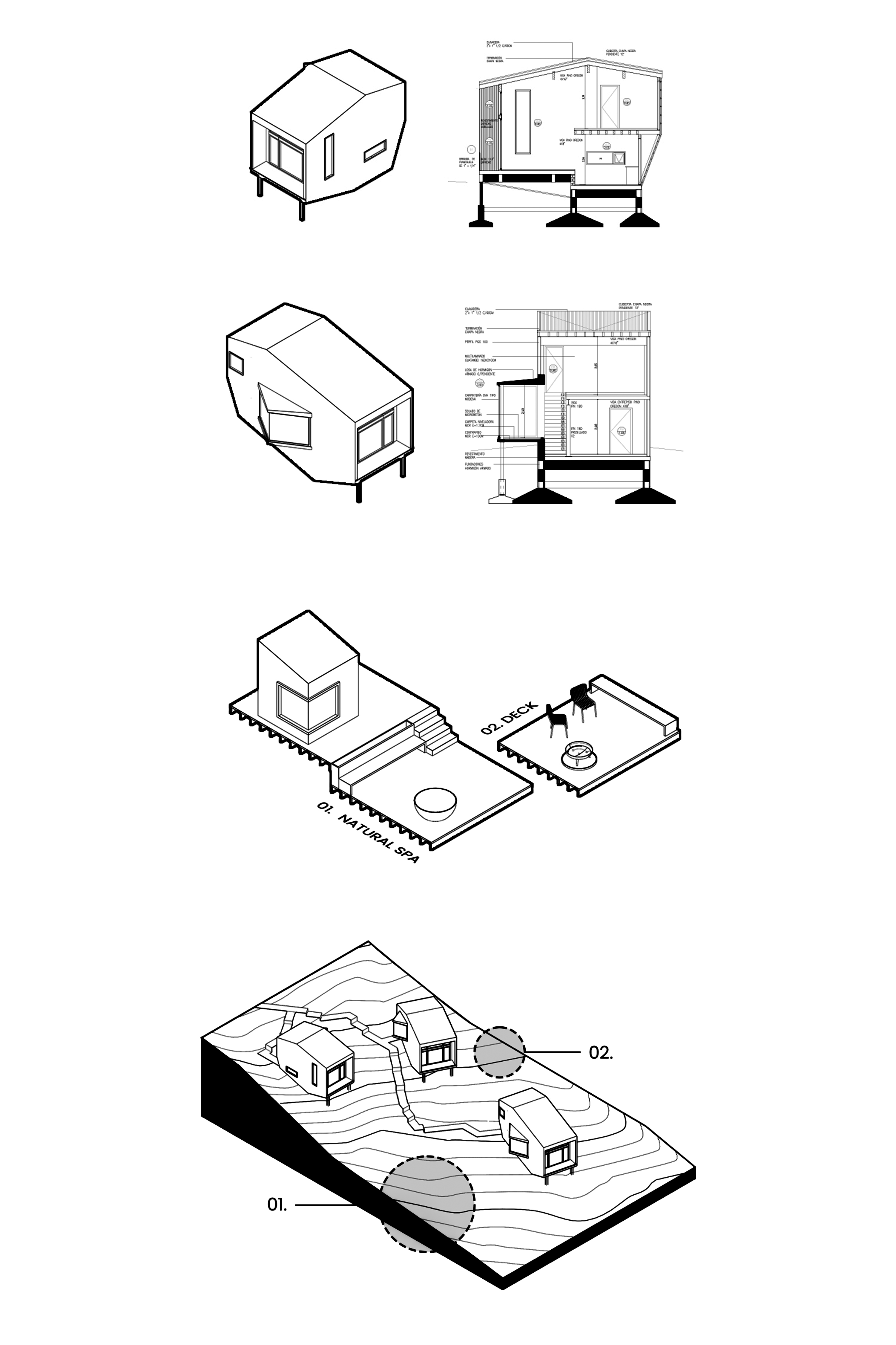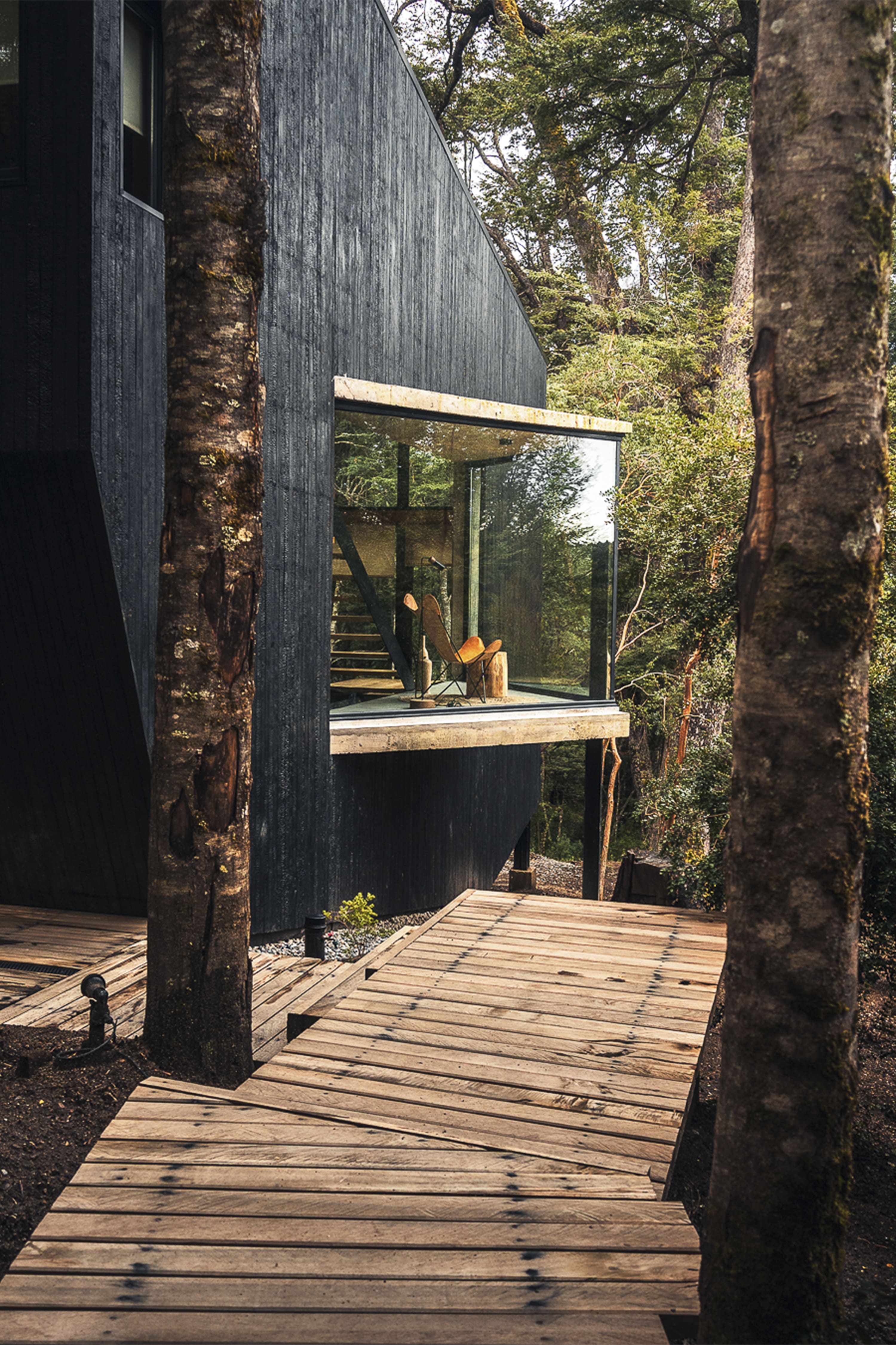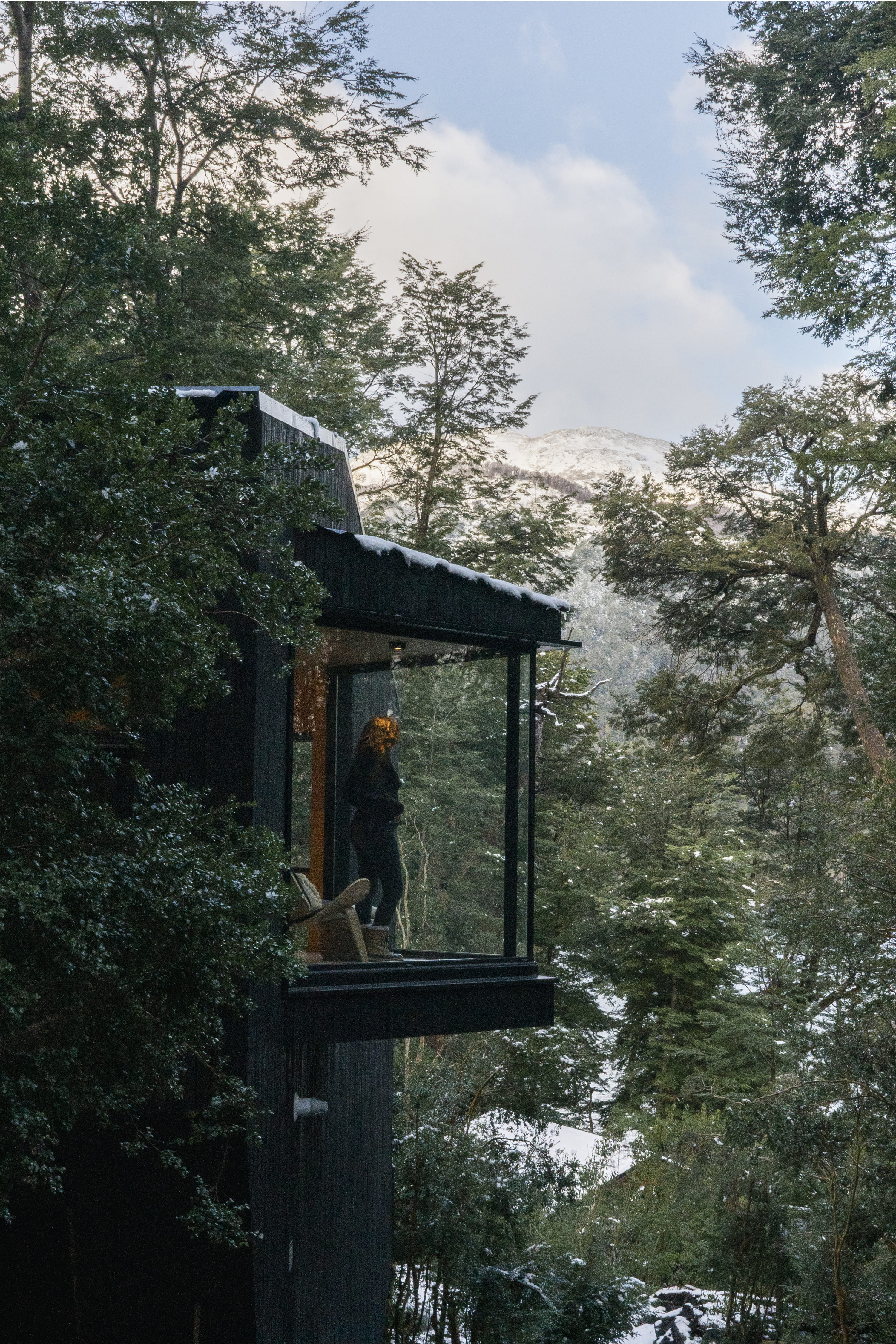 The project involved the creation of a boutique-scale tourist complex (250 m²) within a native forest of Coihues and Arrayanes, on steep terrain with stunning views and direct access to the shores of Lake Correntoso—an incredibly peaceful and natural setting. The proposal consisted of modular “landscape cabins” for two to three guests, conceived as just another element of the forest. Each cabin blends into its surroundings with a sense of controlled randomness—sharing a common architectural language, yet featuring subtle variations that give each one a unique identity. The cabins were carefully placed in natural clearings where no trees needed to be cut down, staying true to their core objective: to create an architecture that coexists harmoniously with the forest. Despite their compact footprint, the cabins offer a captivating spatial experience—dissolving the boundaries between the interior and the surrounding forest. Each unit is designed as a single open space, split across half-levels and punctuated by large, strategically positioned windows. These openings extend the sense of space outward and allow the dense Myrtle canopy to provide both privacy and immersion in nature. This approach also fosters intimacy between each volume and the communal areas of the complex. The bathrooms are spacious and comfortable. The largest cabin features a freestanding tub with panoramic views—inviting guests to enjoy a hot bath while watching the snowfall through the window. The architects anticipated the project's logistical challenges: a narrow, sloped site densely populated with trees. To address this, they opted for dry construction atop reinforced concrete foundations, requiring precise and efficient planning. Externally, the cabins feature a rugged, rocky morphology clad in eucalyptus wood, treated with the ancient Japanese technique Shou Sugi Ban. This method—charring the wood’s surface—creates a unique texture and improves water resistance, fire retardancy, sustainability, and durability.