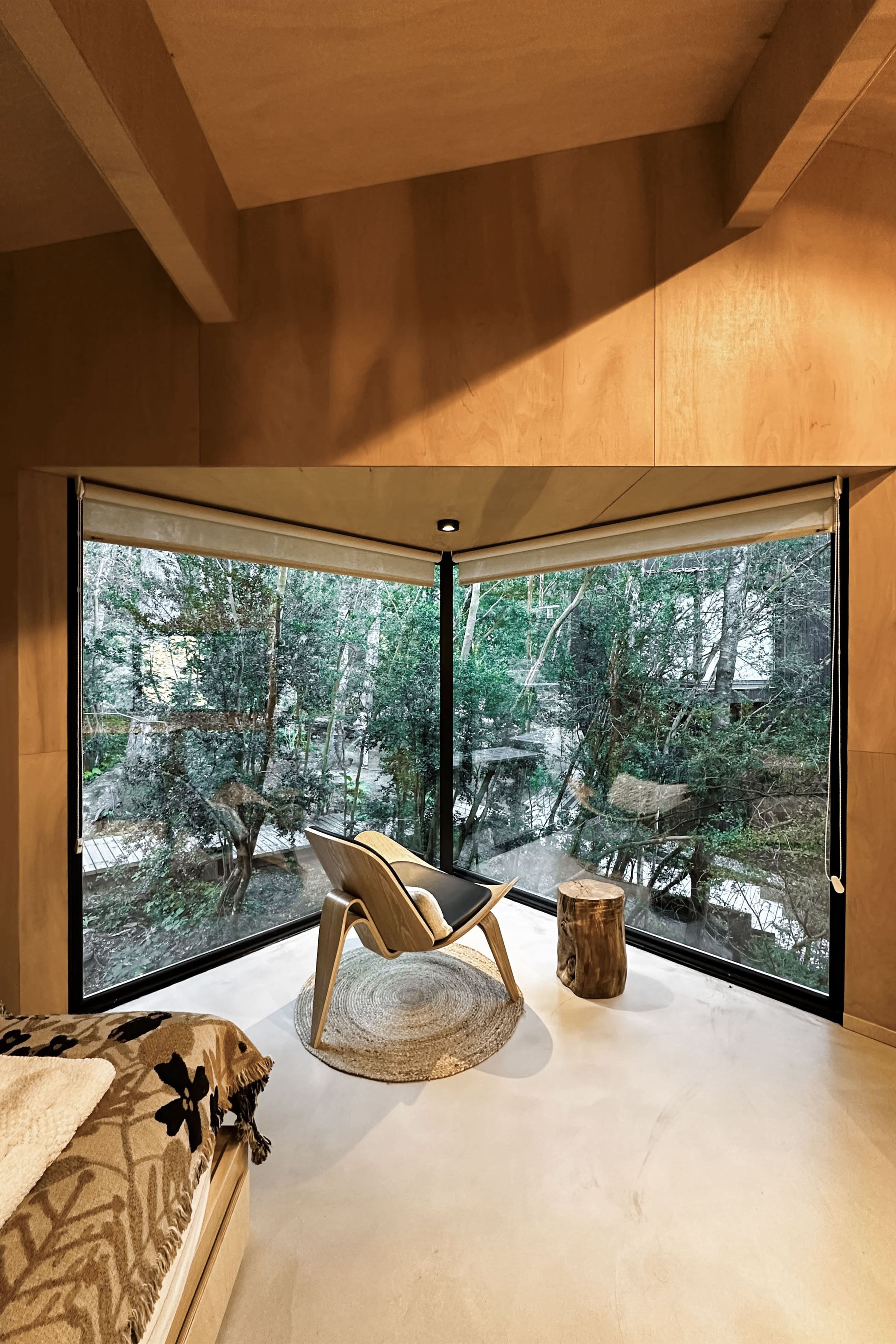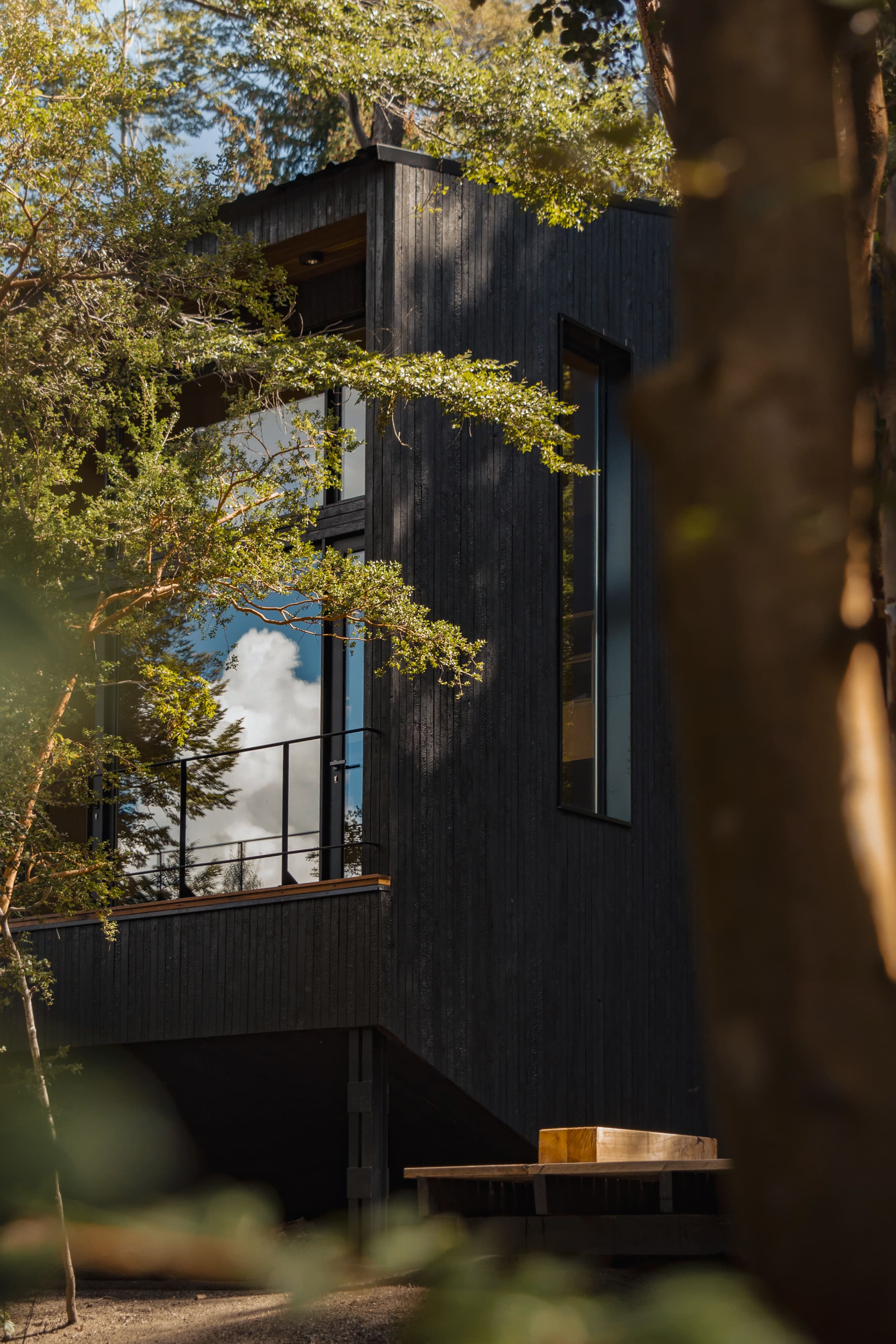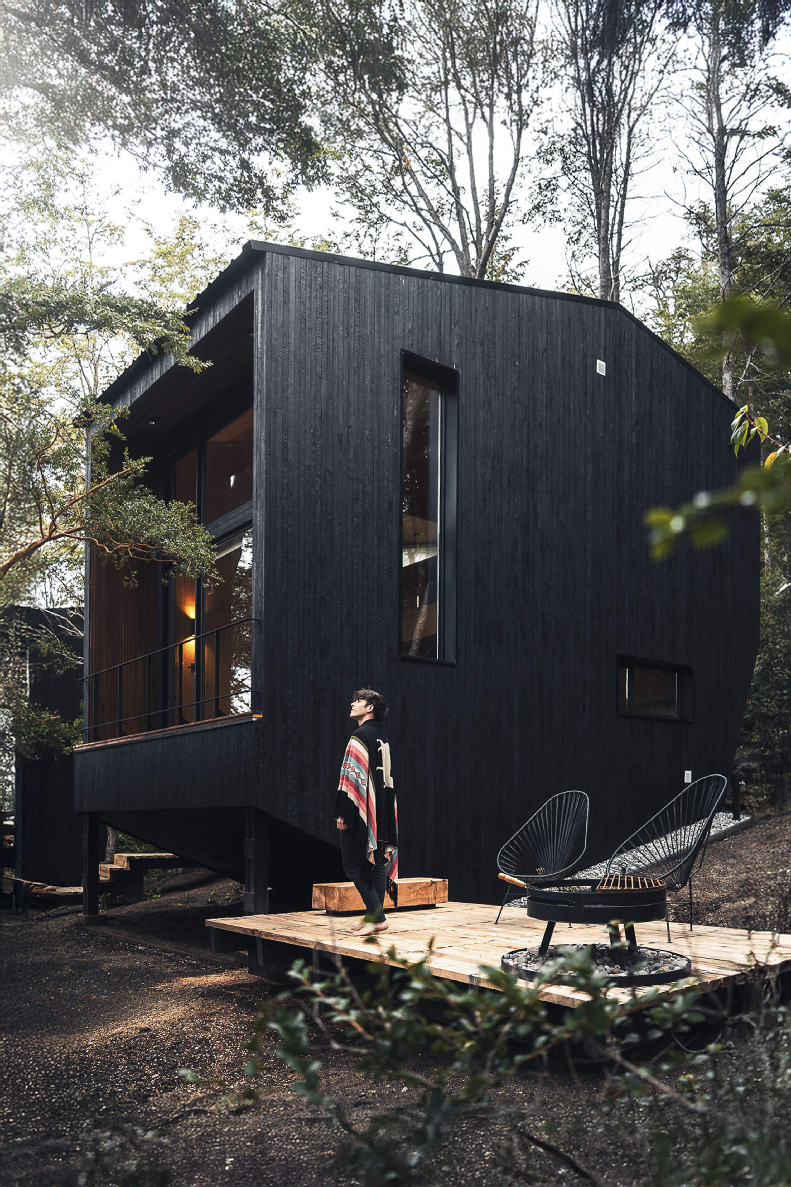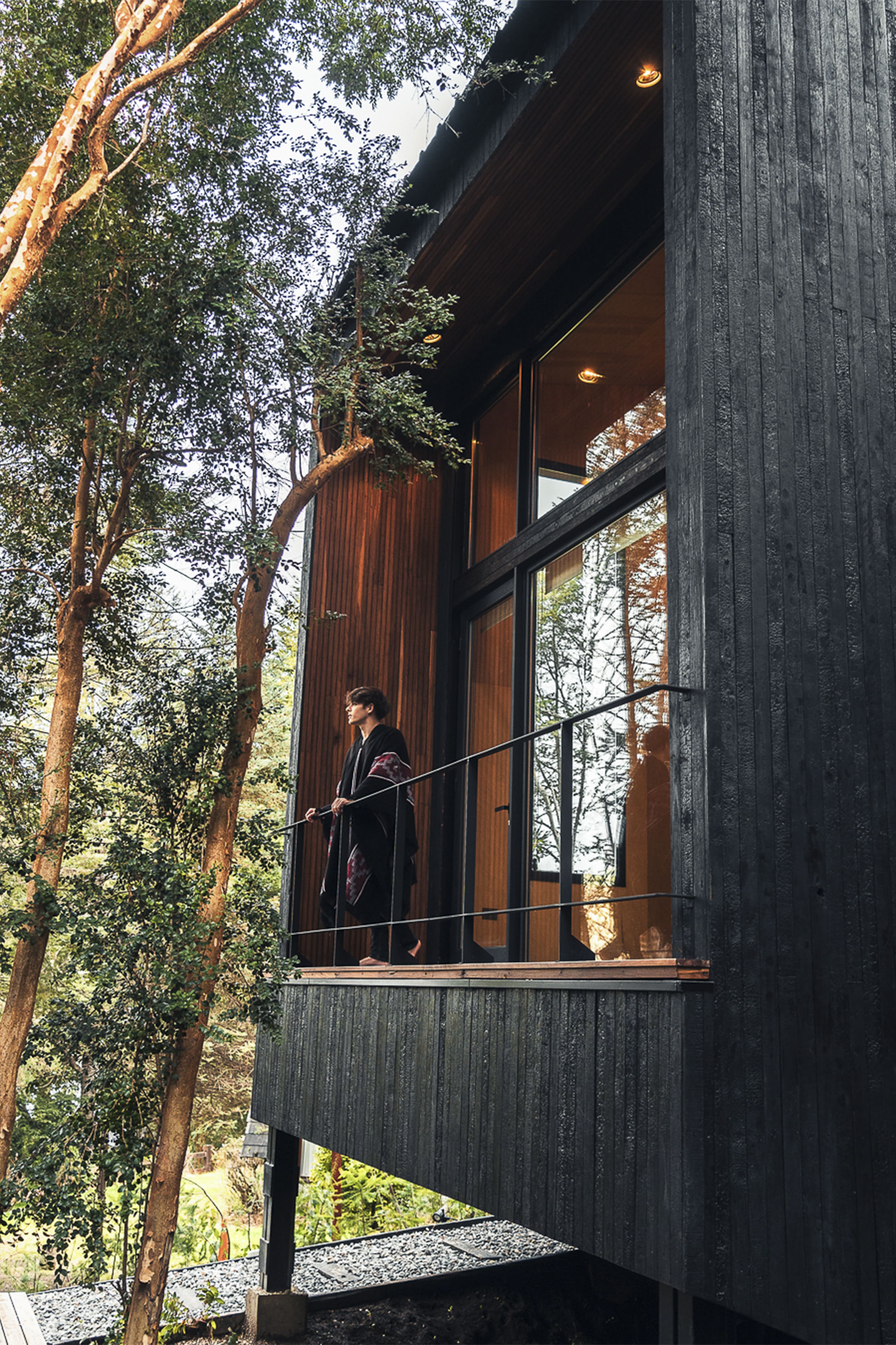 The project involved the creation of a boutique-scale tourist complex (250 m²) within a native forest of Coihues and Arrayanes, on steep terrain with stunning views and direct access to the shores of Lake Correntoso—an incredibly peaceful and natural setting. The proposal consisted of modular “landscape cabins” for two to three guests, conceived as just another element of the forest. Each cabin blends into its surroundings with a sense of controlled randomness—sharing a common architectural language, yet featuring subtle variations that give each one a unique identity. The cabins were carefully placed in natural clearings where no trees needed to be cut down, staying true to their core objective: to create an architecture that coexists harmoniously with the forest. Despite their compact footprint, the cabins offer a captivating spatial experience—dissolving the boundaries between the interior and the surrounding forest. Each unit is designed as a single open space, split across half-levels and punctuated by large, strategically positioned windows. These openings extend the sense of space outward and allow the dense Myrtle canopy to provide both privacy and immersion in nature. This approach also fosters intimacy between each volume and the communal areas of the complex. The bathrooms are spacious and comfortable. The largest cabin features a freestanding tub with panoramic views—inviting guests to enjoy a hot bath while watching the snowfall through the window. The architects anticipated the project's logistical challenges: a narrow, sloped site densely populated with trees. To address this, they opted for dry construction atop reinforced concrete foundations, requiring precise and efficient planning. Externally, the cabins feature a rugged, rocky morphology clad in eucalyptus wood, treated with the ancient Japanese technique Shou Sugi Ban. This method—charring the wood’s surface—creates a unique texture and improves water resistance, fire retardancy, sustainability, and durability.
