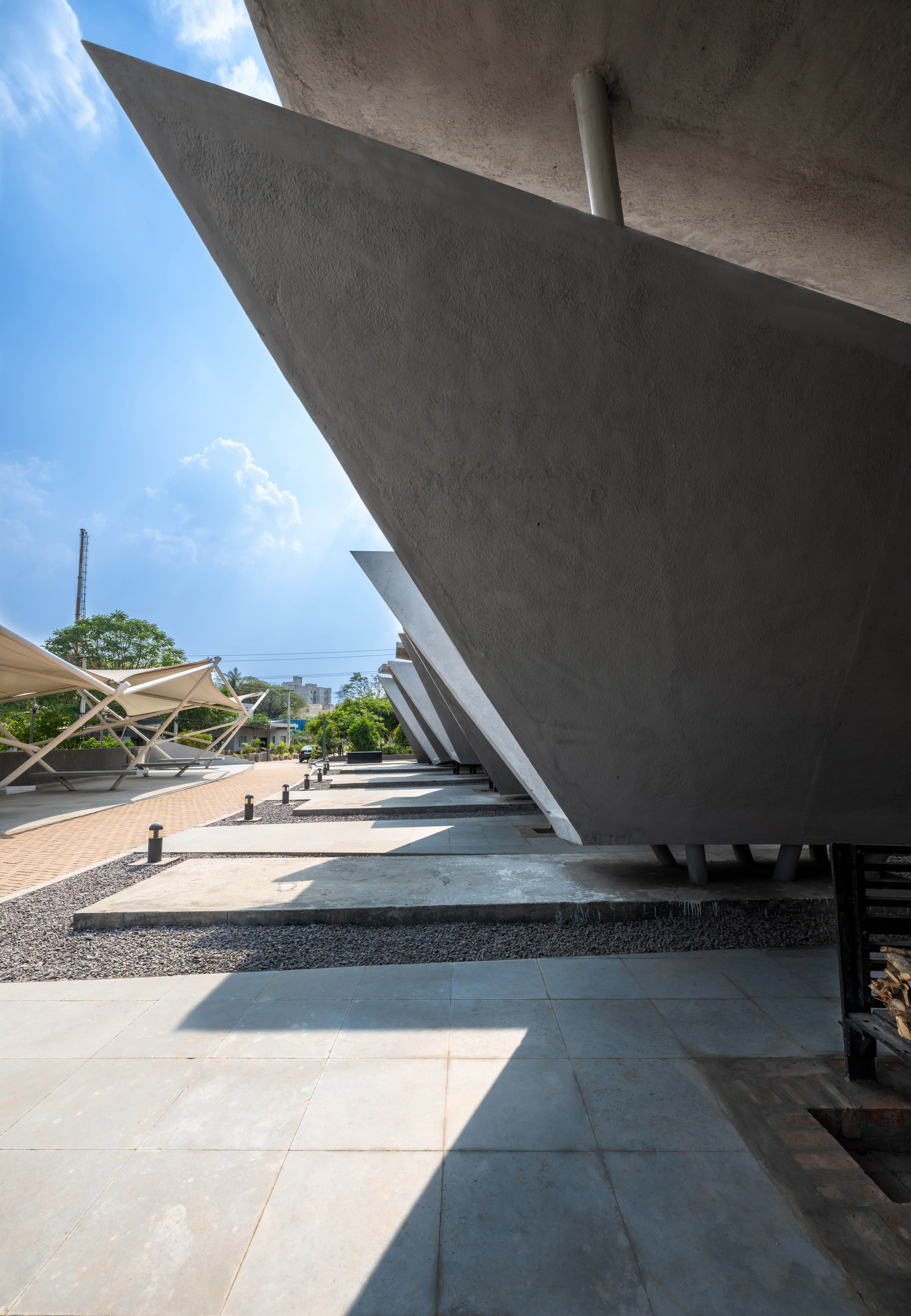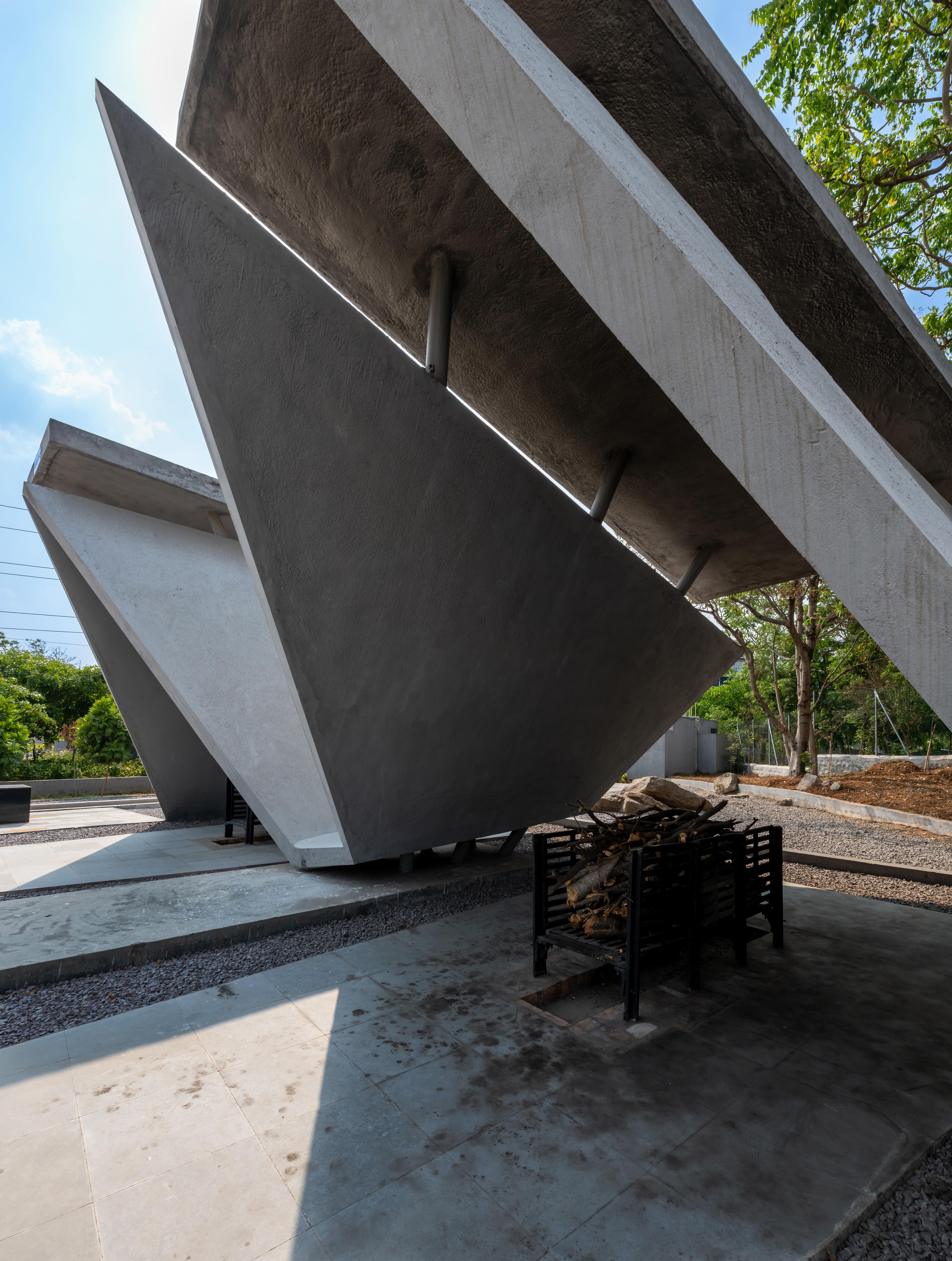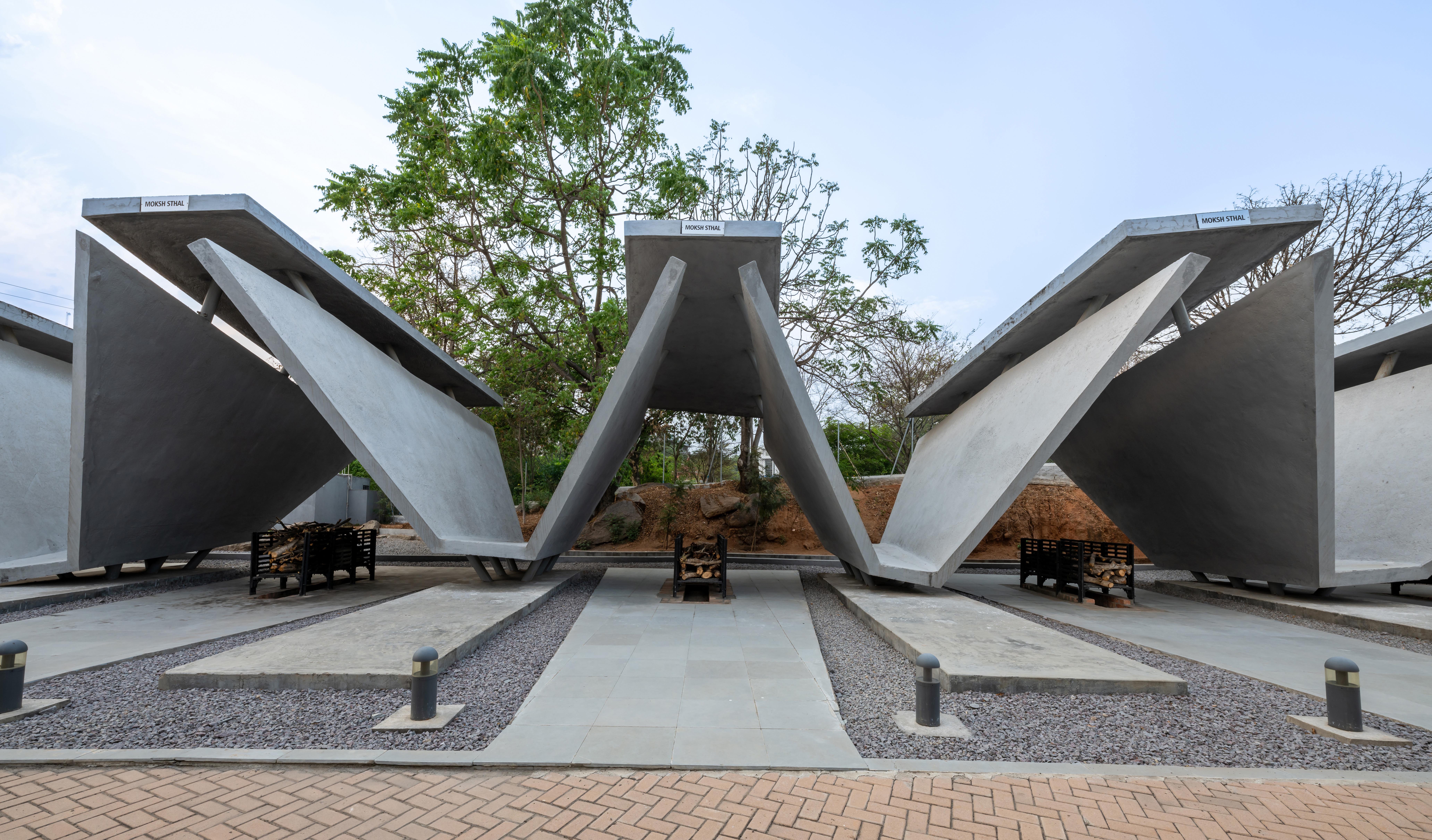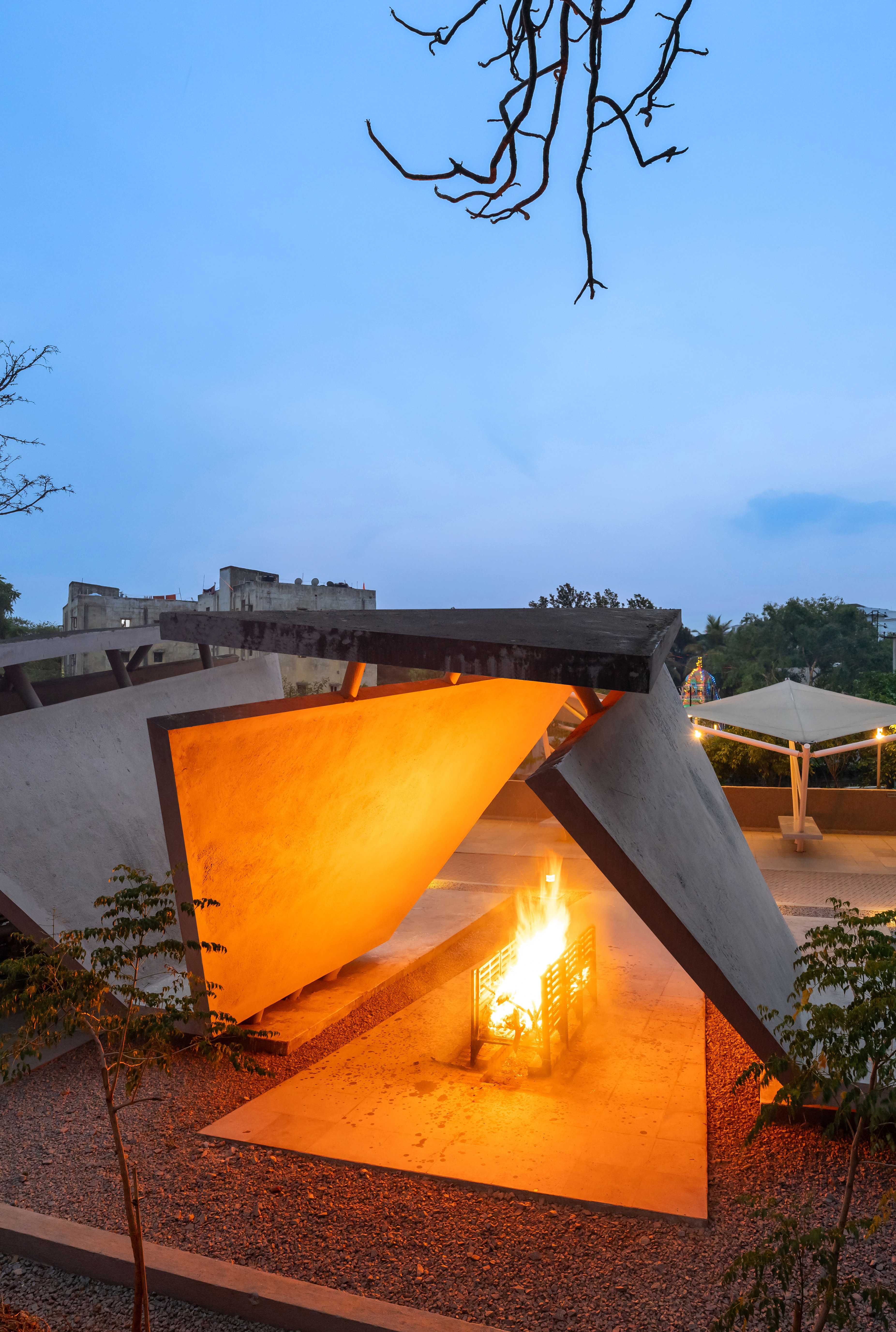 INTENTION [the context] Very deep in the hustle of city noises, one need a space to relive, express and eventually walk the acceptance of loss. A relatively empty pocket of land was allotted to dedicate to a possibly quite seclusion; as expected to be able to express one’s sorrow and grief in privacy. SIGNIFICATION [the presence] A cluster of planes form portals of cremation pyres. To be able to engage the living, to help relive memories, to help move on, to let go, to accept death; the 'Vaikuntha Mahaprasthanam' is a Hindu Crematorium that symbolises a doorway, an archway, a passageway, a threshold of departure into the higher realms of life & living, of soul & self. MANIFESTATION [the FORM itself] 1 [PYRE] Planes forming portals; angling of the walls are protective and supportive, whilst they create a passage for peaceful passing of the deceased. The architecture of the crematorium formally is very fragile looking- as if it were in need of support. Very like a human being who’s lost someone; but only under such adverse conditions does an individual’s strength surfaces, hence the structure is a cluster of forms giving strength to each other. All in all a symbolic representation of the shouldering the burden as a family weighed down by the sorrow of losing someone close. 2 [WAITING AREA] Membranes of the waiting area help form a mnemonic screen of recollections, reminiscence, flashbacks and so on. The twisted feeling of lost and losing one’s bearings followed by grief and initial shock is represented in the form of the waiting area structure.