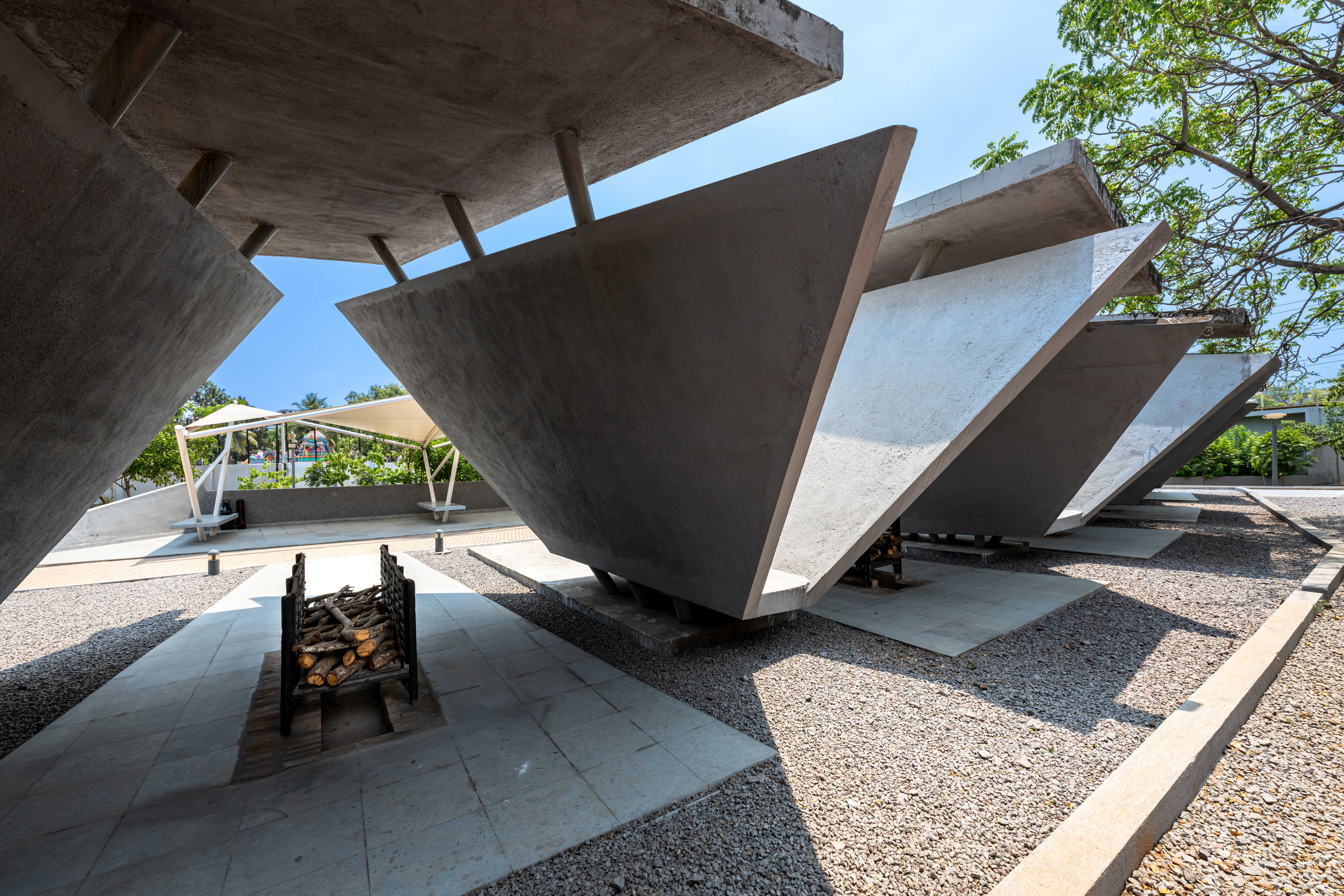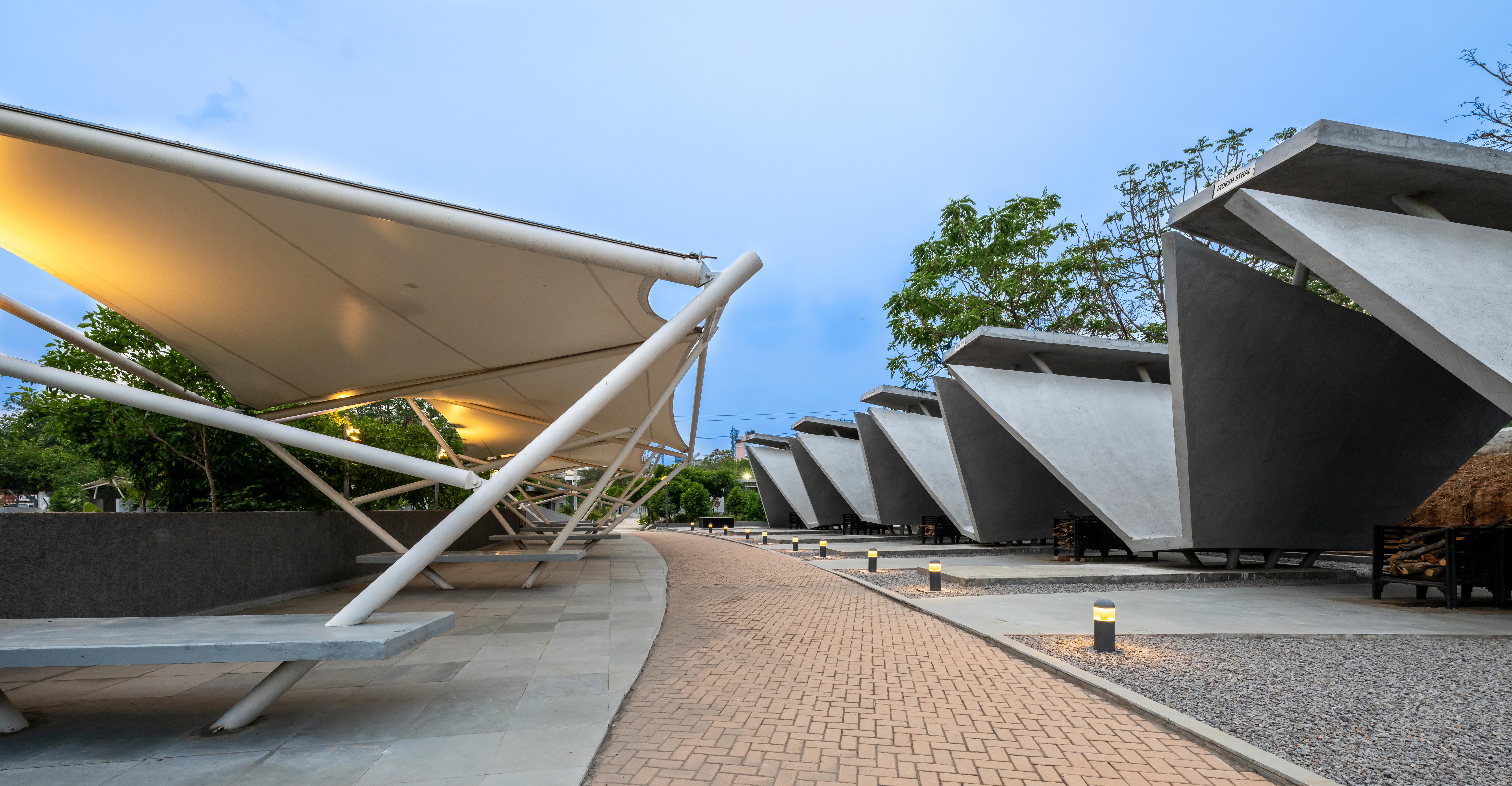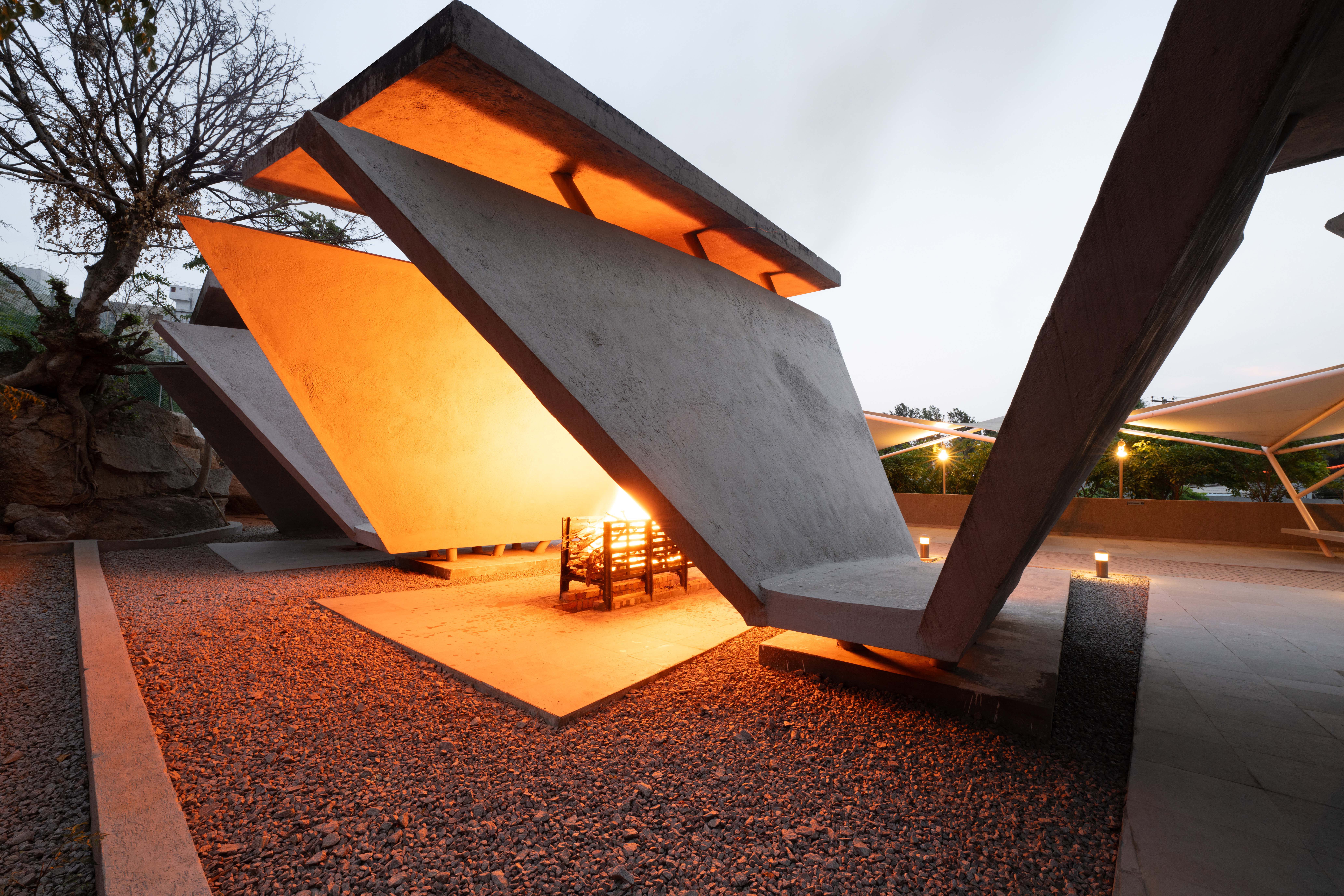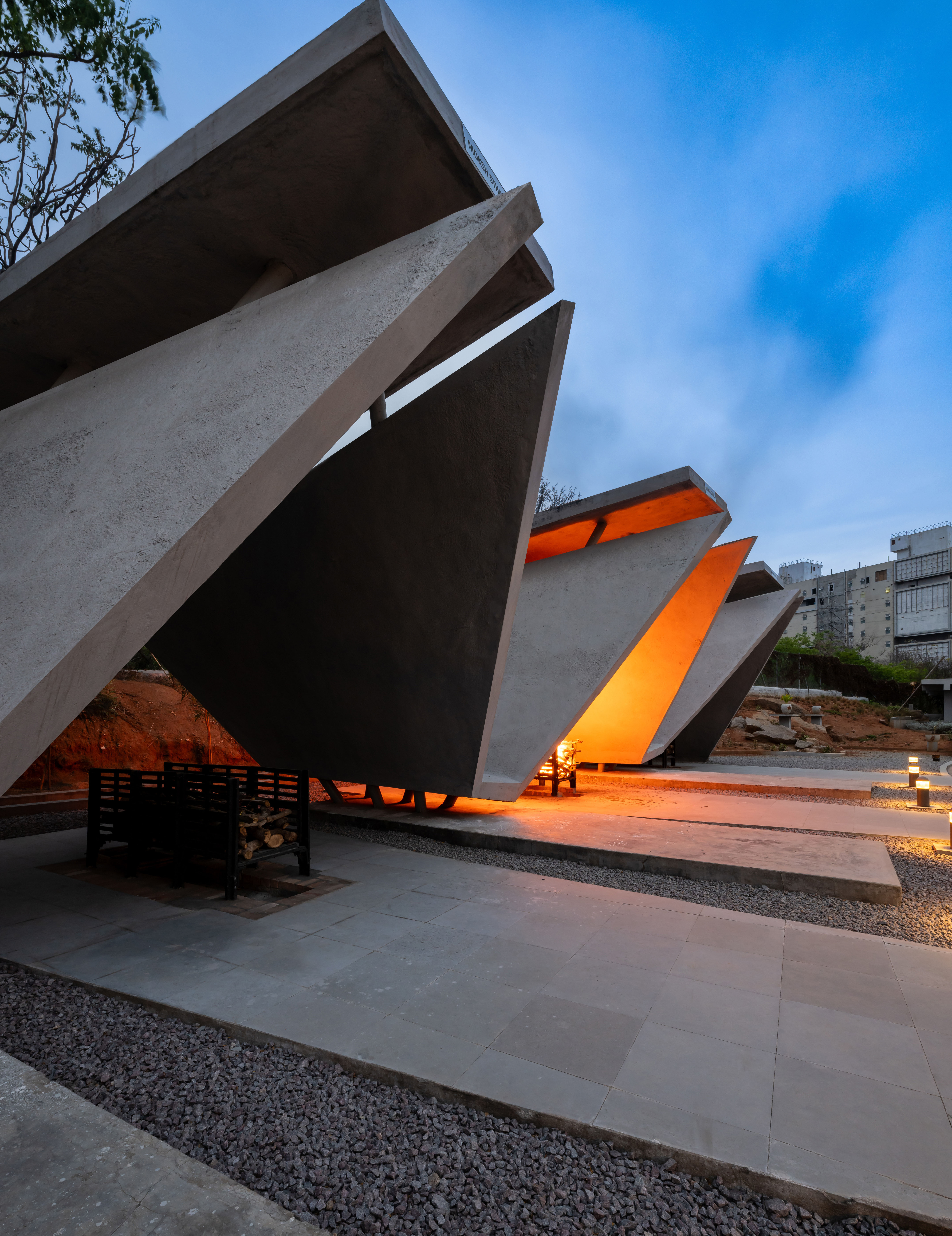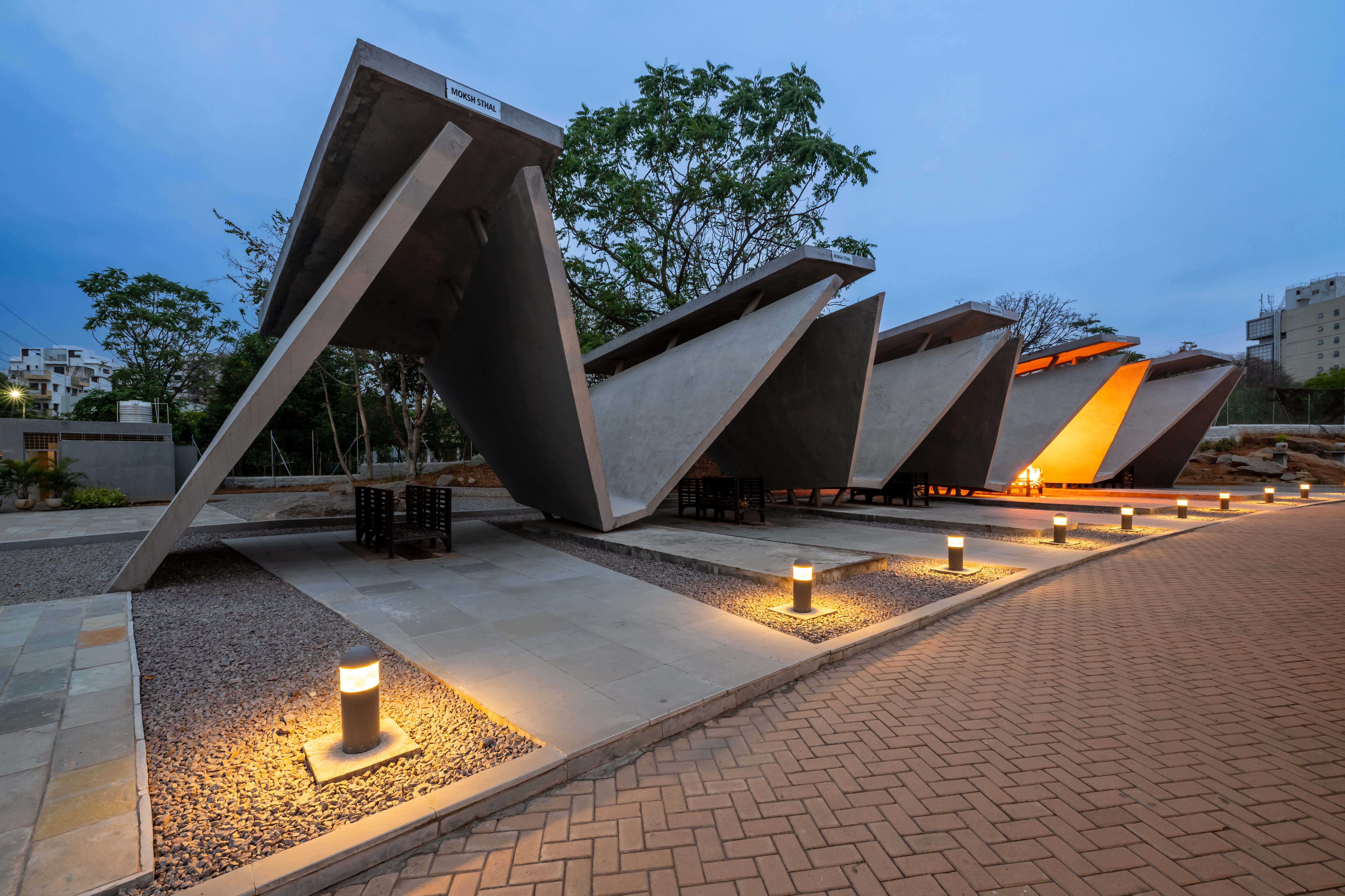 INTENTION [the context] Very deep in the hustle of city noises, one need a space to relive, express and eventually walk the acceptance of loss. A relatively empty pocket of land was allotted to dedicate to a possibly quite seclusion; as expected to be able to express one’s sorrow and grief in privacy. SIGNIFICATION [the presence] A cluster of planes form portals of cremation pyres. To be able to engage the living, to help relive memories, to help move on, to let go, to accept death; the 'Vaikuntha Mahaprasthanam' is a Hindu Crematorium that symbolises a doorway, an archway, a passageway, a threshold of departure into the higher realms of life & living, of soul & self. MANIFESTATION [the FORM itself] 1 [PYRE] Planes forming portals; angling of the walls are protective and supportive, whilst they create a passage for peaceful passing of the deceased. The architecture of the crematorium formally is very fragile looking- as if it were in need of support. Very like a human being who’s lost someone; but only under such adverse conditions does an individual’s strength surfaces, hence the structure is a cluster of forms giving strength to each other. All in all a symbolic representation of the shouldering the burden as a family weighed down by the sorrow of losing someone close. 2 [WAITING AREA] Membranes of the waiting area help form a mnemonic screen of recollections, reminiscence, flashbacks and so on. The twisted feeling of lost and losing one’s bearings followed by grief and initial shock is represented in the form of the waiting area structure.