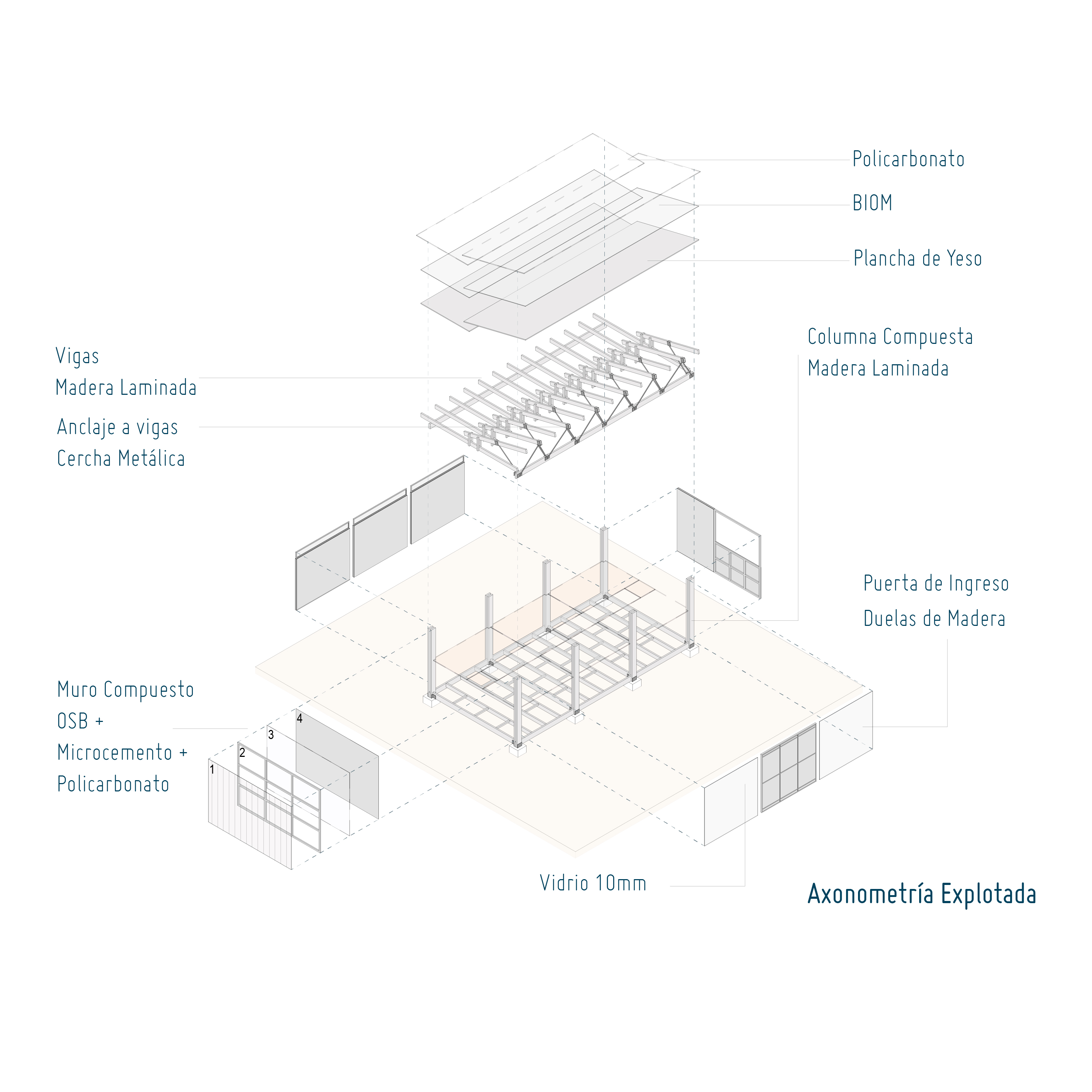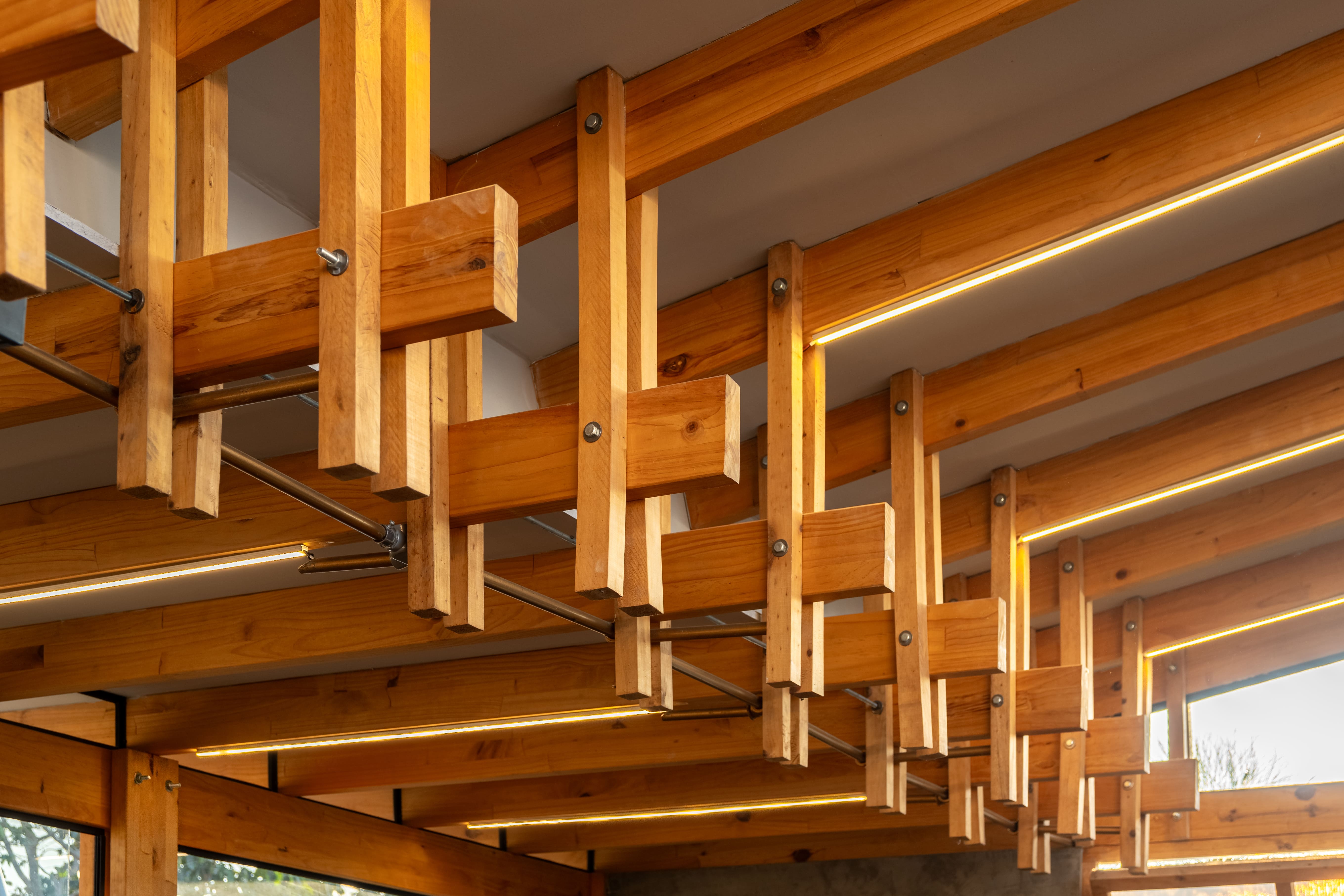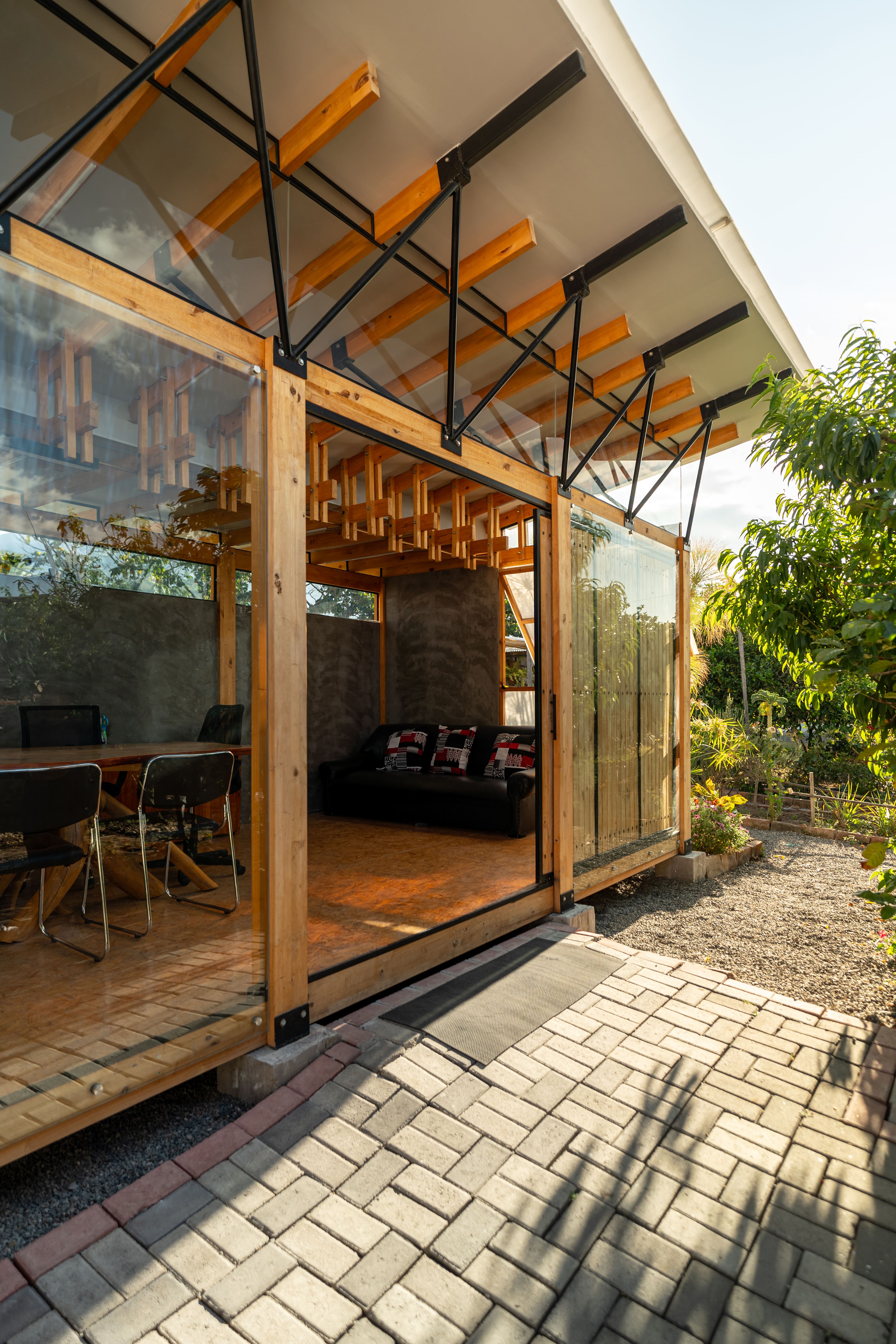 Taller Atemporal emerges as a conscious and flexible architectural response to the complexities of today's urban landscape. Set in a residential context, the project aims to establish a harmonious dialogue between the building and its surroundings, adopting sustainable strategies and innovative practices that minimize its environmental impact. Its conception integrates principles of convergence between architecture and landscape, where the built space is not seen as an isolated object but as an extension of the environment, enriching and respecting the local identity. This 18 m² space is designed to serve multiple functions: coworking, showroom, project workshop, and primarily our architecture office. The versatility of its spatial configuration allows these activities to coexist without formal alterations, reflecting a design approach that prioritizes adaptability. Through minimalist architecture, Taller Atemporal fosters a more human interaction with the surrounding natural environment, reducing its ecological footprint during construction and in its later use. The project's structure is a single open space where the roof plays a key role, functioning not only as a structural element but also as a visual and symbolic resource that unifies the space. By elevating the roof to a hierarchical plane within the design, the floor plan is freed, allowing natural light to flood the interior and act as the primary element defining the spatial experience. This treatment of light reinforces the relationship between the living space and the exterior landscape. In terms of construction, the project combines materials that promote a balance between functionality, aesthetics, and sustainability. Laminated wood, the central material of the structure, stands out not only for its low environmental impact but also for its ability to create a warm, natural atmosphere. This material, sourced from certified responsibly managed forests, offers durability and energy efficiency, and its prefabrication speeds up construction time and reduces costs, in line with