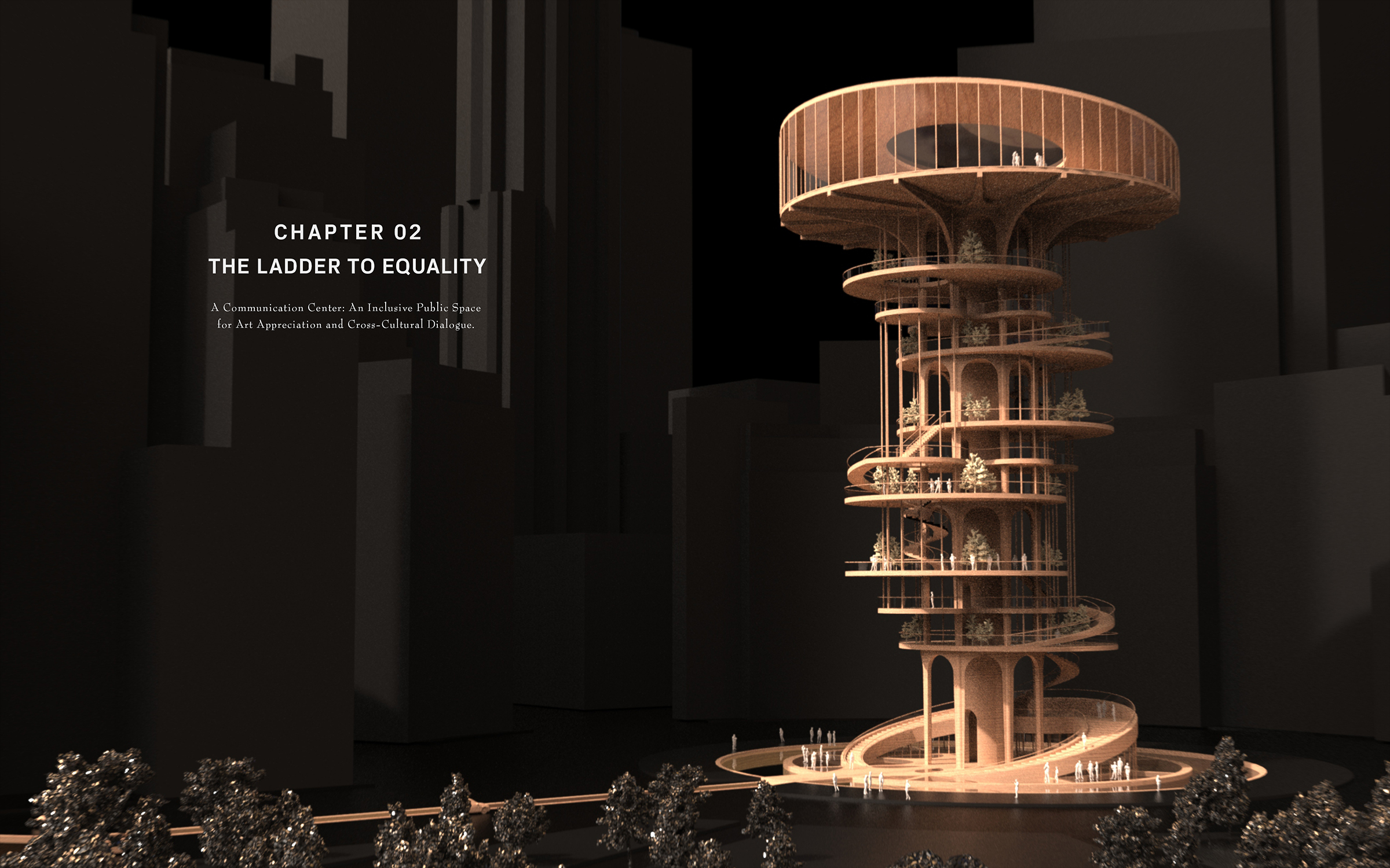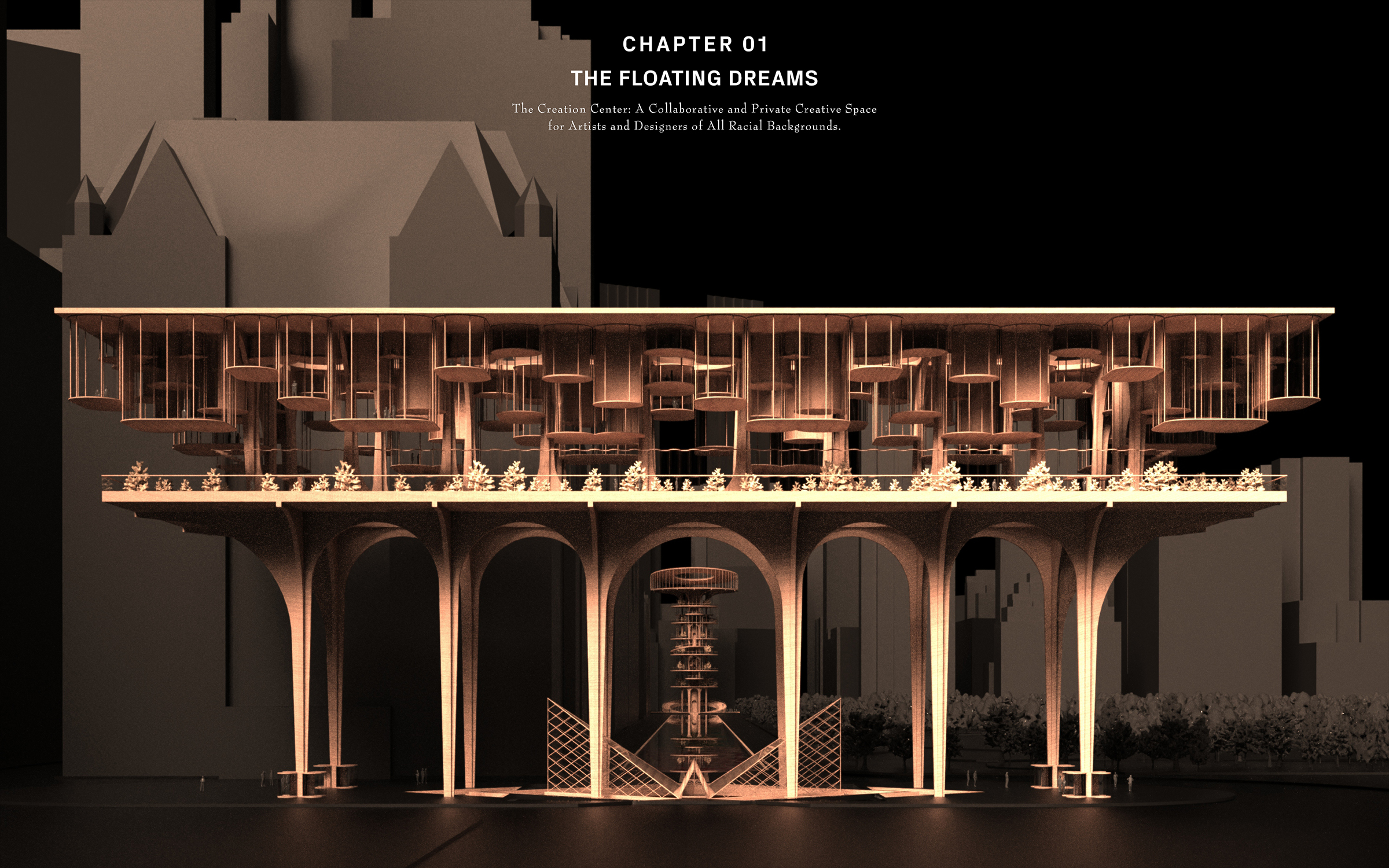 The 21st Century Arts Center for Equality The 21st Century Arts Center for Equality is an architectural response to the racial reckoning. Conceived as a critique and blueprint, it embeds inclusivity, equity, and representation into design practice. Three interlinked chapters shape the project: The Floating Dreams, a collaborative creation centre for artists of all backgrounds; The Ladder to Equality, a public gallery fostering cross-cultural dialogue; and The Healing Wound: 01. The Floating Dreams – Creation Centre A collaborative and private space for artists and designers of all racial backgrounds to create, experiment, and exchange ideas. 02. The Ladder to Equality – Communication Gallery An inclusive public arena for art appreciation and cross-cultural dialogue, dismantling barriers between creators and audiences. 03. The Healing Wound – Subterranean Urban Museum A monumental underground museum extending 800 meters beneath Manhattan and spanning 20-60 meters in width. Positioned between the two symbolic structures, it is crowned by a 700-meter-long glass roof subtly overlaying West 59th Street. This minimal footprint above ground asserts a bold social presence below, offering a commemorative and ceremonial space for reflection on racial equality. Like the enduring wound of inequality in American history, The Healing Wound embodies both remembrance and hope - transforming a collective scar into an optimistic vision of a more just cultural future. More than a building, this landmark transforms a collective scar into a shared hope, offering an immersive, commemorative journey toward a more just cultural future.