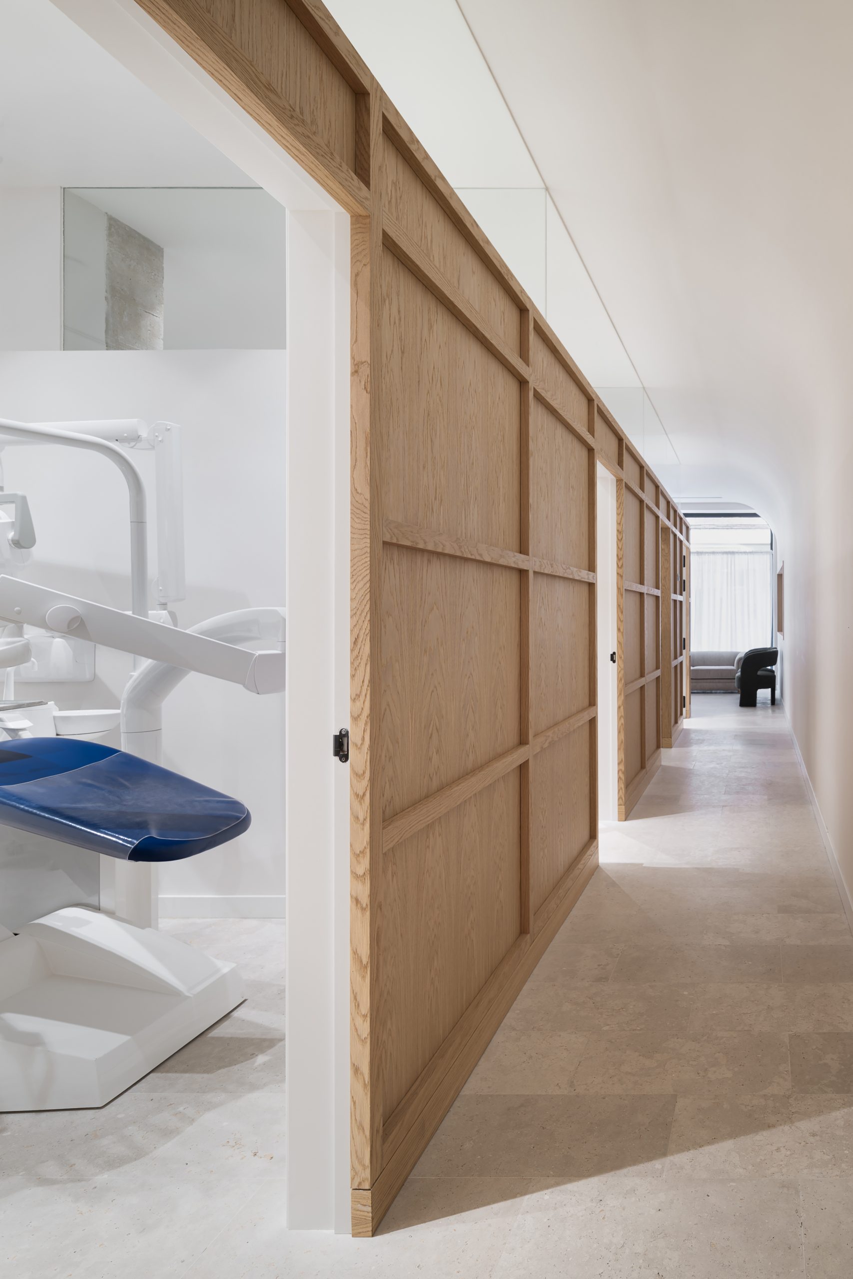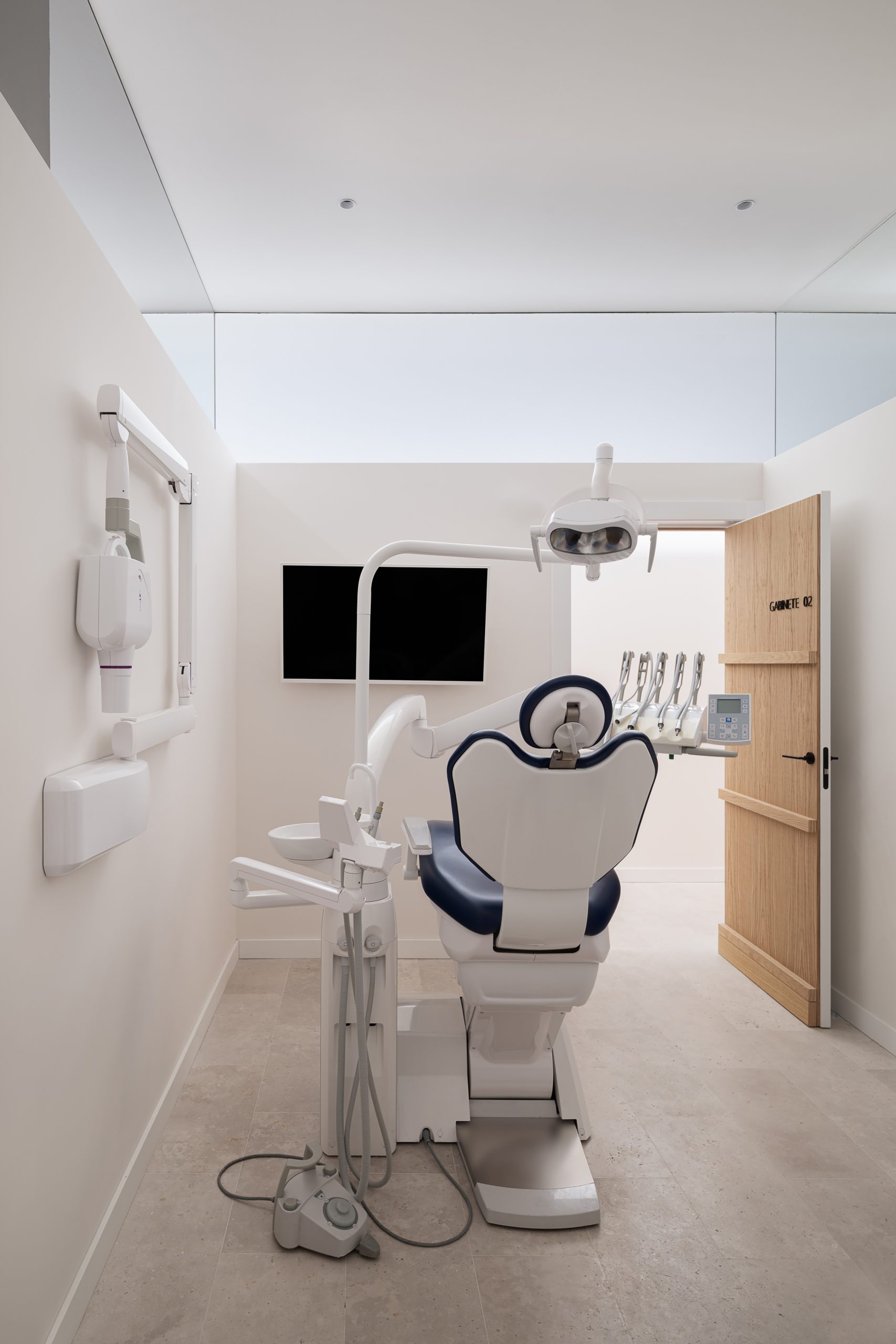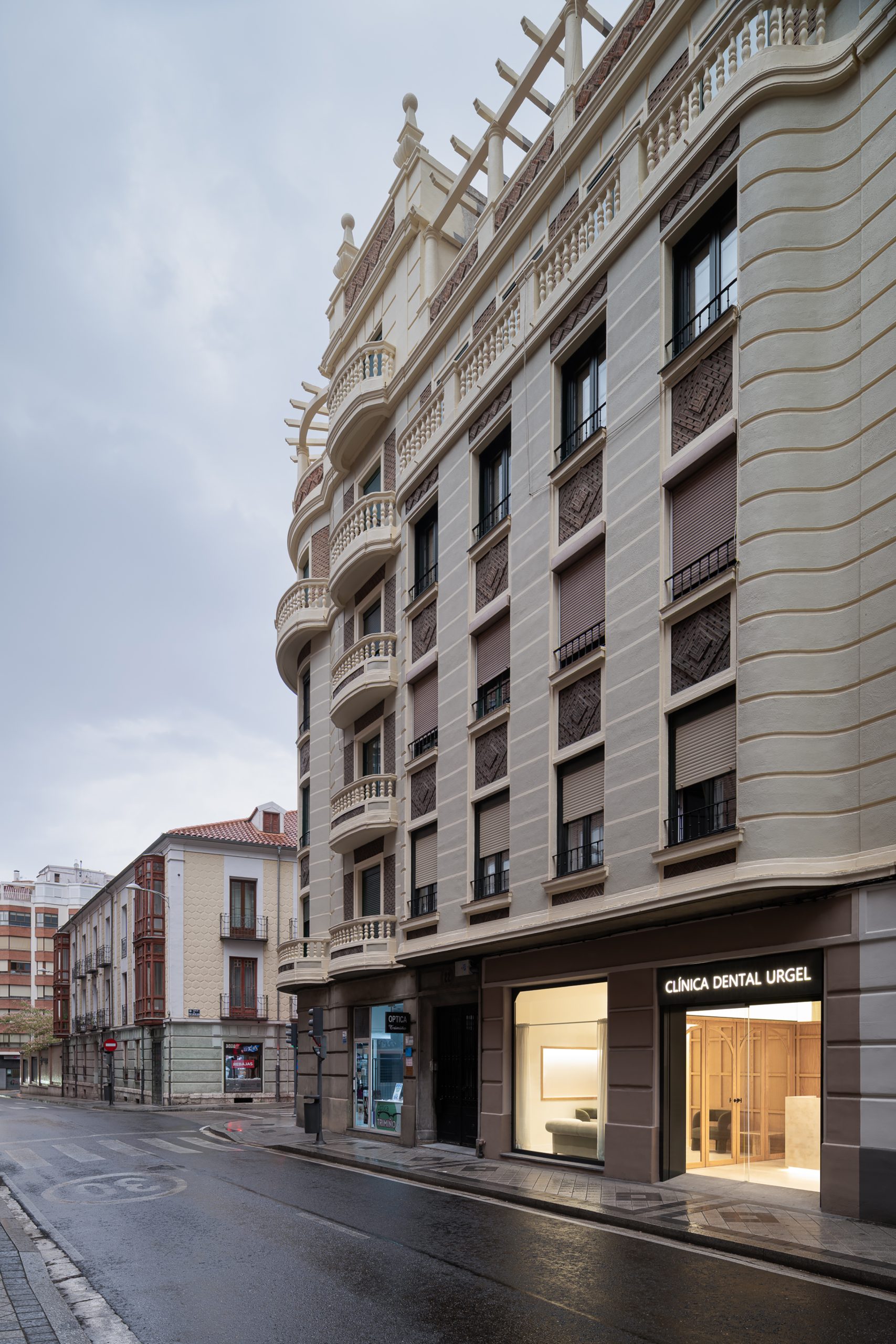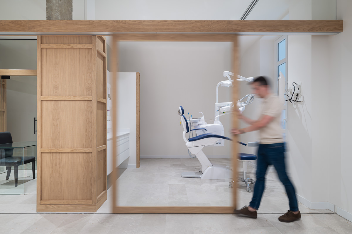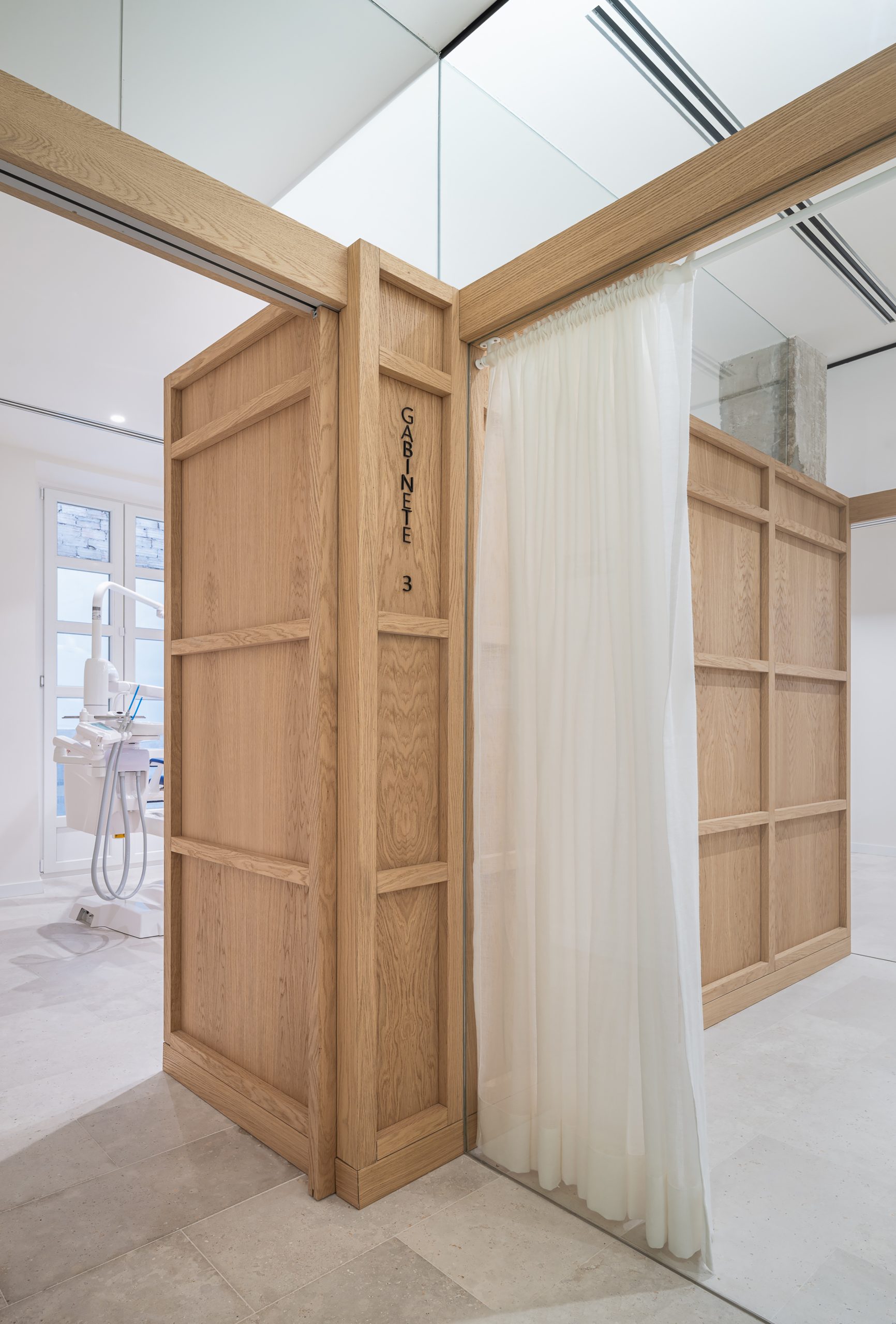 Este proyecto parte de la intervención integral en un local de proporciones estrechas y alargadas, cuya morfología planteaba retos significativos en cuanto a espacio e iluminación. La propuesta arquitectónica responde con un interior diáfano, articulado en torno a un volumen principal que delimita la zona de trabajo de la clínica y organiza el resto de los espacios funcionales. El volumen central, uno de los elementos protagonistas del proyecto, está revestido con paneles de madera de roble, diseñados con casetones que, junto con la bóveda del falso techo, aportan un carácter clásico y elegante, en sintonía con la imagen sobria que se buscó para el conjunto de la clínica. Uno de los principales objetivos del diseño fue potenciar la profundidad del local mediante estrategias espaciales y materiales que aportaran una identidad propia al proyecto, en línea con la voluntad del promotor, Ricardo Urgel Menéndez. La cuidada selección de materiales refuerza esta identidad arquitectónica en el contexto de una clínica dental en Valladolid.