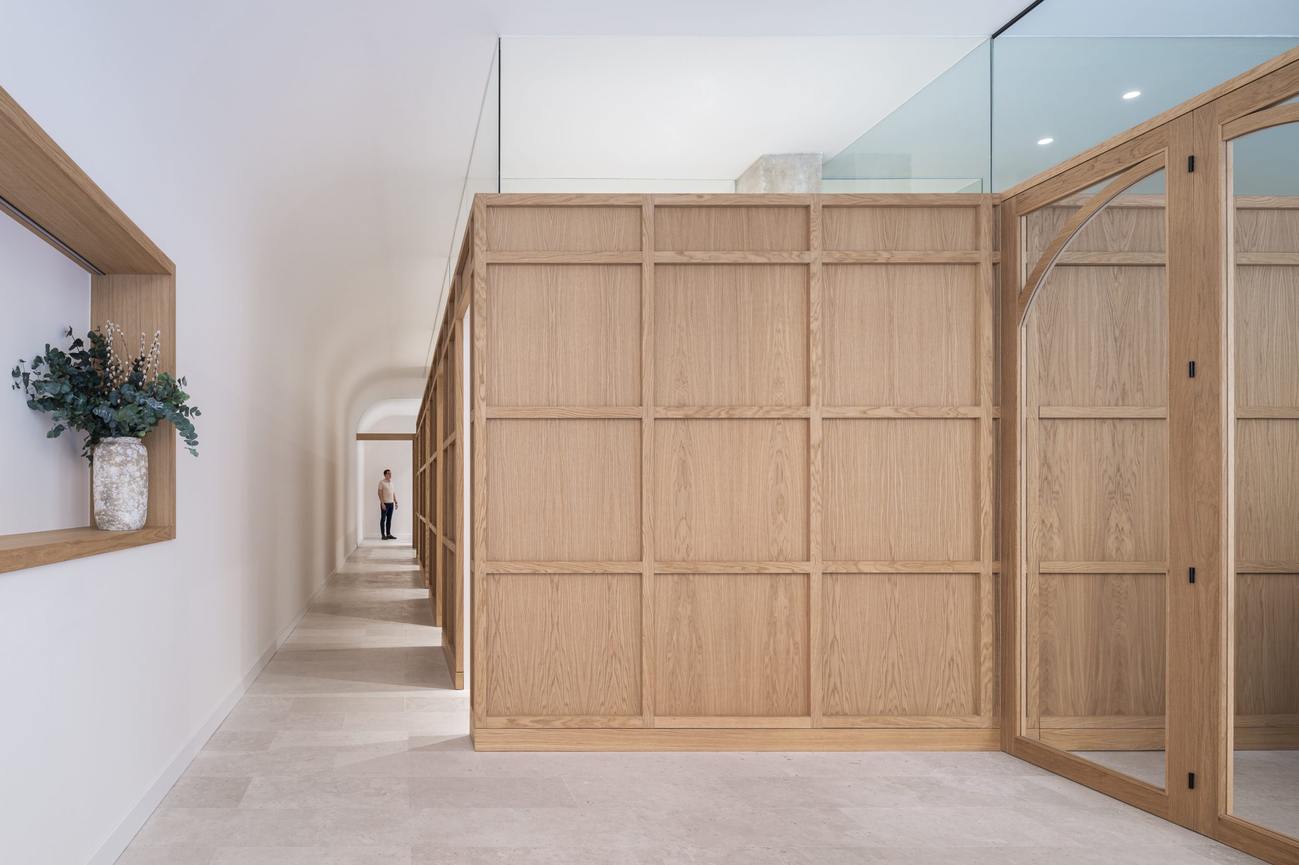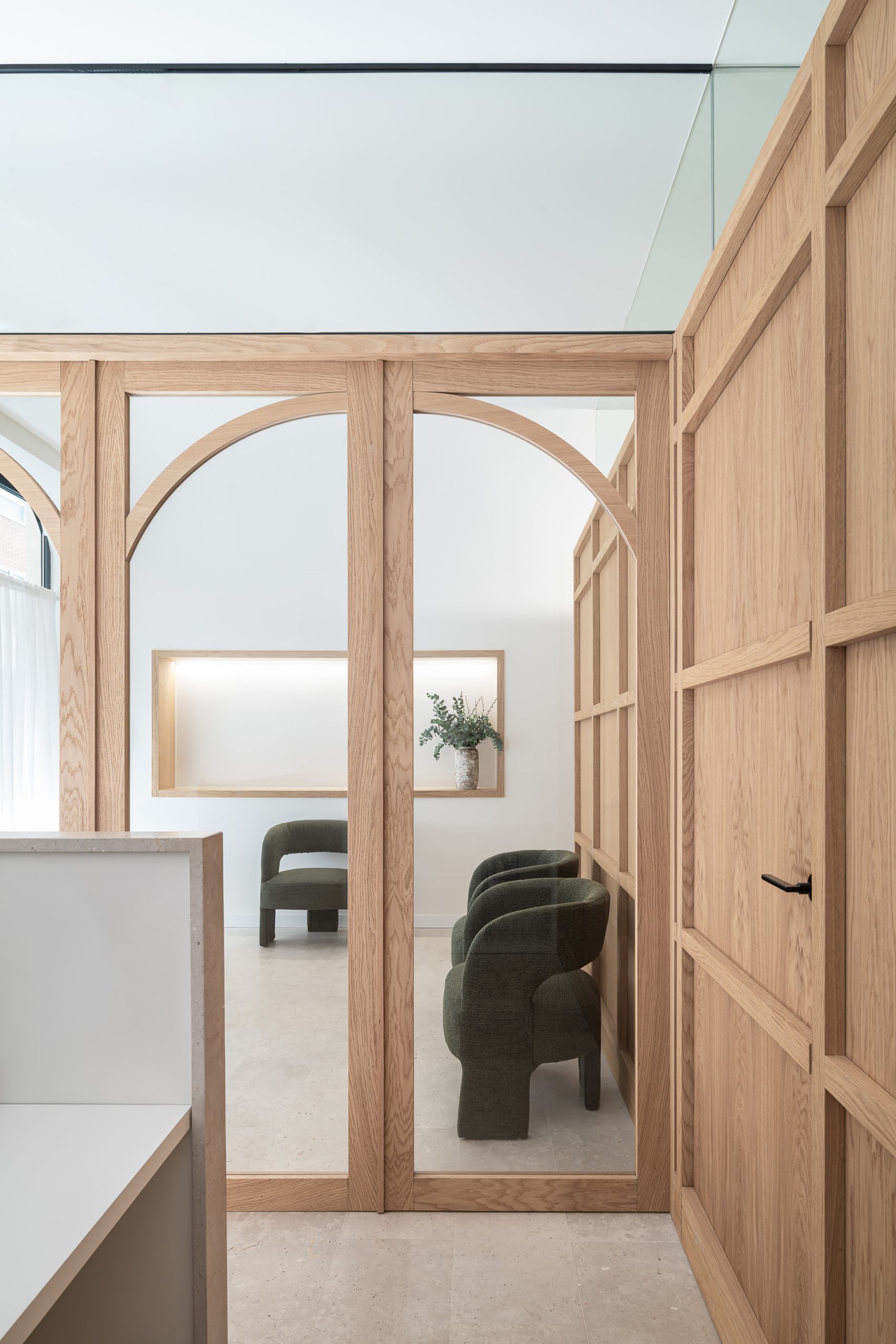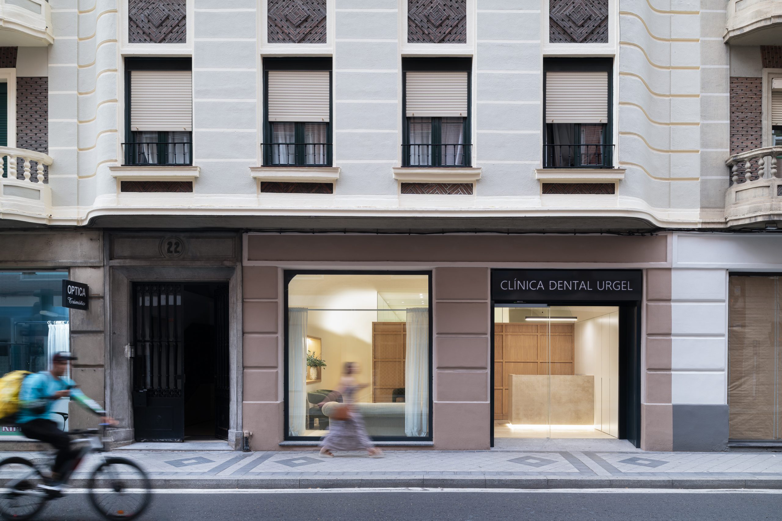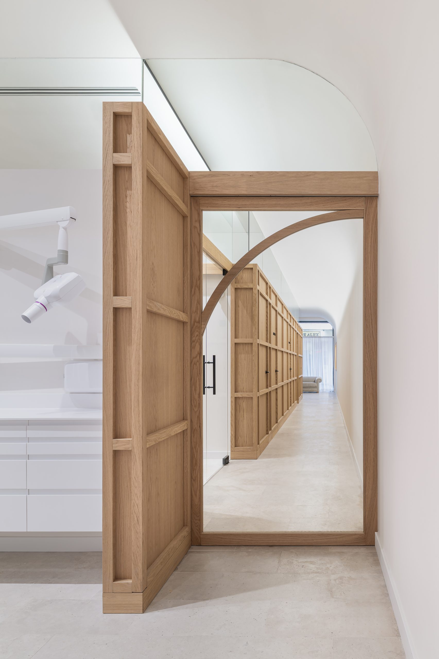 Este proyecto parte de la intervención integral en un local de proporciones estrechas y alargadas, cuya morfología planteaba retos significativos en cuanto a espacio e iluminación. La propuesta arquitectónica responde con un interior diáfano, articulado en torno a un volumen principal que delimita la zona de trabajo de la clínica y organiza el resto de los espacios funcionales. El volumen central, uno de los elementos protagonistas del proyecto, está revestido con paneles de madera de roble, diseñados con casetones que, junto con la bóveda del falso techo, aportan un carácter clásico y elegante, en sintonía con la imagen sobria que se buscó para el conjunto de la clínica. Uno de los principales objetivos del diseño fue potenciar la profundidad del local mediante estrategias espaciales y materiales que aportaran una identidad propia al proyecto, en línea con la voluntad del promotor, Ricardo Urgel Menéndez. La cuidada selección de materiales refuerza esta identidad arquitectónica en el contexto de una clínica dental en Valladolid.