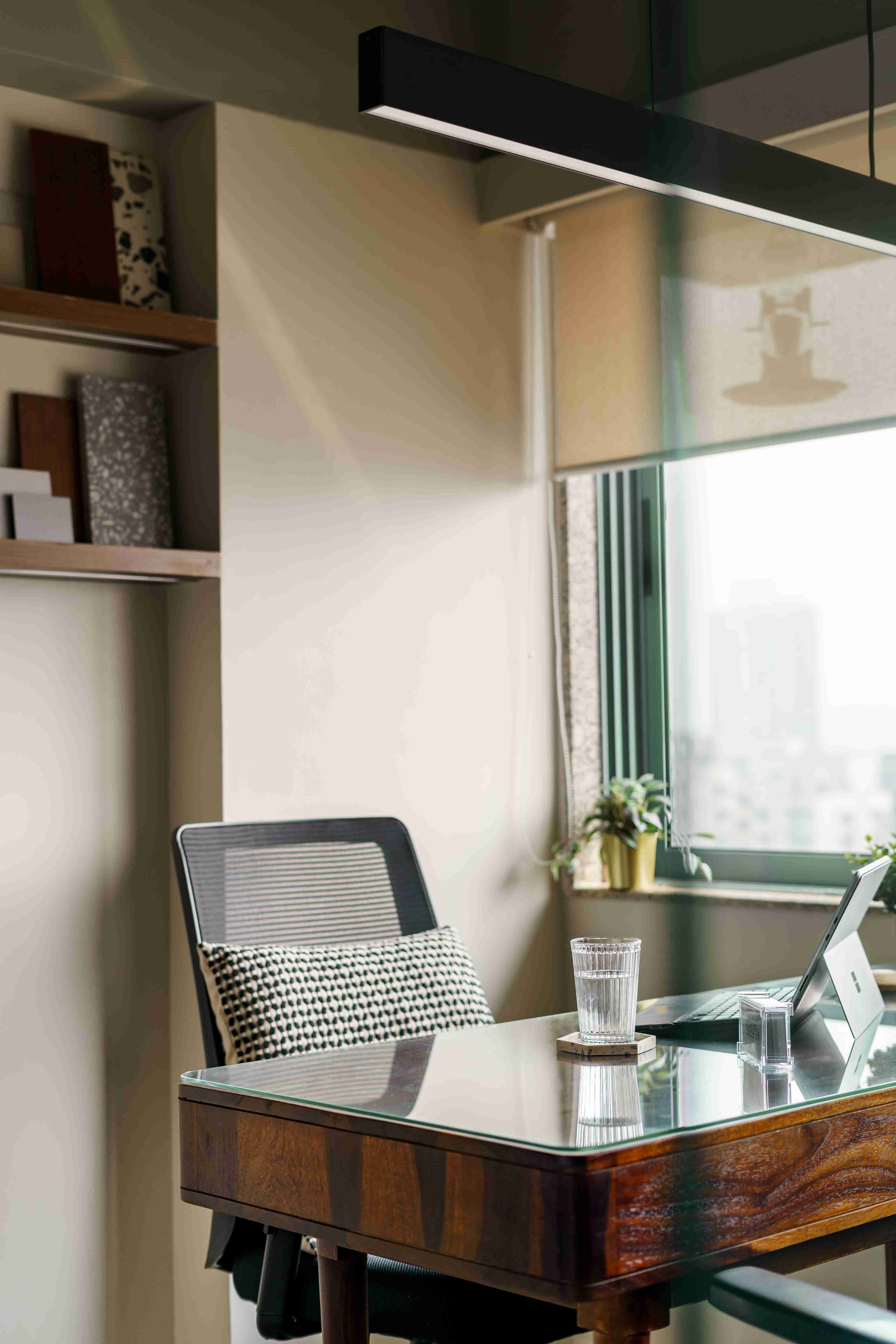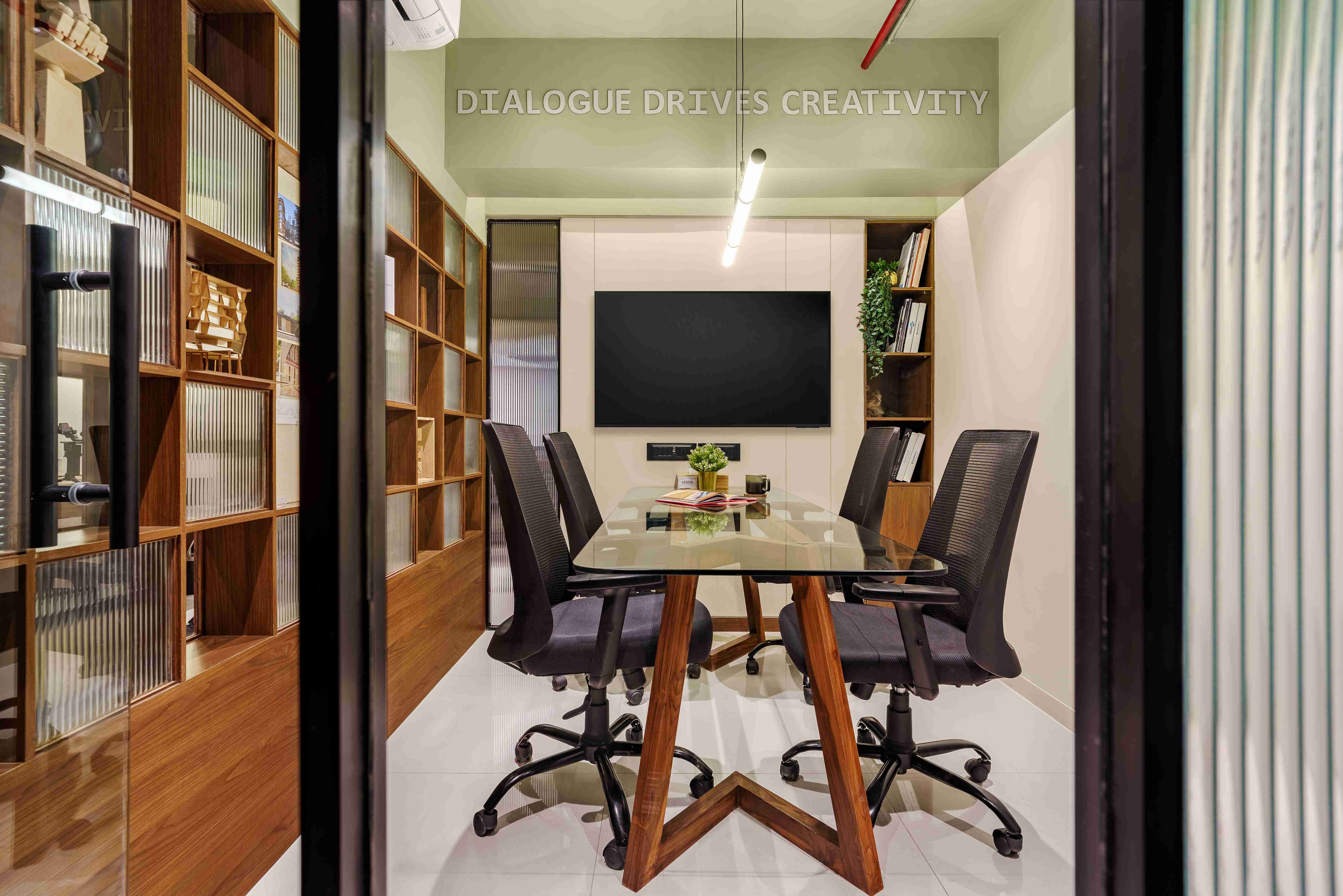 Perched above the steady hum of Mumbai, the Kenzen Headquarters is not a space that demands attention but one that invites reflection. Designed by Kenzen Architects for themselves, it serves as both studio and statement, capturing the spirit of how the team works, thinks, and creates. The brief was personal and introspective. The studio had to support deep focus, foster collaboration, and reflect values of simplicity, warmth, and precision. Rather than chasing trends, the design began with fundamental questions: How should we feel here? How do we move, pause, and create through the day? The answers shaped a workplace functional yet emotionally attuned. The spatial layout flows with clarity. An understated entrance with a compact wooden desk and a quiet waiting nook sets a grounded tone. The conference room, veiled in fluted glass, balances openness and privacy, anchored by a round walnut table. A subtle etching on the glass, “Dialogue drives creativity,” frames the room’s purpose. The main workspace forms the heart of the studio. A long timber desk encourages rhythm between collaboration and solitude, while black shelves display books, models, and samples. A sage green wall, inscribed with “God is in the details,” anchors the space as a living mantra. A central wooden wall of niches divides and connects, acting as storage, display, and light filter. Private cabins along the glazed edge offer quiet focus with timber furniture, soft rugs, and muted green ceilings. Even the printing corner, hidden behind fluted glass, is designed with care. Materials and colors remain calm and grounded: natural wood, fluted glass, black metal, muted greens, and warm whites. Every detail is chosen for longevity and feel. Kenzen Headquarters is not about performance but about creating conditions for thoughtful work, a studio that listens to itself and quietly sustains its people.