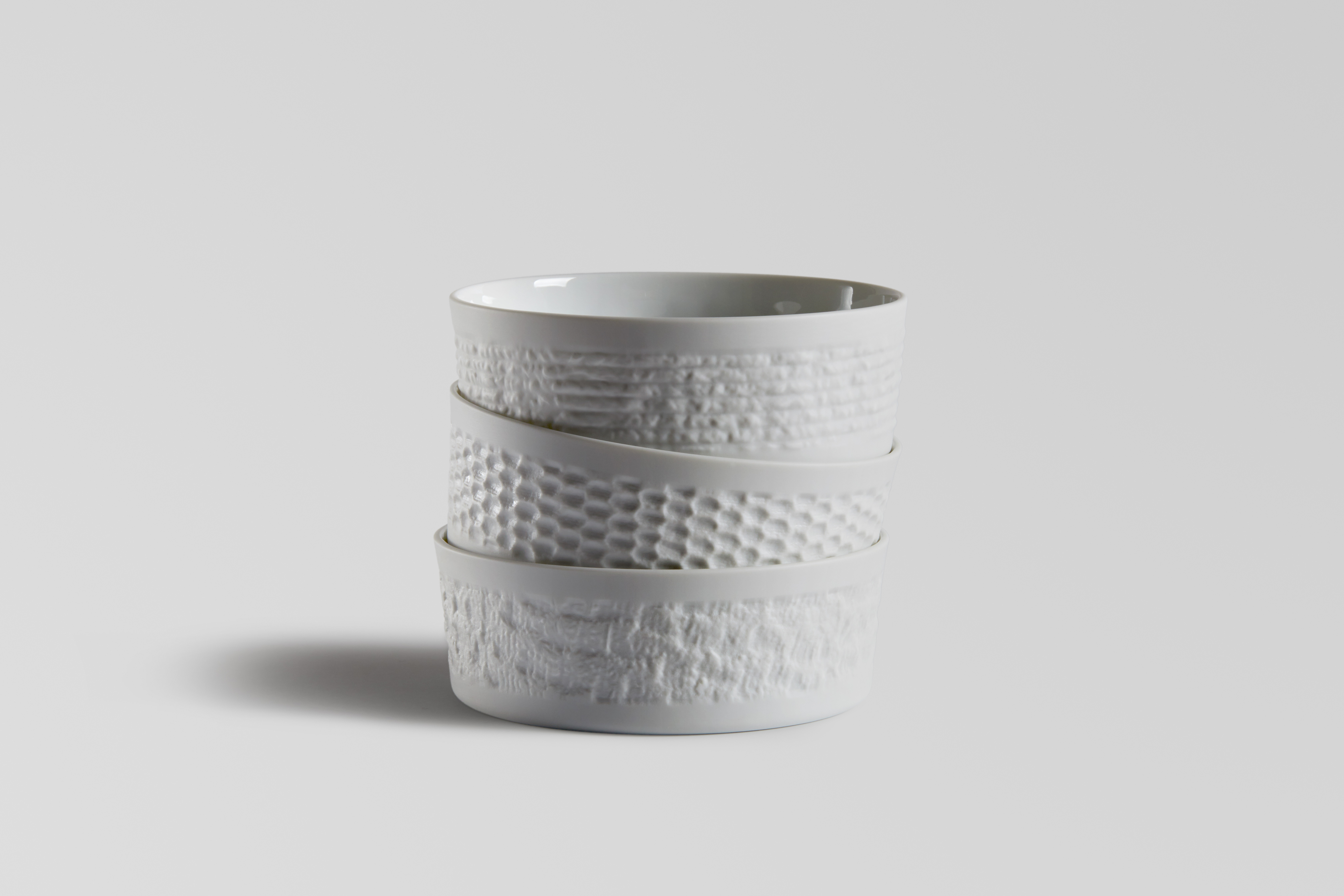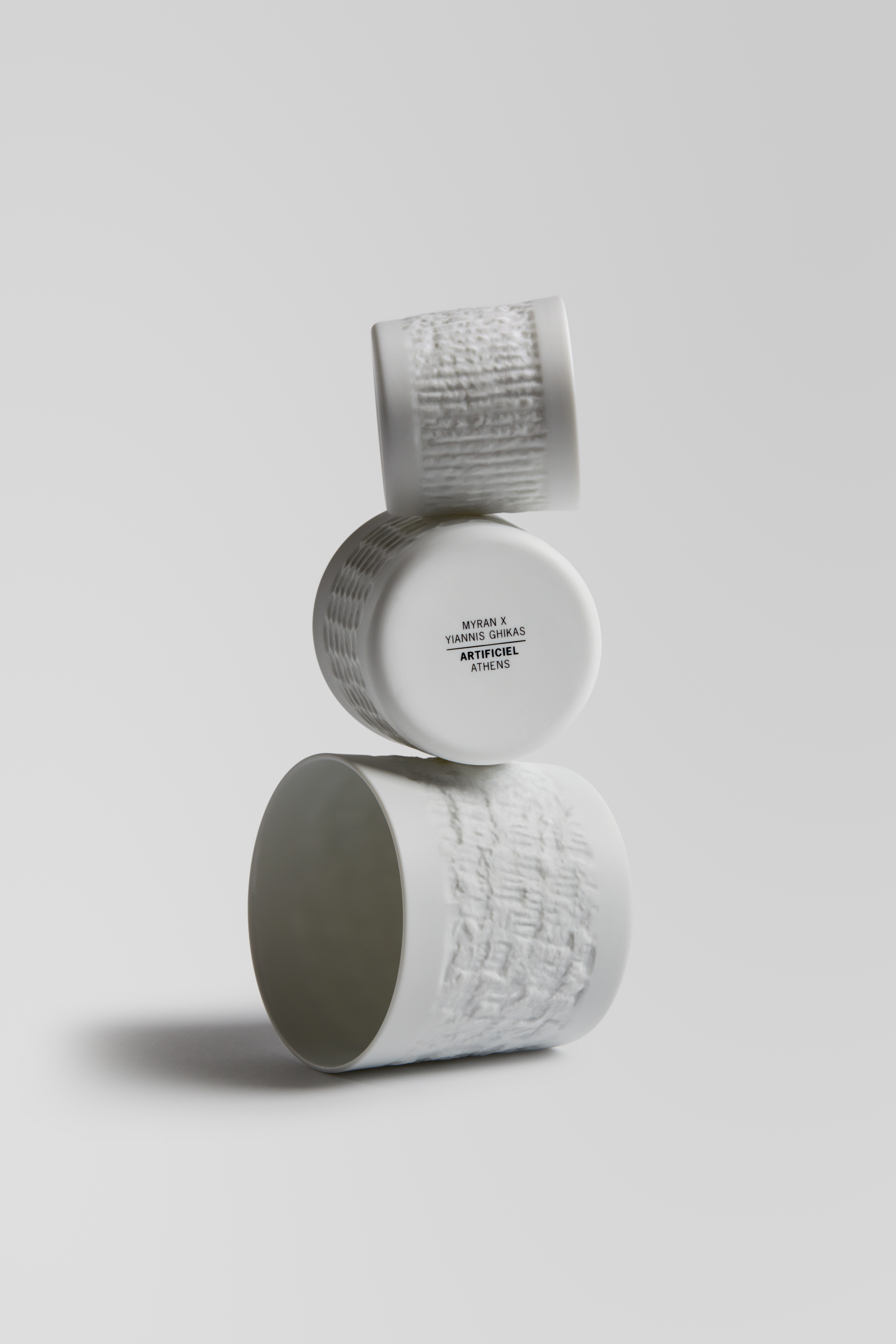 Artificiel is the common name of the sculptural treatment of plaster, which was widespread in the Athenian apartment buildings of the 20th century. The technique, the result of painstaking work by the “pelekanos”, as the builders were called who worked on the exterior facades of apartment buildings, was gradually abandoned around the 1970s and today its material imprint is in danger of being lost forever: The new energy efficiency regulations for buildings will lead to the progressive removal of Artificiel surfaces and their replacement with thermal insulation. The loss to the image and feel of the city will be incalculable. Designer Yiannis Ghikas captured the facades of apartment buildings in the centre of Athens with 3D scanning and incorporated the characteristic designs of Artificiel into a new collection of porcelain tableware, produced by Myran – Scandinavian Design. Walking the streets of Athens, one will observe that most buildings constructed between 1930 and 1970 are dressed in surfaces of chased cement facing, a technique colloquially known as Artificiel. This “skin” of the city, at places well-preserved, but most often, visibly worn or poorly preserved, caught my attention since quite some time. The scale of application of this technique in Athenian buildings is so ubiquitous that, if there were one texture to stand as signature feature of the city, it would be the texture of those Artificiel. If I had to choose one characteristic trait of Athens to incorporate in my design work, then I would clearly choose artificiel; which is what I did.