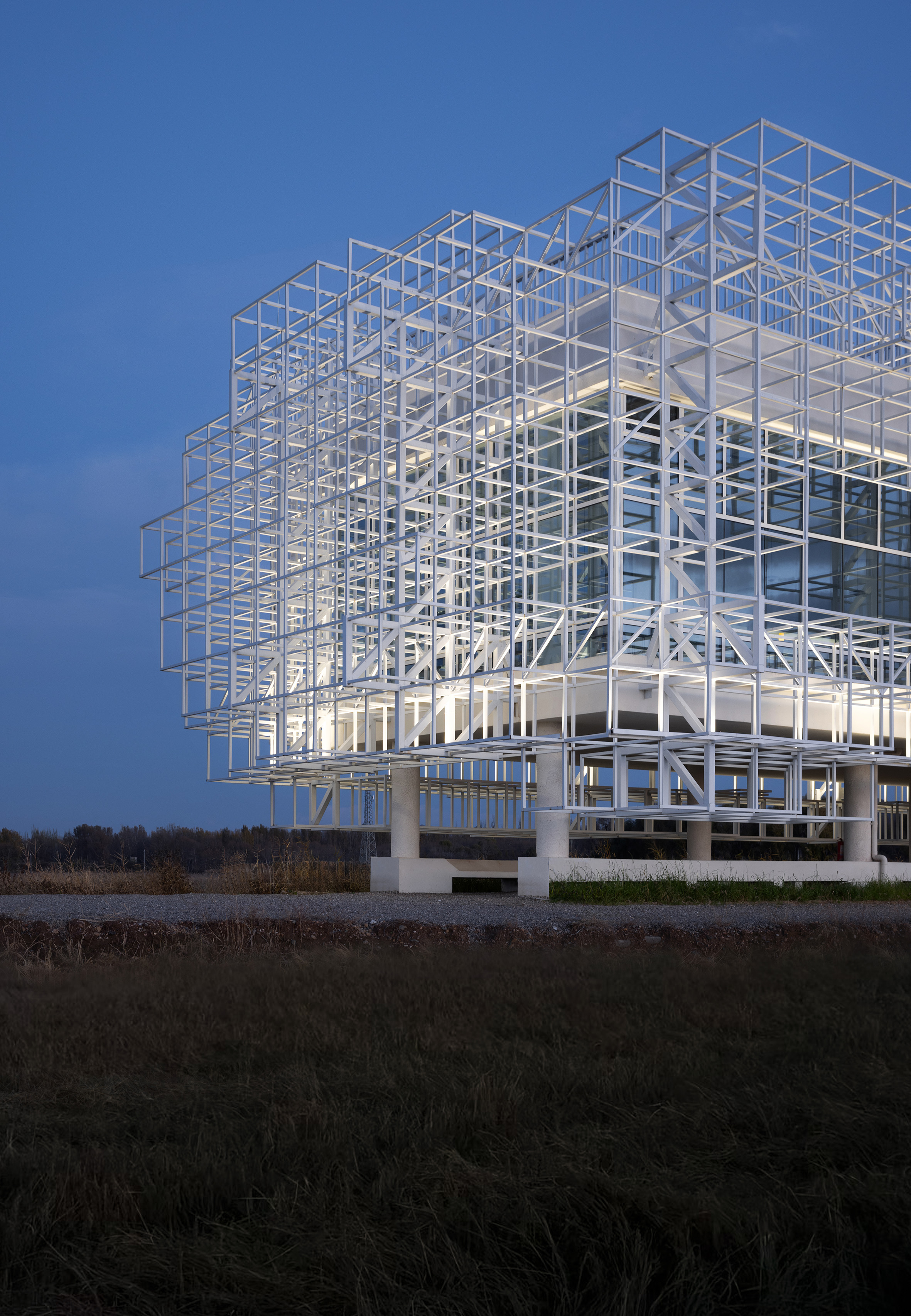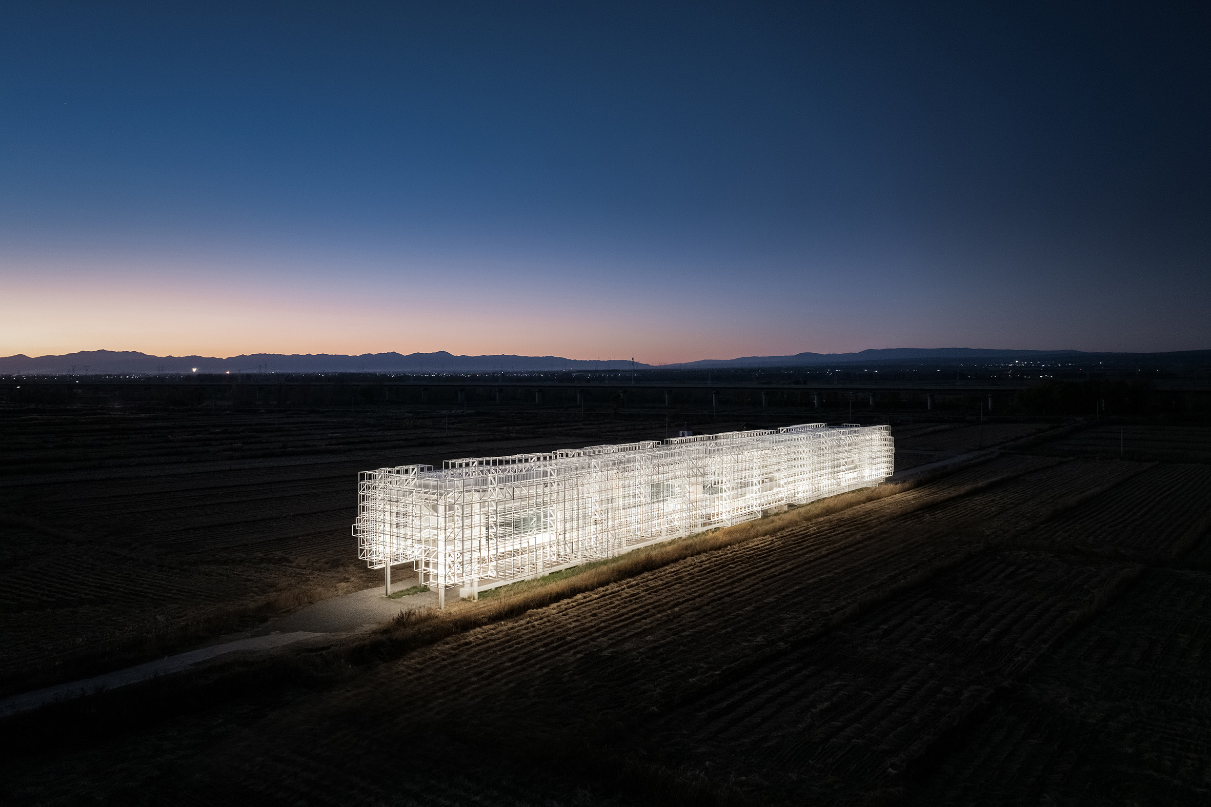 This building is situated in an open field, with a robust concrete structure enveloped by a metal steel framework. By skillfully integrating light and space, we have accentuated the building’s transparency and lightness, transforming it into a vessel of light. For the lighting design, we selected fixtures with different wattages and beam angles, including 36W with a 10° beam and 48W with a 30° beam. These fixtures were seamlessly integrated into the steel framework using an uplighting approach, with various projection directions explored. Compared to the softer interior illumination, the uplighting for the steel framework is slightly more pronounced, enhancing the sense of depth and creating a delicate balance between transparency and lightness. This interplay results in a richer and more dynamic visual hierarchy. We utilized pure 4000K white light to convey the work’s purity and tranquility. In the vast expanse of the open field, the building stands as a vessel of light, infusing the space with a serene and profound atmosphere.
