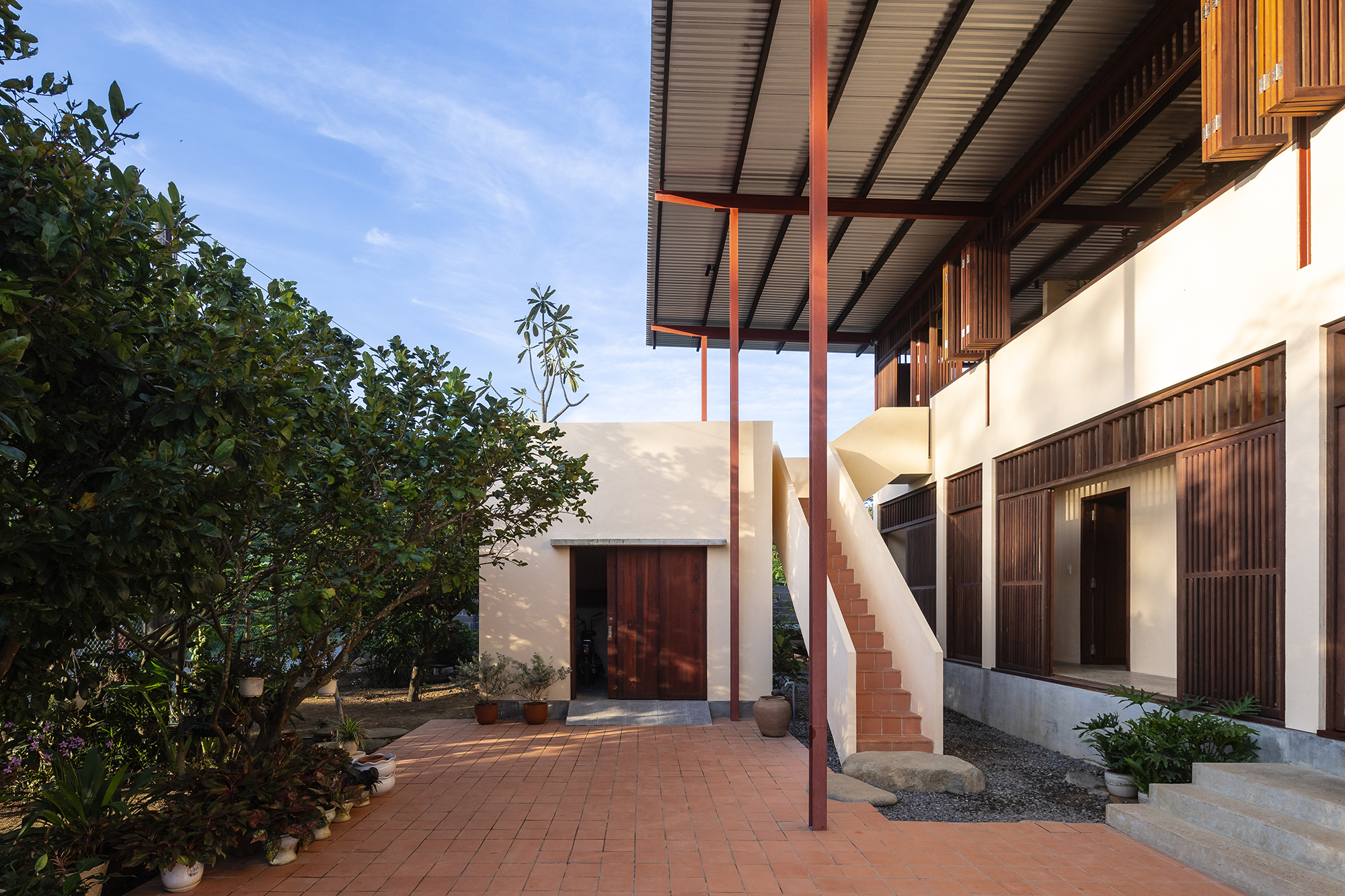 Located in Dien Khanh district, just 10 kilometers west of Nha Trang city, DB Horizon is designed to replace an old ancestral house, associated with many beautiful memories. The house is a seamless blend of contemporary living with vernacular design principles, prioritizing natural ventilation, passive cooling and harmonious connection with the surrounding natural environment. The main goal of the project is to create a multi-generational home that balances privacy and social interaction. The house is hierarchical and divided into distinct zones while maintaining a smooth transition between indoor and outdoor areas: The common spaces are brought to the first floor, while the private bedrooms are located on the ground floor. Visitors do not enter the house directly, but instead ascend an external staircase that leads to the living room and an outdoor terrace on the first floor. Stepping inside, a cluster of functional spaces (worship area, kitchen and storage) creates a subtle boundary between the guest area and the private area of the family. The first floor serves as the living center with a living room, kitchen, dining area, worship space, common living space and terrace. All are thoughtfully arranged to promote family gatherings and maintain cultural traditions. An internal staircase serves as a private connection between the bedrooms on the ground floor and the open living area above. In addition, an outside garage to minimize noise and dust from vehicles. The 360-degree windows on the first floor enhance the connection with nature, providing abundant daylight while maximizing cross-ventilation. A thick metal roof with a moderate slope extends outward, providing shade, rain protection, and a transitional space between levels. The wooden door system with openings above ensures a continuous airflow, contributing to the sustainable and energy-efficient design of the house.
