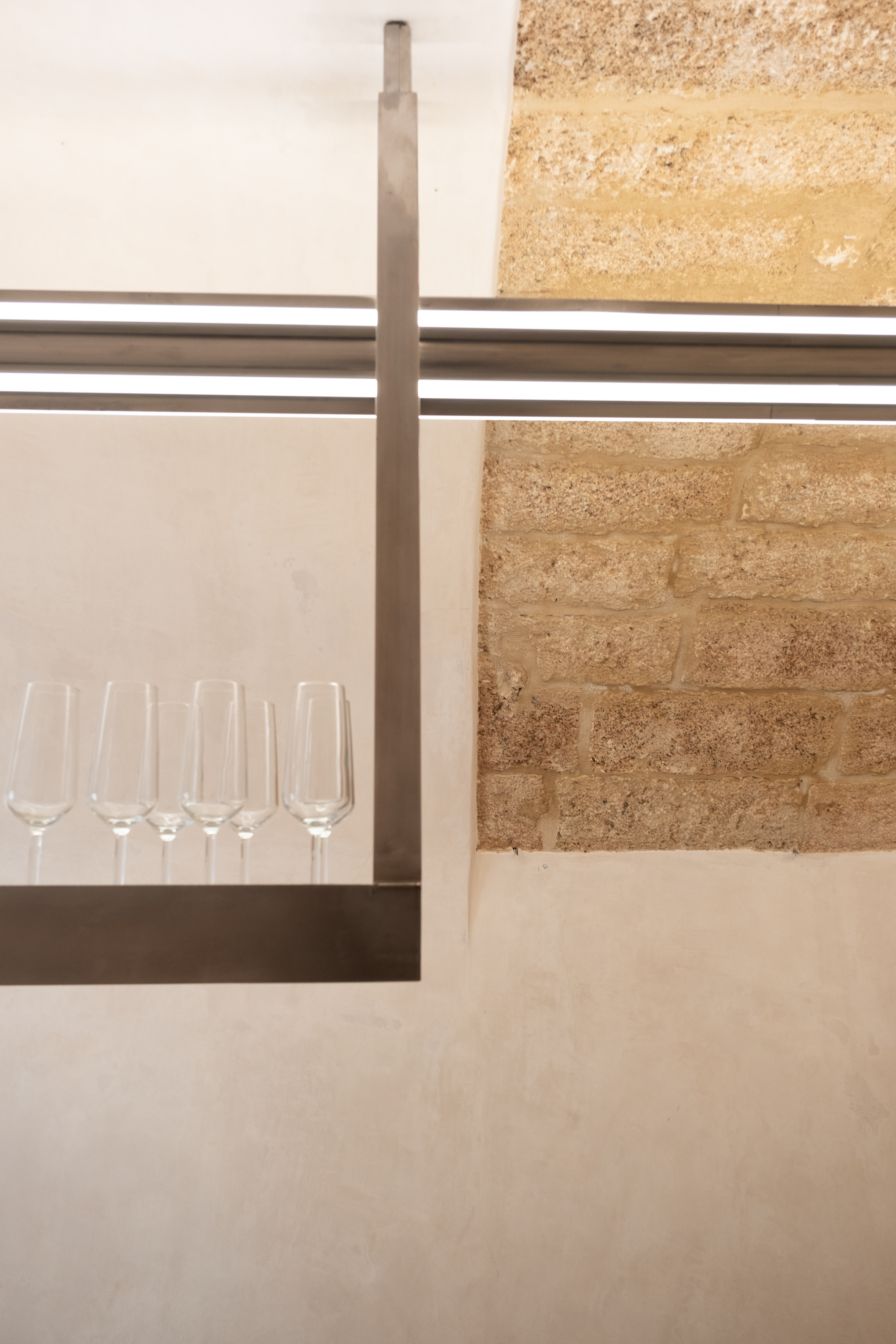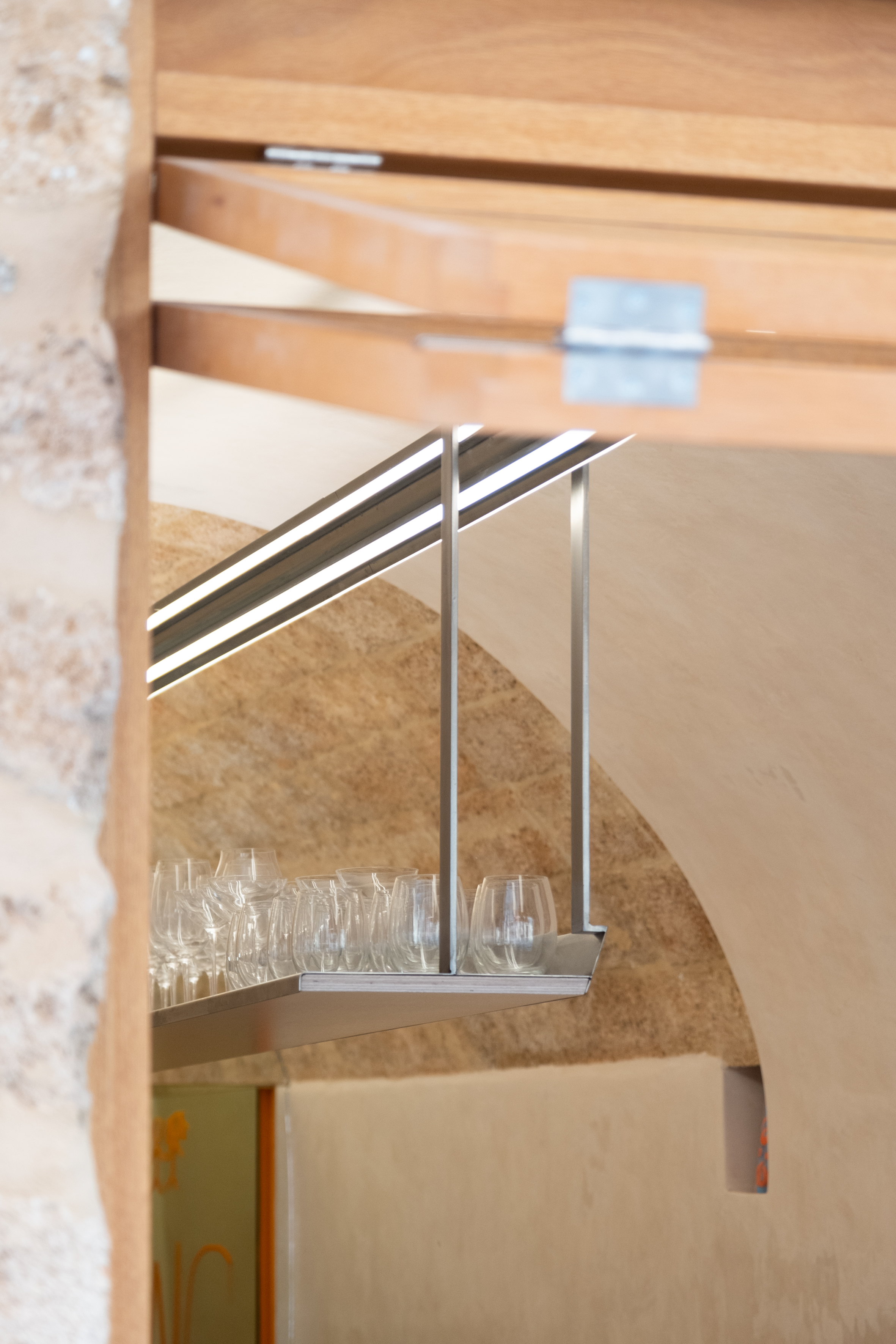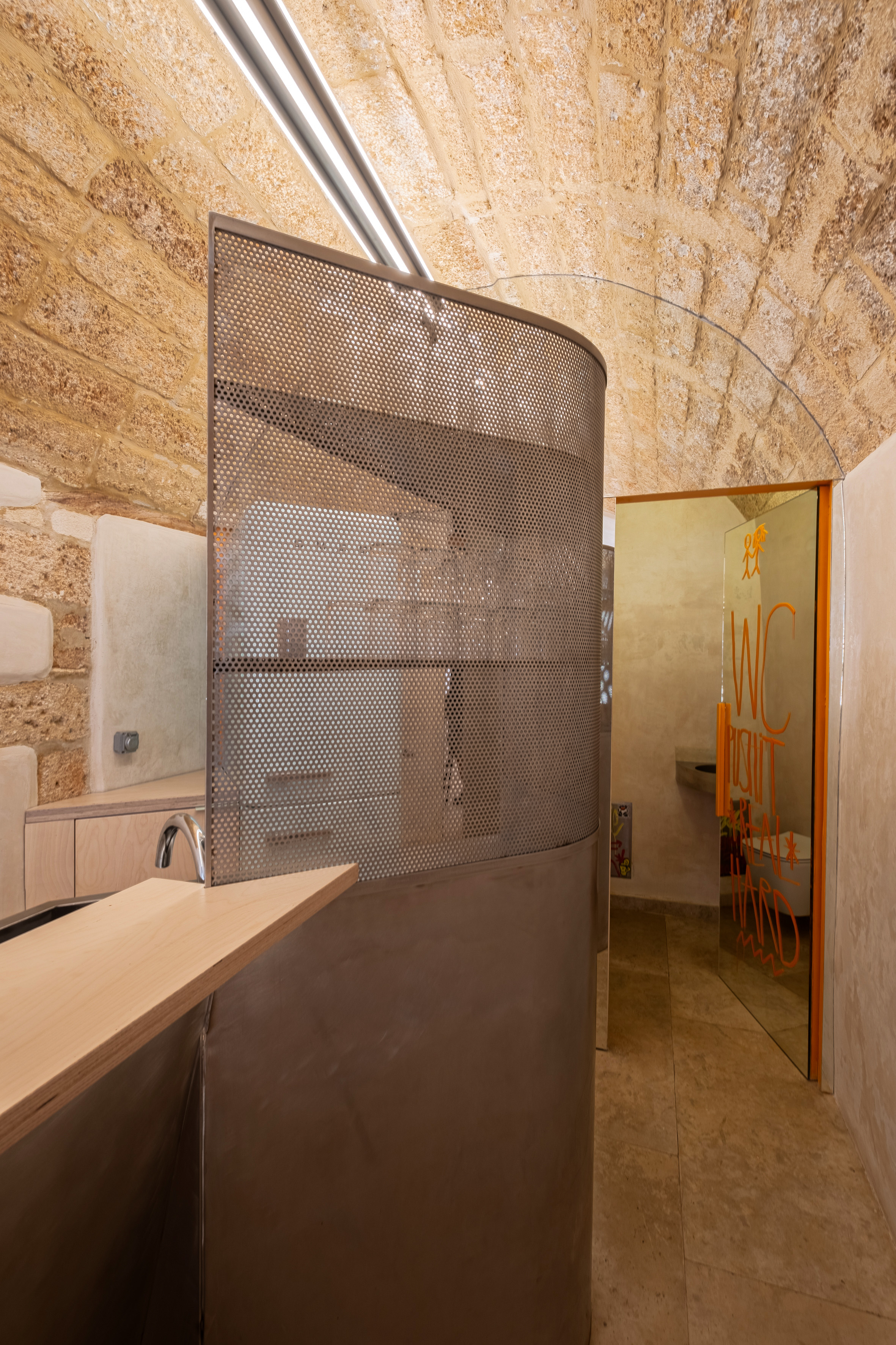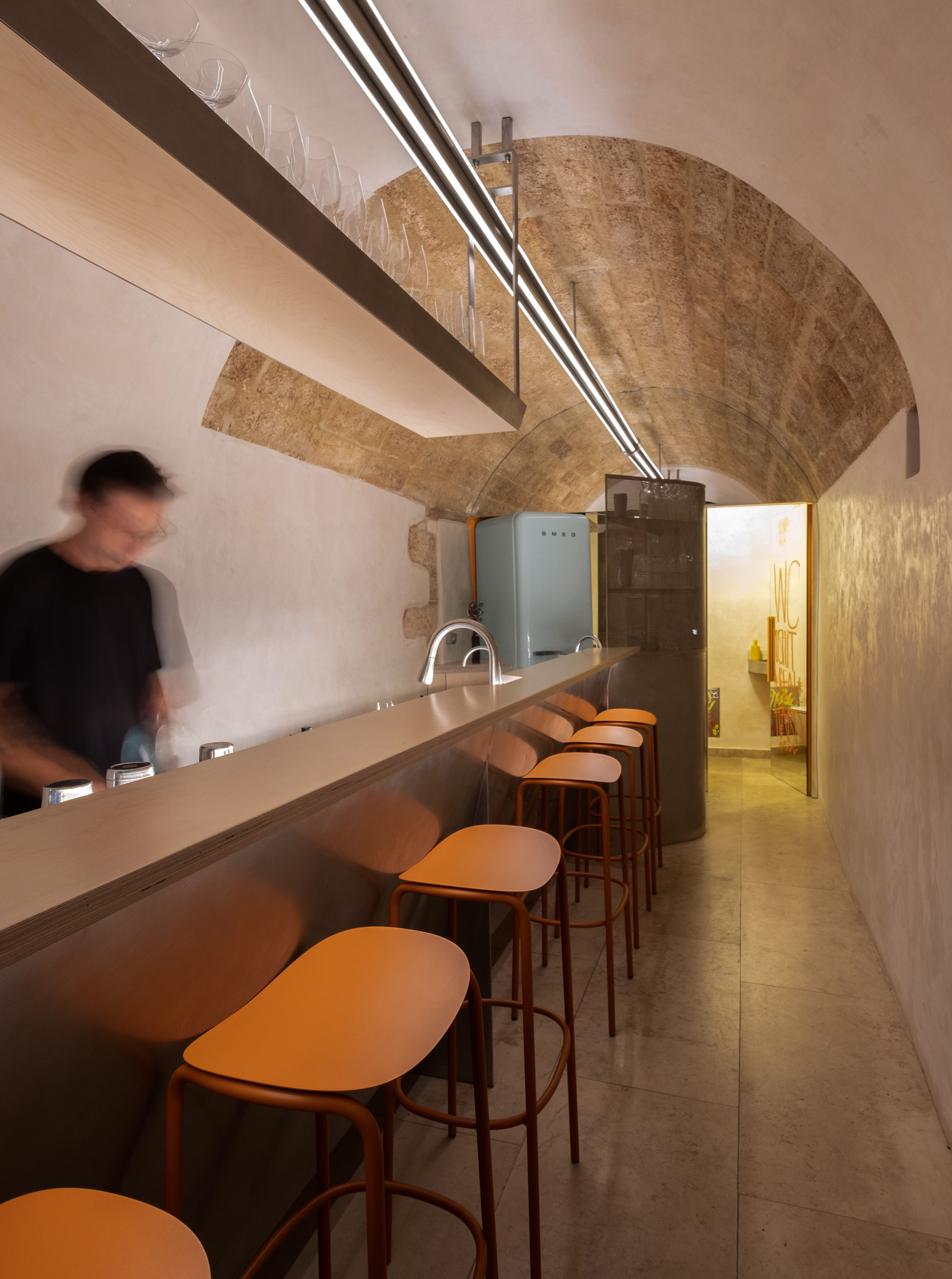 THE PROJECT The project lies within a small, linear vaulted building in the old town of Chania. This peculiar space called for a clean design that could make the best out of the limited area. The design is based on the combination of three elementary geometries. THE BAR First comes the linear bar, that runs from the outer façade to the back of the room, and splits it into two parts, accentuating the perspective of the narrow space. Its’ profile consists of a folded stainless steel sheet, which provides room both for the customers’ seats and the bars’ utilities. This custom piece incorporates all the bar’s electrical wiring and plumbing, leaving the ancient shell and the stone floor intact. The bar is complimented with a custom-made linear lighting piece, which also contains the toilet’s ventilation and runs from the back of the room to the exterior façade. THE MIRROR The second piece is a zig-zag surface at the back of the space that sets the outline of the toilet and storage. Its’ space is designed to allow the movement of the staff around the bar, and is layered with mirror panels, in order to render it “invisible” to the customer’s eyes, “enlarge” the room’s length and make its interior perspective more intense. THE CURVE Last comes the curve. At the end of the bar, a convex surface sets the path around it, while at the same time provides space for storage. It is made out of a perforated steel sheet, that filters the customer’s gaze without constituting an opaque element in this limited space. The rest of the space remains as is, with plastered walls and the vault’s stonework visible to the eye.