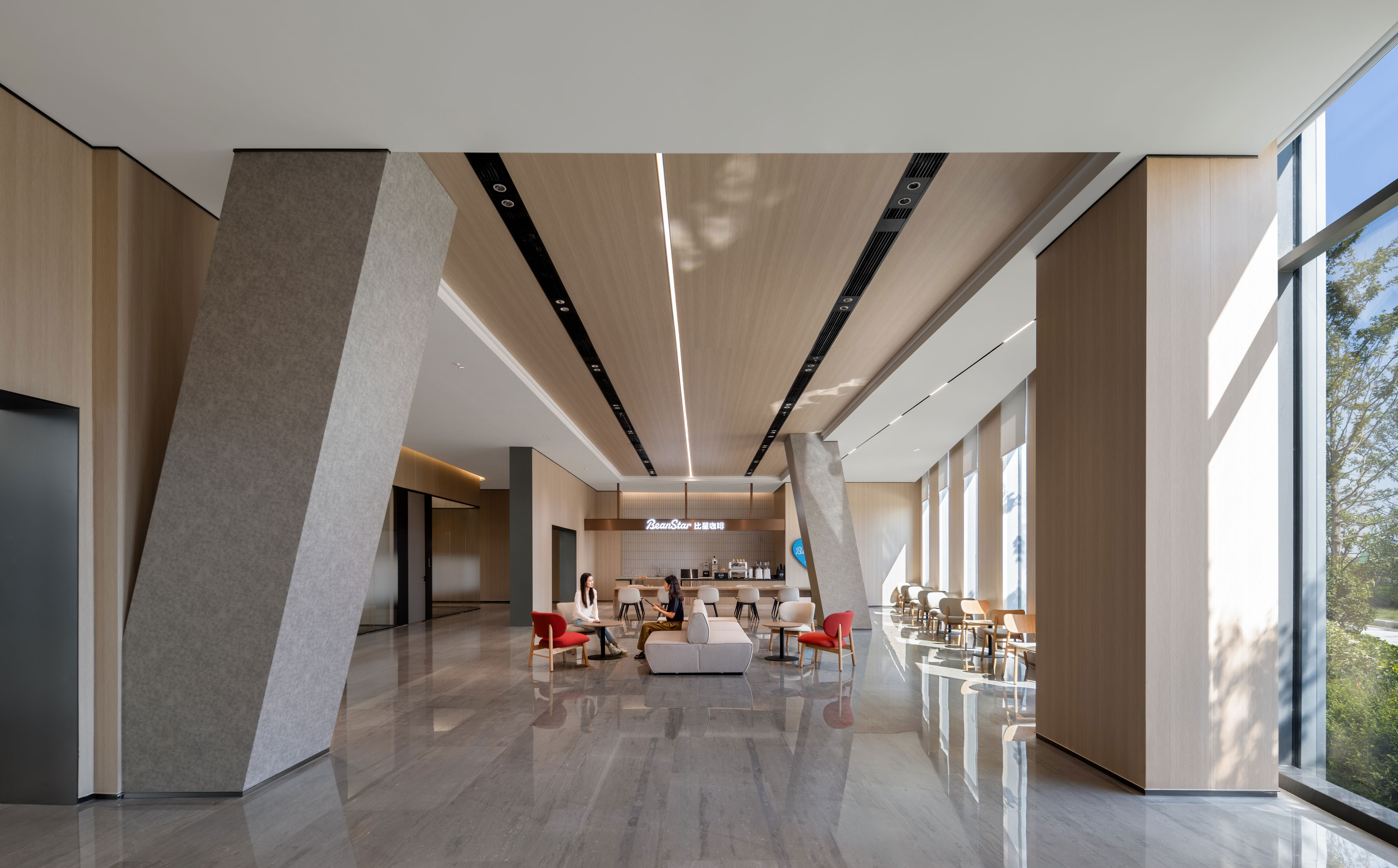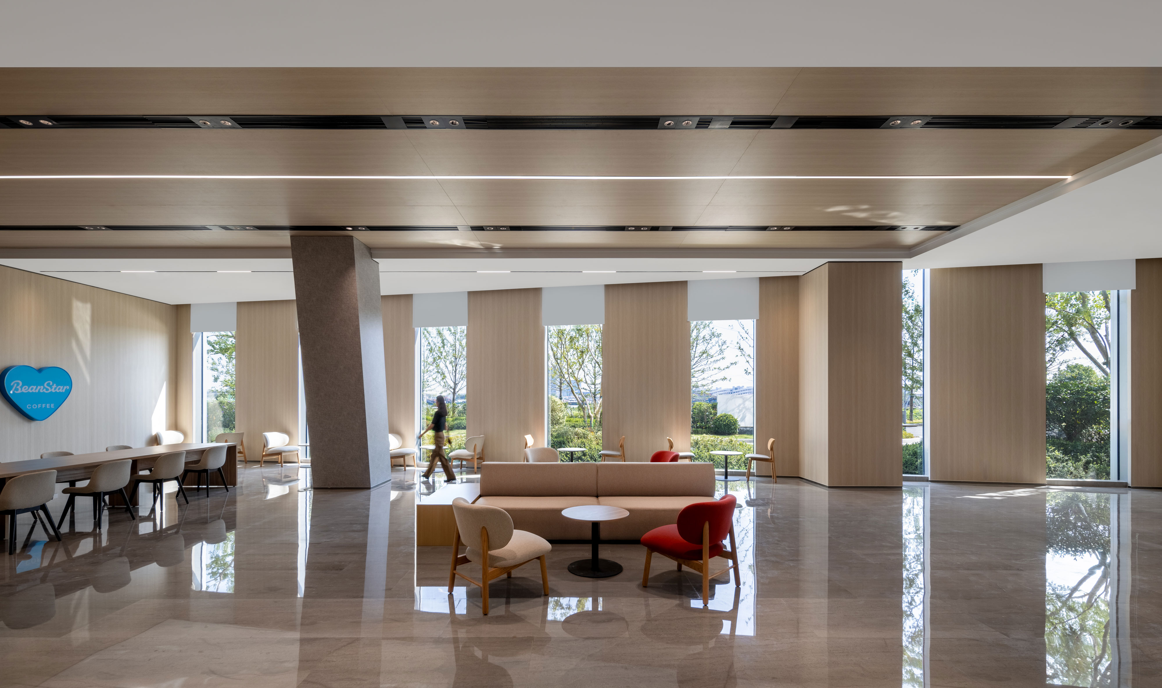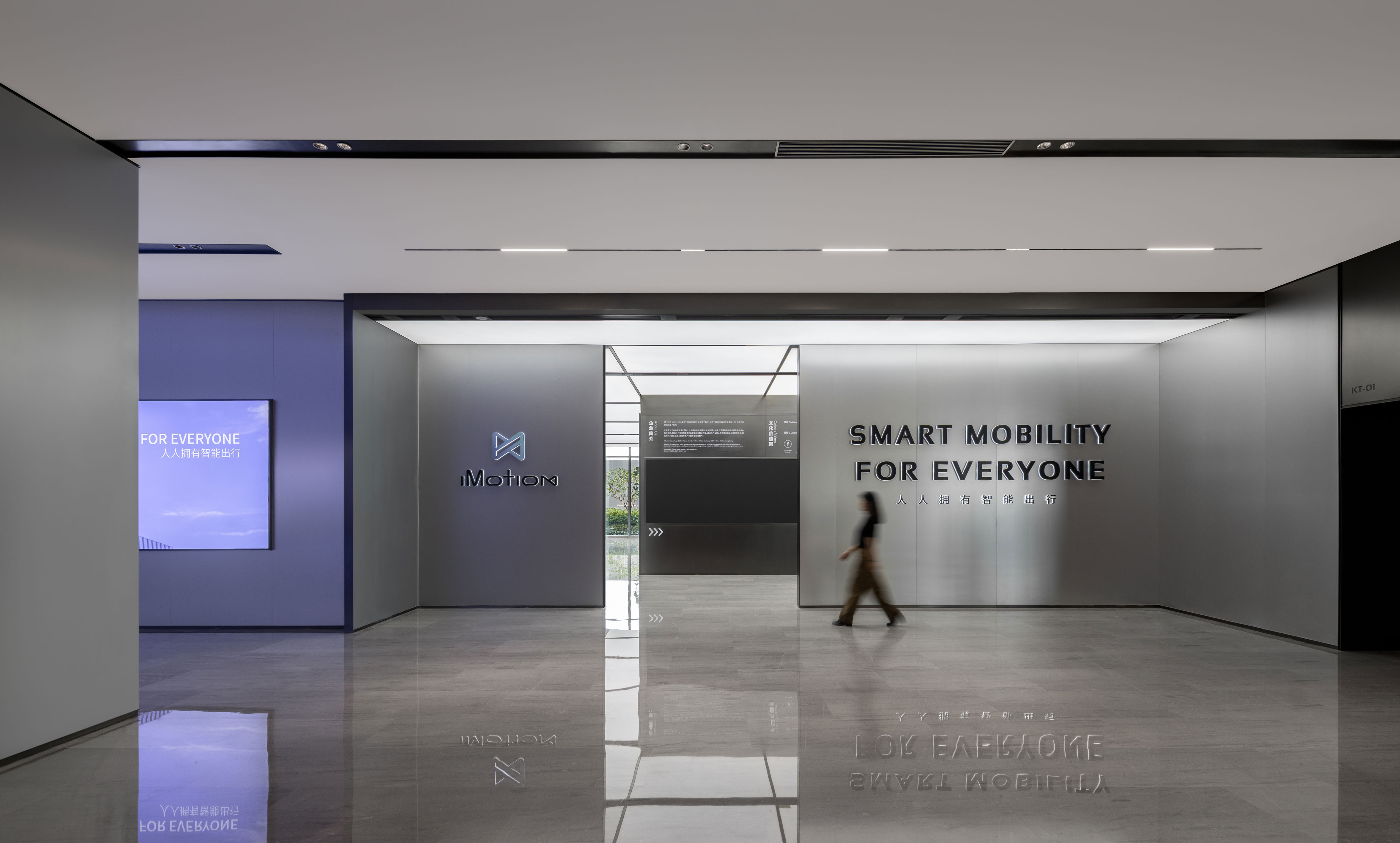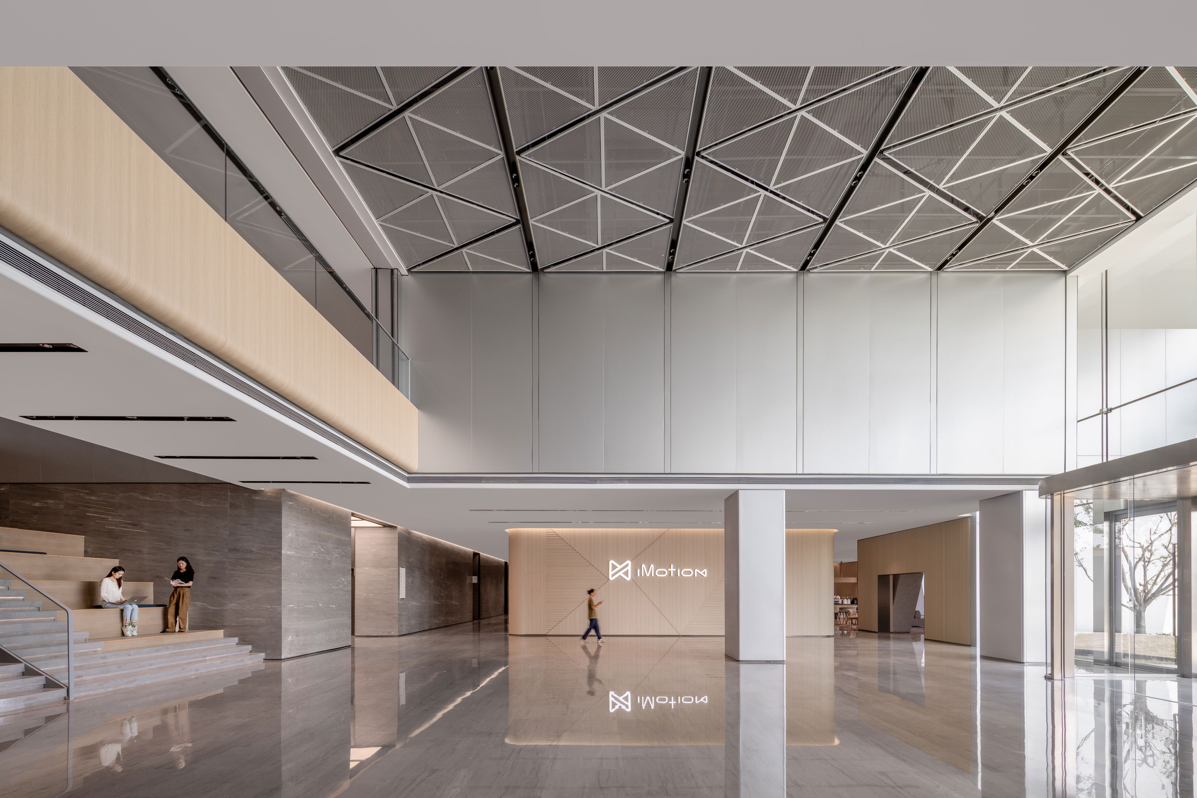 iMotion Technology (01274.HK) is a technology-driven enterprise distinguished by its advanced autonomous driving algorithms and outstanding integrated software-hardware capabilities. The company’s global headquarters is located on the banks of the Wusong River in Suzhou Industrial Park, with a total construction area of approximately 72,000 square meters. Among them, the 6,068-square-meter Cultural Center encompasses a digital exhibition hall, café, business reception area, library, and gym. The space planning and interior design were undertaken by Patton CMC, with the goal of enriching corporate culture and inspiring greater internal motivation among employees. The design fully leverages the building’s generous ceiling heights and riverside location to create an open and light-filled cultural environment. Public spaces are concentrated in the atrium areas between the 1st–3rd floors and 11th–13th floors. During the design consultation process, Patton CMC avoided superficial visual displays, instead allowing the brand’s DNA to naturally permeate both visitor and employee experiences. The digital exhibition hall, located on the northwest side of the first floor, features a luminous ceiling and marble flooring that together evoke a clean, high-tech atmosphere. The café, characterized by wood-grain aluminum panels complemented with greenery and warm lighting, offers a cozy and inviting “third space.” The leisure center on the second floor integrates reading, fitness, and psychological wellness functions, clearly separating active and quiet zones while maintaining spatial coherence, enhancing employees’ sense of happiness and belonging. The entire third floor serves as a business reception area, where a walnut wood palette creates a composed and elegant tone. The wine and cigar bar uses diverse materials to convey a refined business experience, while the Chinese private dining rooms emphasize privacy and acoustic comfort, with focused lighting that accentuates the presentation of cuisine and fosters a sophisticated dining ambiance.