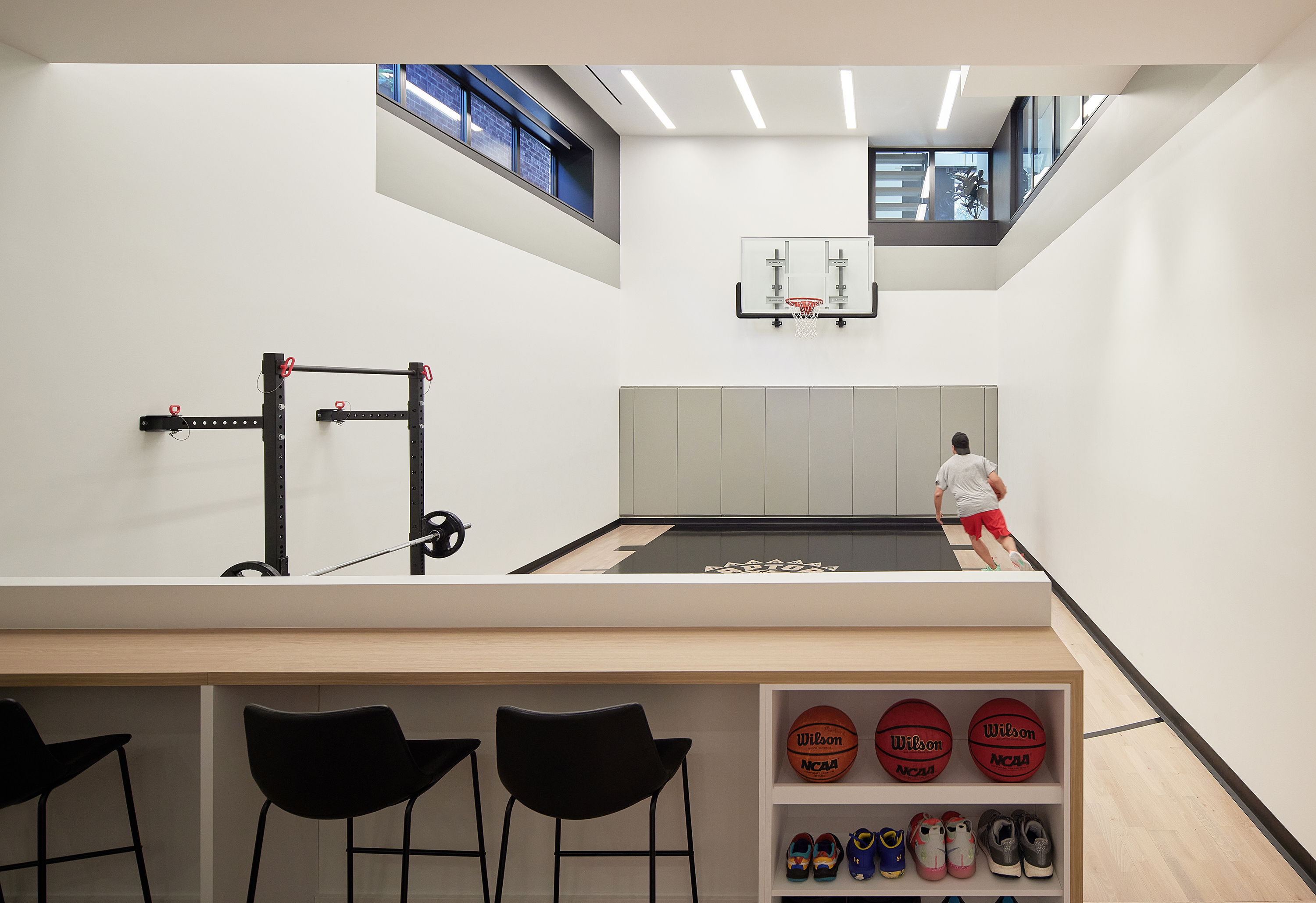 Mars House is a project that was sparked by the shifting demands brought on by the pandemic. It was meticulously designed to cater to a small family's evolving needs, while offering a tranquil retreat from the bustle of urban life. The design focuses on creating a harmonious balance between private and shared spaces, carefully tailored to support the family’s daily routines and foster a sense of connection. The home was conceived as a series of dynamic yet cohesive spaces, carefully organized to maximize efficiency and functionality. The primary catalyst of the design was the client's request for a basketball court and flexible gym space with 18 foot ceilings. In order to facilitate this on a moderately sized urban lot, a unique split level layout was implemented. This created a collection of spaces, each with its own distinct function, yet all interconnected to foster a sense of togetherness throughout the home. This interconnection of spaces is mirrored at the exterior, where interlocking volumes are arranged with the upper stories set back, creating a gentle transition from street level. The sense of movement is further emphasized by the rhythmically patterned black metal cladding, which is accentuated by warm wood siding and porcelain slabs. The design also carefully orchestrates a varied spatial experience as one moves through the home. Spaces are thoughtfully crafted to contract and expand, cultivating a feeling of intimacy in some areas while heightening the sense of openness in others. Natural light plays an important role in the quality of space and filters throughout Mars House via strategically placed windows and skylights. Expansive glazing and large oversized sliding doors extend the kitchen and dining areas onto a spacious deck, seamlessly integrating indoor and outdoor living.
