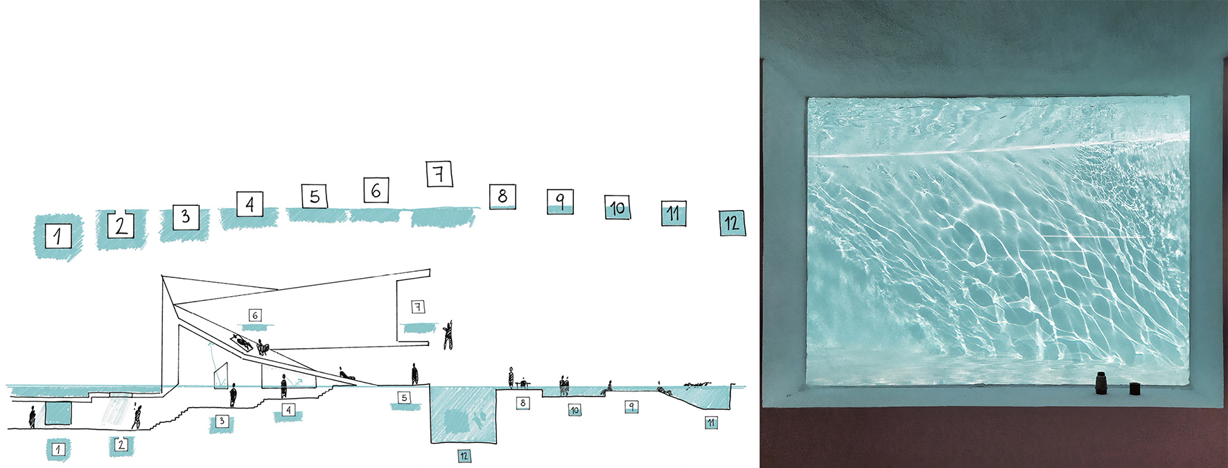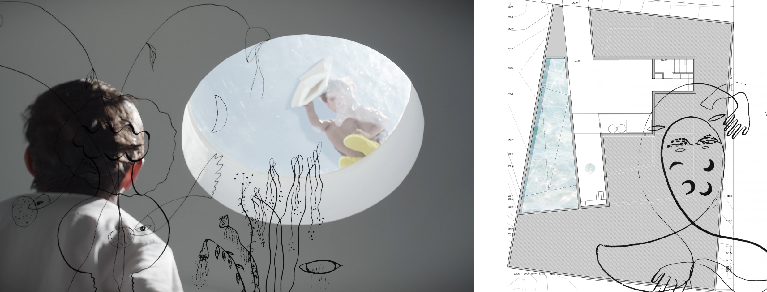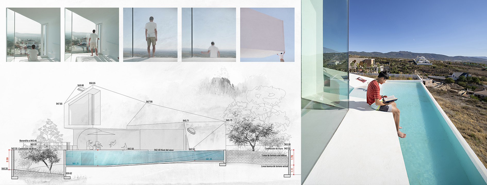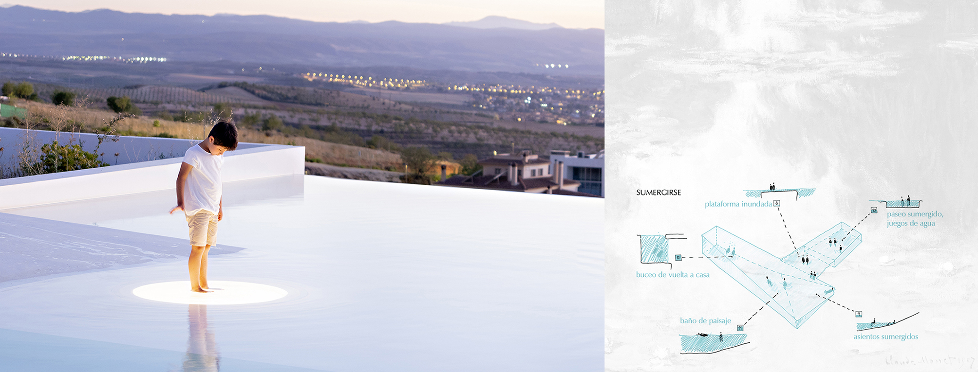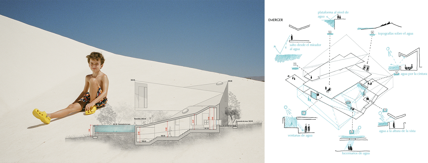 Piscina con Casa explores the possibilities of reimagining the relationship between water and the act of inhabiting. In this project, the house emerges from the water to create spaces that invite the inhabitant into a physical and sensory immersion. The proposal is understood as a tool for architectural research that comes to life through daily interaction and the user’s experience with a medium as fluid and symbolic as water. It encourages reflection on the role of design in creating meaningful and transcendent environments for people. The project proposes two complementary sequences. The experience of emerging begins underwater and ascends through the spaces of the house, where each room engages with the pool in a specific way. Various openings reveal glimpses of flooded patios and submerged skylights. Semi-sunken living areas, water-level windows, and exterior platforms shape a new topography of varying heights, offering unique relationships with both the water and the surrounding landscape. This path culminates in a raised lookout over the central flooded courtyard. The experience of submerging enables a direct connection with water. A shallow platform invites walking or resting, while a sloped zone allows the user to wade or submerge into the deeper areas of the pool, where one can swim, dive from the lookout, or contemplate the house through underwater windows. This layering of elements creates a rich and dynamic atmosphere, where the interplay of water, light, and architecture shifts throughout the day. The project also explores the intimate bond between its inhabitants and their environment, using water as a medium to enhance personal experience. By transforming the conventional domestic space into a personal retreat, water becomes a central element of daily life, prioritizing emotional and sensory connection, blurring the limits between inside and outside, and reconnecting with ancestral notions of inhabiting.