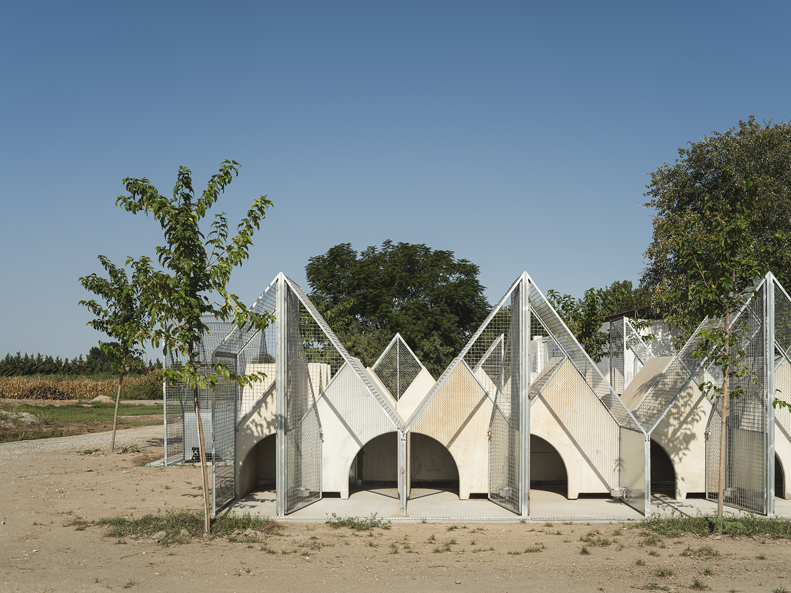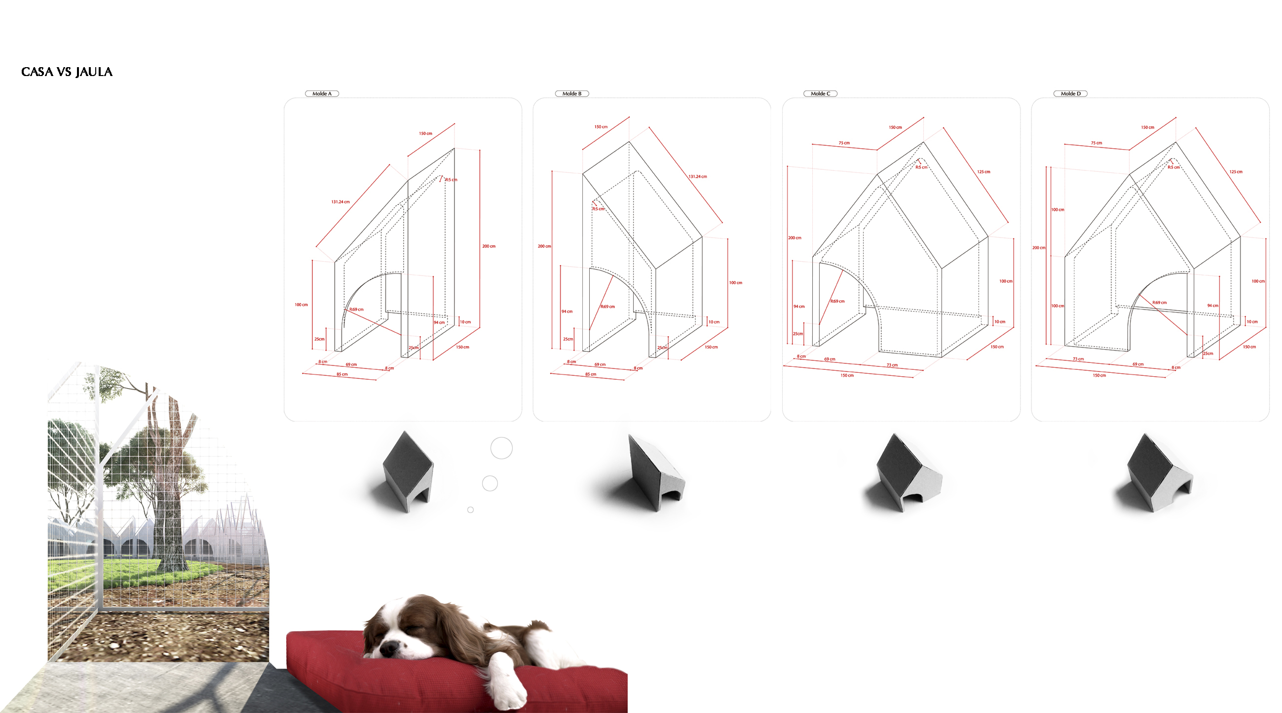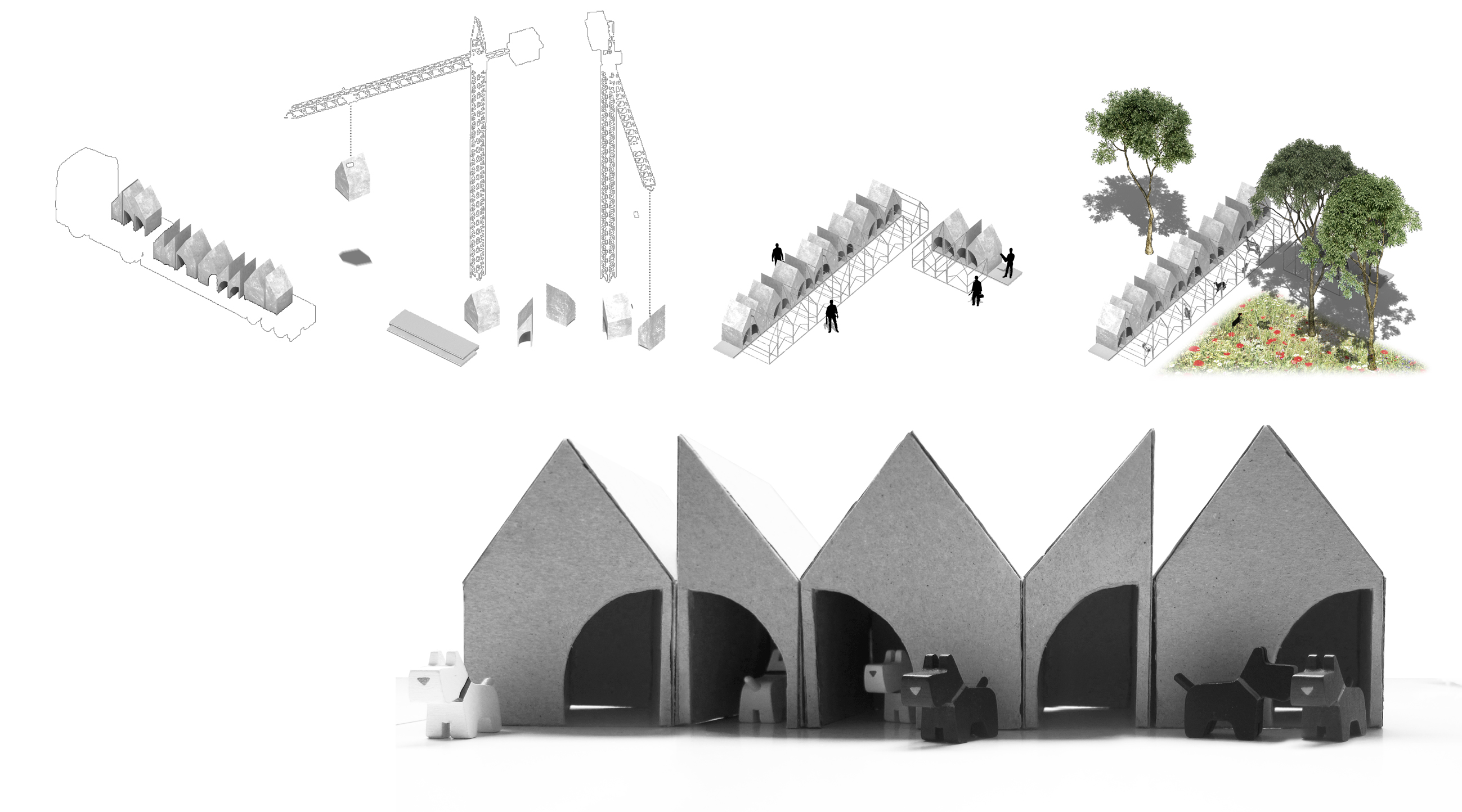City vs. Prison Many animal shelters prioritize cost efficiency, resulting in closed, oppressive environments with dark corridors and small cages that restrict animals’ freedom. Our proposal takes the opposite approach: instead of a prison, the shelter becomes a city, a place of life and interaction. The design is based on open, interconnected spaces that function like plazas, allowing animals to move, explore, and perceive their surroundings. Visitors can observe them directly, encouraging empathy and connection. Although these spaces are visually open, access to them is controlled and managed by staff to ensure safety. Dogs rotate through different areas depending on their needs and conditions, allowing them to enjoy the outdoors and enriched environments whenever possible. This system supports not only physical well-being but also socialization and emotional vitality. Home vs. Cage To replace traditional metal or brick enclosures that confine animals, we introduce prefabricated modular dog homes, inspired by the familiar “doghouse” as a symbol of shelter and belonging. These repeatable modules allow efficient mass production, easy reconfiguration, and adaptation over time. The shelter becomes a flexible organism that can grow and reorganize based on demand and population changes. The construction system uses reinforced precast concrete, made from a single mold with small variations to create different piece types. This enables economical expansion and straightforward rearrangement of kennels and enclosures. Combined with outdoor yards, the modules form a network of small “homes” that together create a dog city—a community rather than confinement. Modularity and Flexibility Light galvanized steel frames with welded wire mesh are used to form partitions, access points, and outdoor yards. With only four frame types, numerous spatial configurations are possible. Each dog can have an individual shelter plus an exterior area, ensuring mobility, stimulation, and a sense of place.