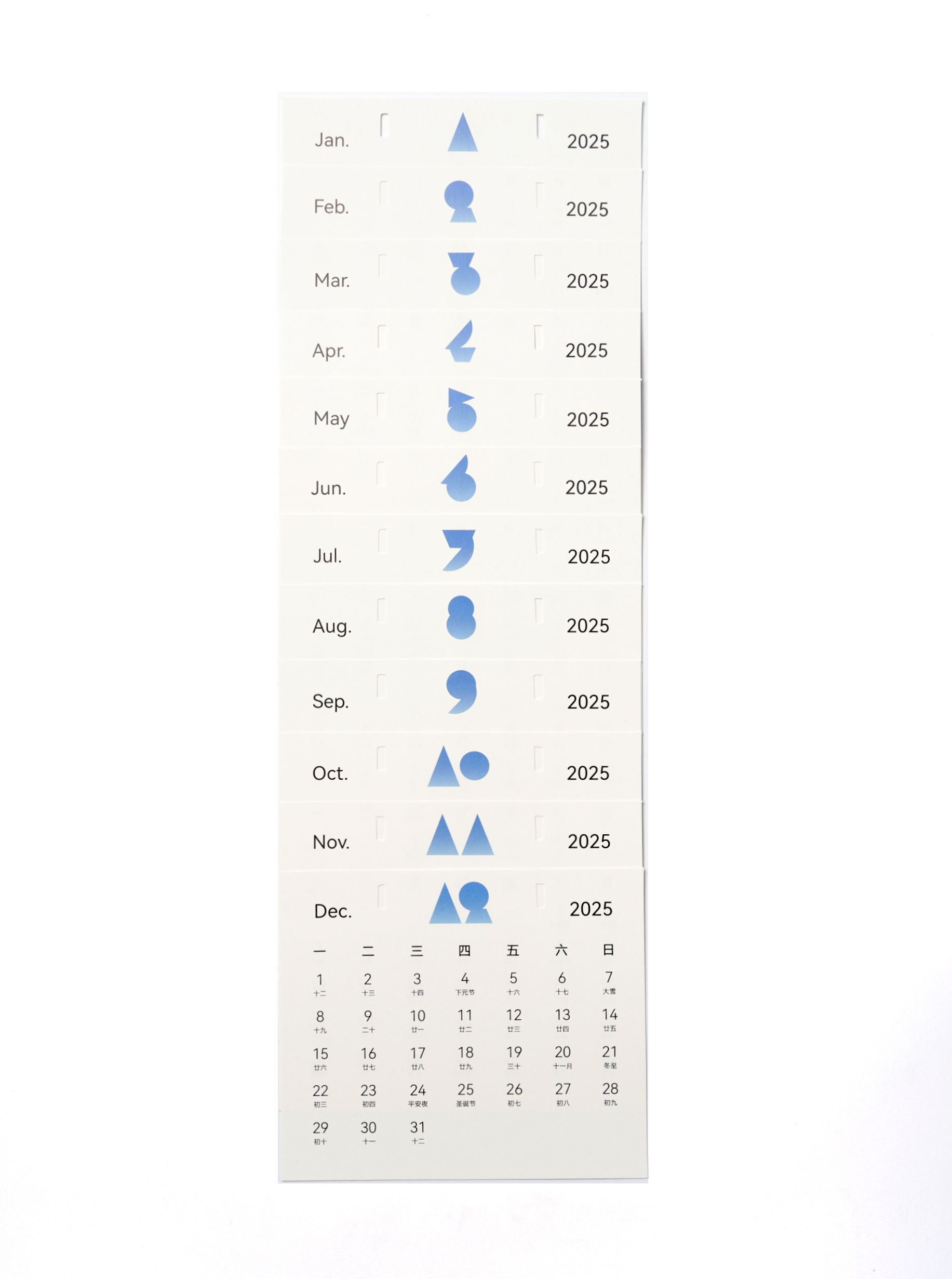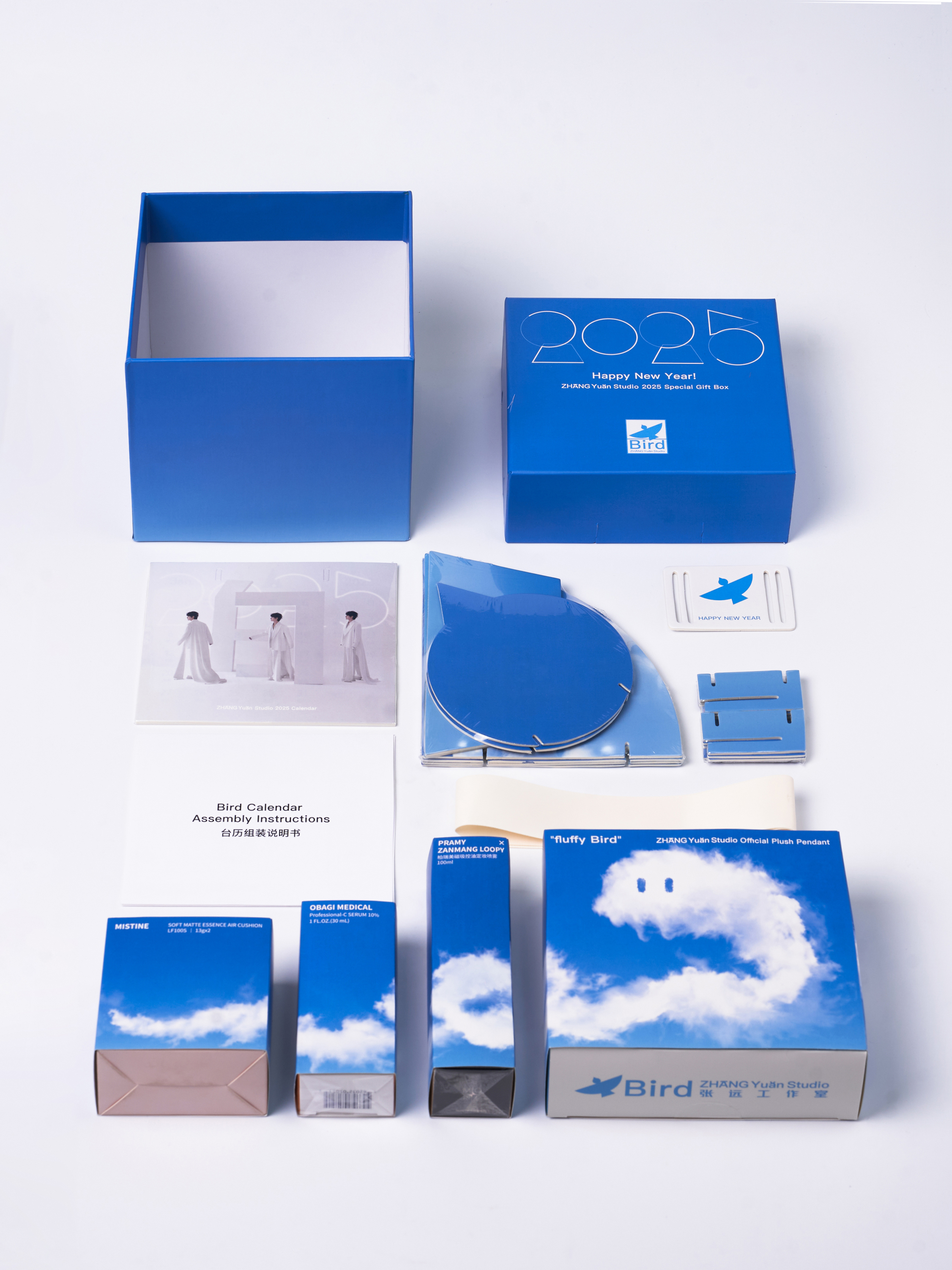 At the end of 2024, the design team was commissioned by ZHANGYUAN Studio to create the concept, visual identity, and packaging design for its 2025 New Year gift box. The design beautifully features a bird as its core visual symbol, embodying the essence of ZHANGYUAN Studio. Inside, the box holds a 2025 calendar along with a thoughtfully curated selection of branded products. The structure adopts a square telescopic lid-and-base format, transforming from a 16 cm cube into the majestic silhouette of a soaring bird with a wingspan of half a meter. Inspired by the geometric elements of the bird icon, the design team crafted a unique set of Arabic numerals for displaying the year and months. The calendar hangs from a dedicated hook at the center of the box, allowing for easy replacement and display. Color serves as a powerful defining element: inspired by the azure sky, the bird's two sides exhibit contrasting expressions of clarity—Drifting Clouds on one side and Crystal Blue on the other—enabling users to customize it to match their personal preferences. More than a festive object, the gift box carries profound symbolic meaning. Just as ZHANGYUAN illuminates his audience, the bird represents hope and courage, encouraging recipients to embrace clarity and strength in the face of uncertainty and challenges. Dimensions Folded: 17.5 × 16.5 × 15.5 cm Expanded: 50 × 40 × 6 cm